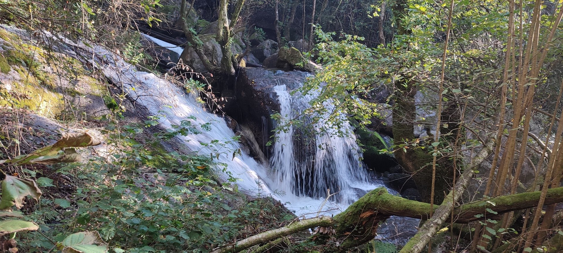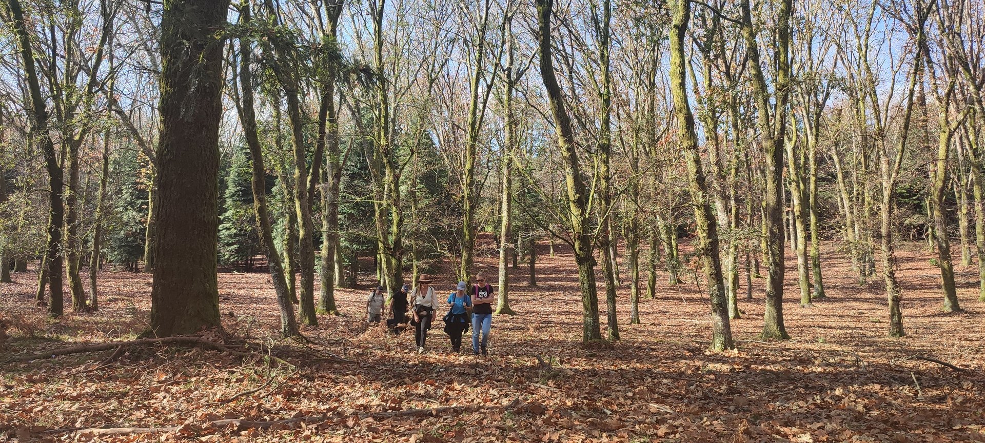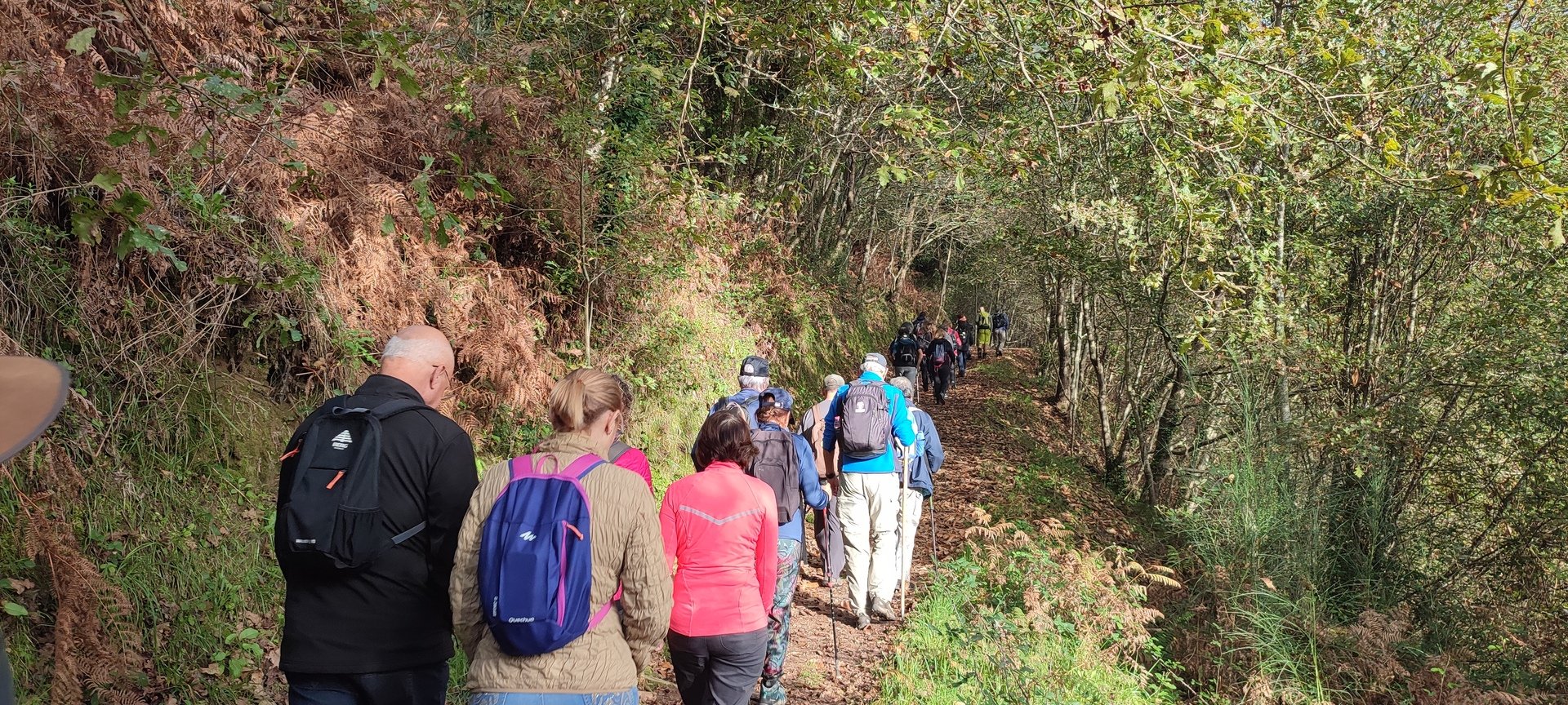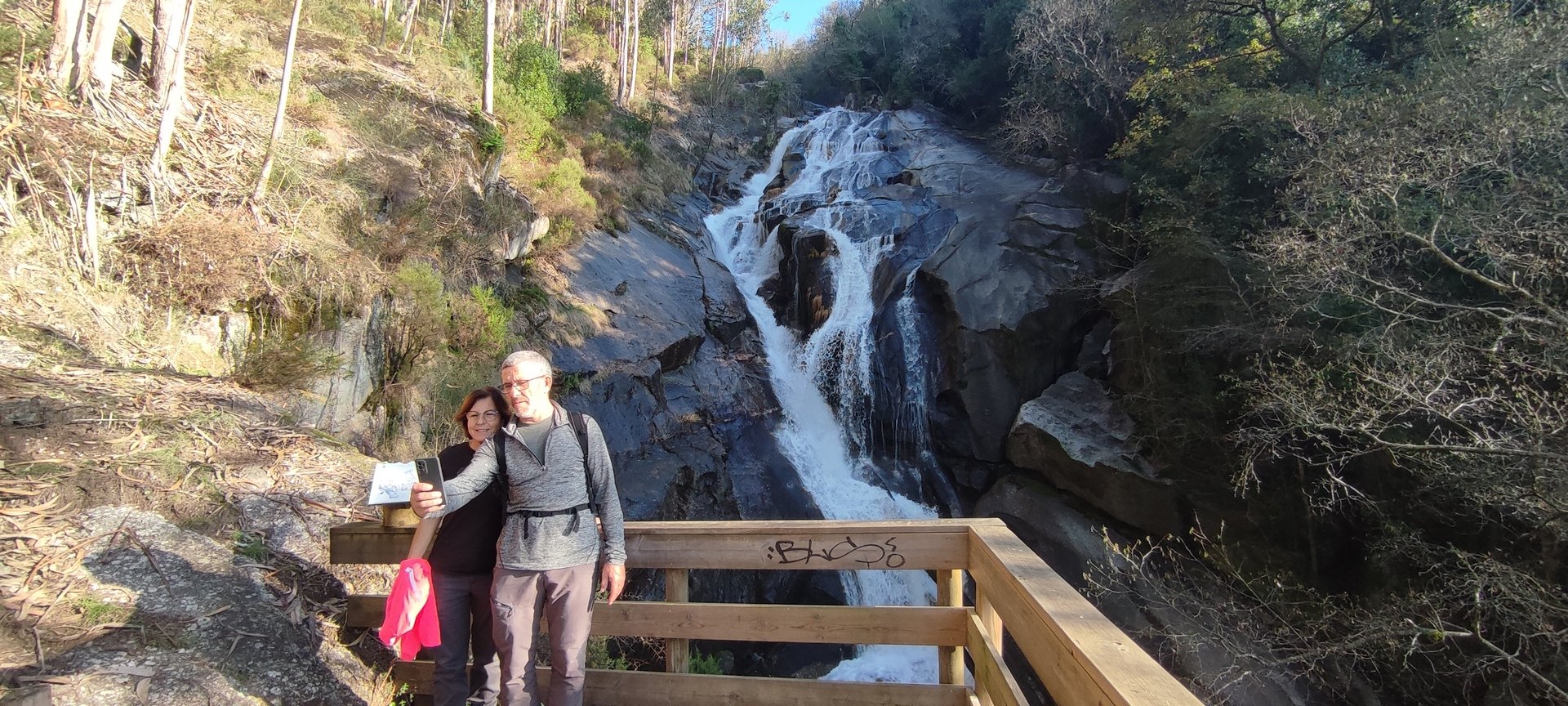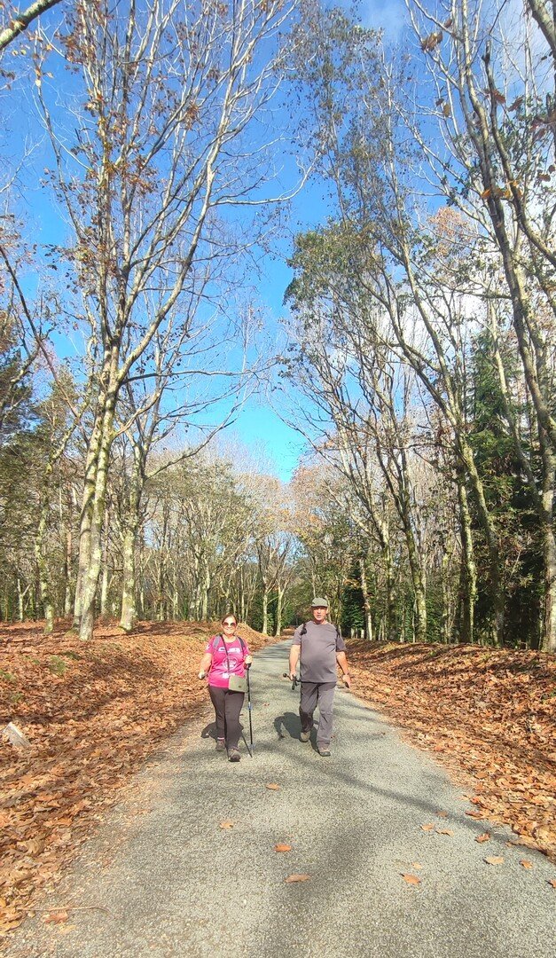 Iniciado o percurso lá fomos ao encontro dos passadiços e cascatas do pequeno Rio Cabrão que logo nos foi presenteando com bonitos recantos e sucessivas quedas de água, parando de quando em vez para obtenção de registos fotográficos. Atingido o final dos passadiços local com um extraordinário miradouro onde cada um pode admirar a bela cascata, logo começamos a abandonar o rio, continuando a subir através de um ingreme carreiro devidamente protegido e que bastante nos auxiliou. Mais acima chegamos a um caminho florestal, por onde caminhamos um pouco no sentido inverso, na busca de um desvio que se tornou um pouco difícil de encontrar. Sempre embrenhados na floresta continuando subindo através de um estreito, mas bonito carreiro, atingimos o lugar de Vaqueira, onde houve um pouco de tempo para se falar com alguns naturais e fazer um ligeiro reabastecimento. A vista para Norte era bonita com a encosta da serra semeada de pequenos aglomerados de habitações, para poente oportunidade para divisar o lugar de Vacariça já várias vezes por nós visitado. Continuamos novamente subindo embrenhados na floresta até se atingir o ponto mais elevado do nosso percurso na denominada “Poça do Couto”, belo local muito procurado para início de várias atividades. Na altura outro grupo de caminheiros abandonava as viaturas iniciando o seu percurso em direção de Miranda. O nosso caminho era penetrar agora através da mata da “floresta encantada”, pisando o grosso tapete das folhas caídas, nesta altura do ano um pouco despida, mas que nem por isso deixa de ter grande beleza. Aqui encontramos a companheira Isabel Sequeiros que integrada numa organização da Câmara de Arcos de Valdevez andava na recolha de cogumelos.