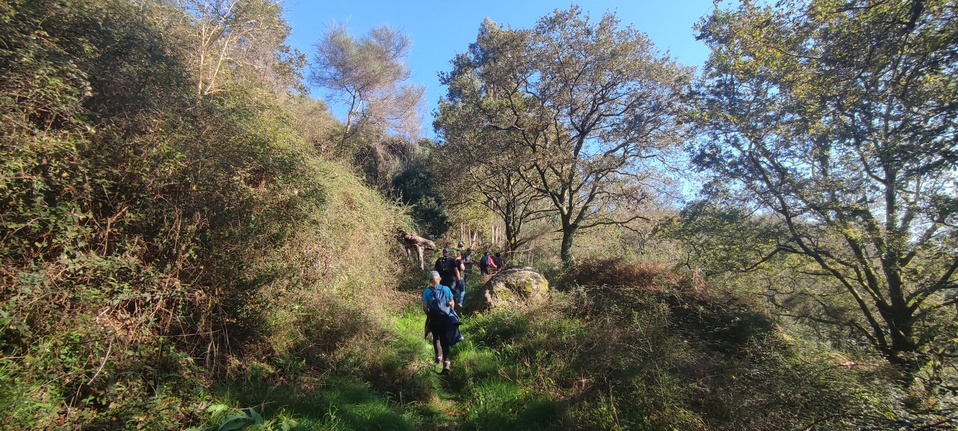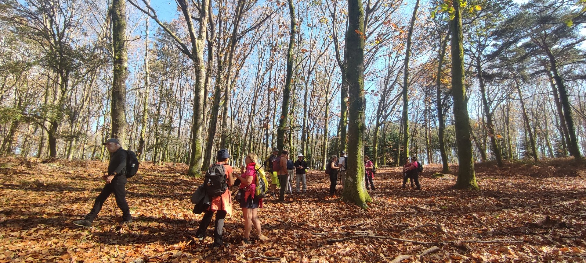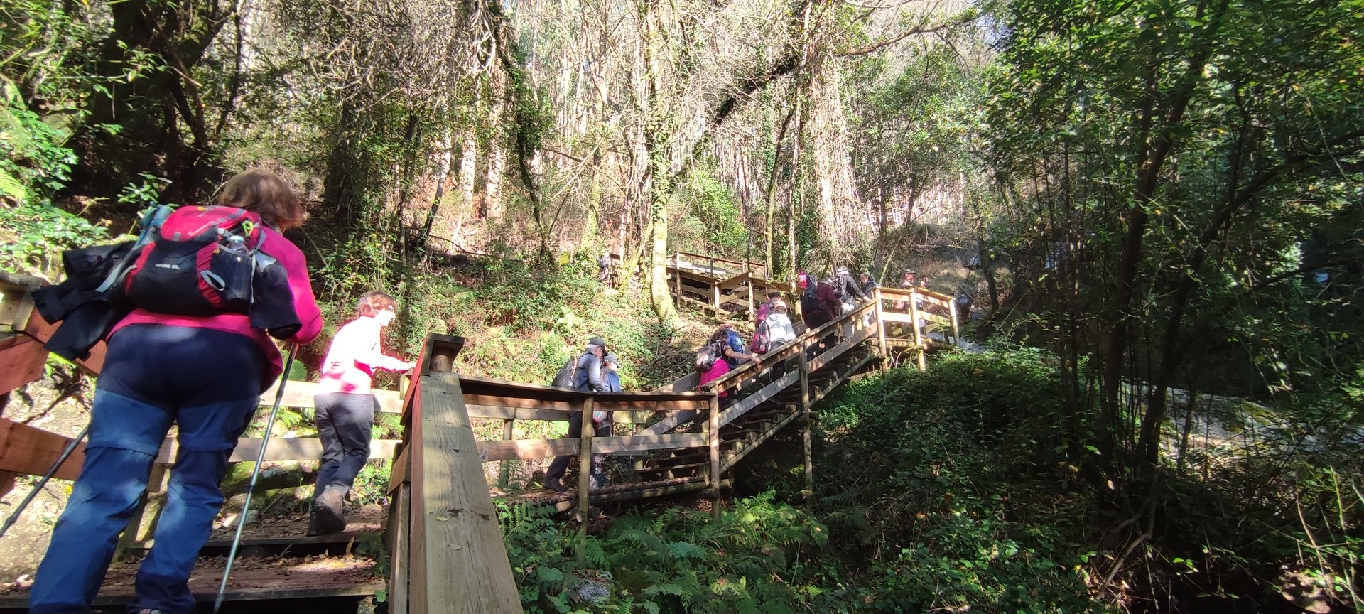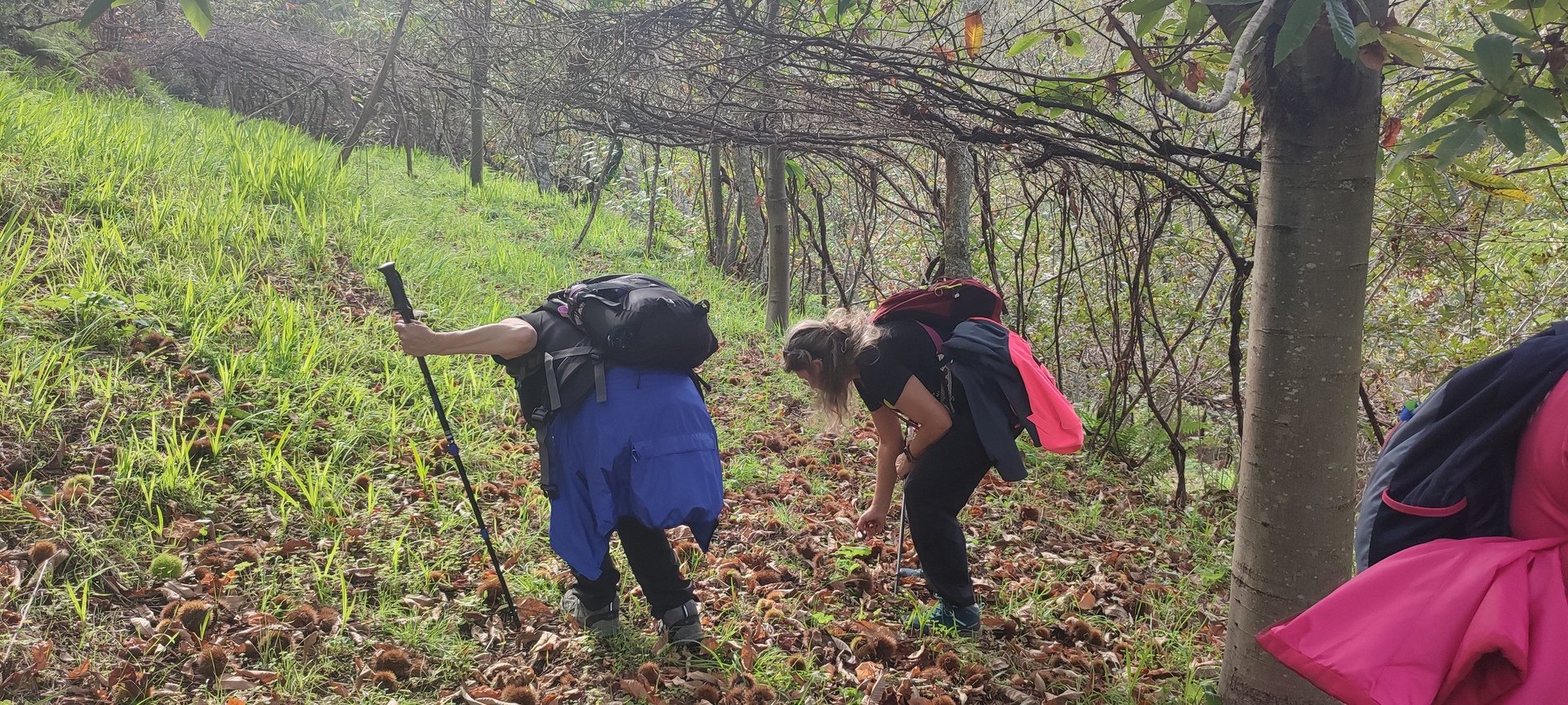 Iniciado o percurso lá fomos ao encontro dos passadiços e cascatas do pequeno Rio Cabrão que logo nos foi presenteando com bonitos recantos e sucessivas quedas de água, parando de quando em vez para obtenção de registos fotográficos. Atingido o final dos passadiços local com um extraordinário miradouro onde cada um pode admirar a bela cascata, logo começamos a abandonar o rio, continuando a subir através de um ingreme carreiro devidamente protegido e que bastante nos auxiliou. Mais acima chegamos a um caminho florestal, por onde caminhamos um pouco no sentido inverso, na busca de um desvio que se tornou um pouco difícil de encontrar. Sempre embrenhados na floresta continuando subindo através de um estreito, mas bonito carreiro, atingimos o lugar de Vaqueira, onde houve um pouco de tempo para se falar com alguns naturais e fazer um ligeiro reabastecimento. A vista para Norte era bonita com a encosta da serra semeada de pequenos aglomerados de habitações, para poente oportunidade para divisar o lugar de Vacariça já várias vezes por nós visitado. Continuamos novamente subindo embrenhados na floresta até se atingir o ponto mais elevado do nosso percurso na denominada “Poça do Couto”, belo local muito procurado para início de várias atividades. Na altura outro grupo de caminheiros abandonava as viaturas iniciando o seu percurso em direção de Miranda. O nosso caminho era penetrar agora através da mata da “floresta encantada”, pisando o grosso tapete das folhas caídas, nesta altura do ano um pouco despida, mas que nem por isso deixa de ter grande beleza. Aqui encontramos a companheira Isabel Sequeiros que integrada numa organização da Câmara de Arcos de Valdevez andava na recolha de cogumelos.