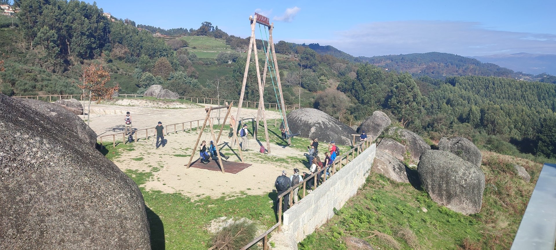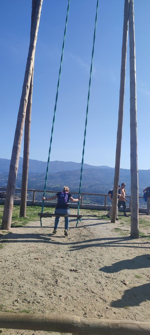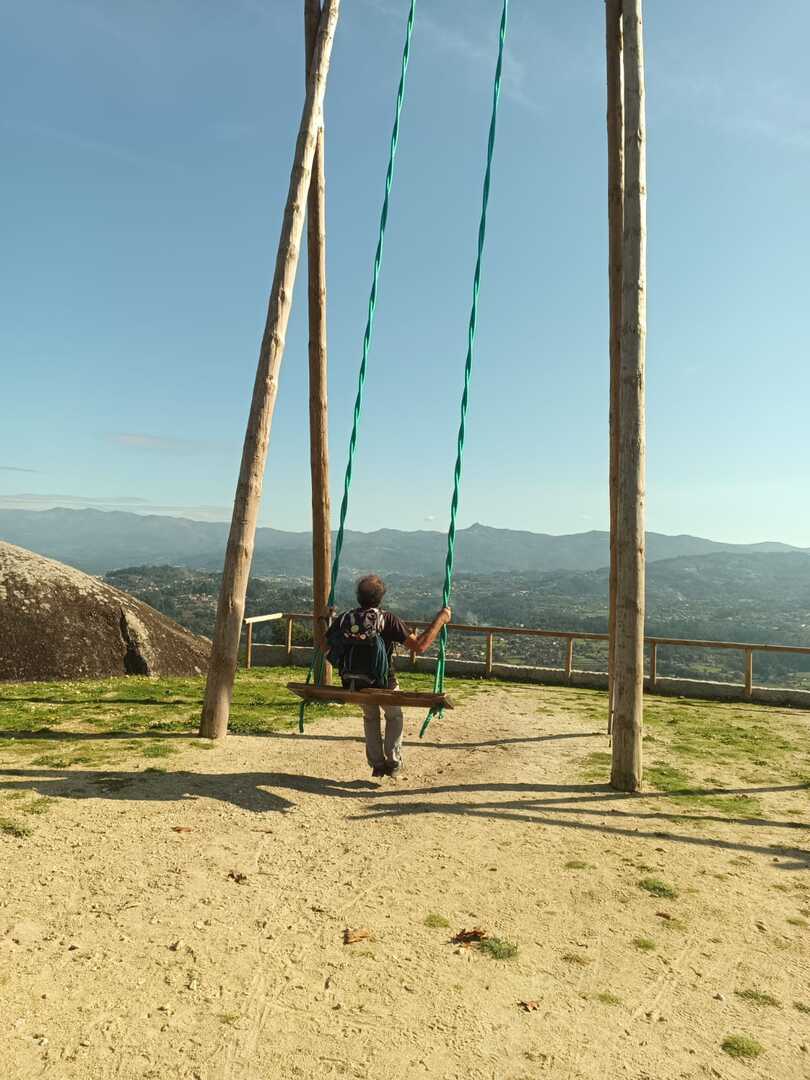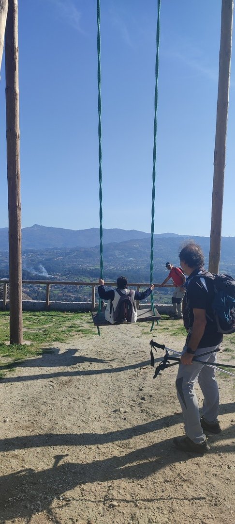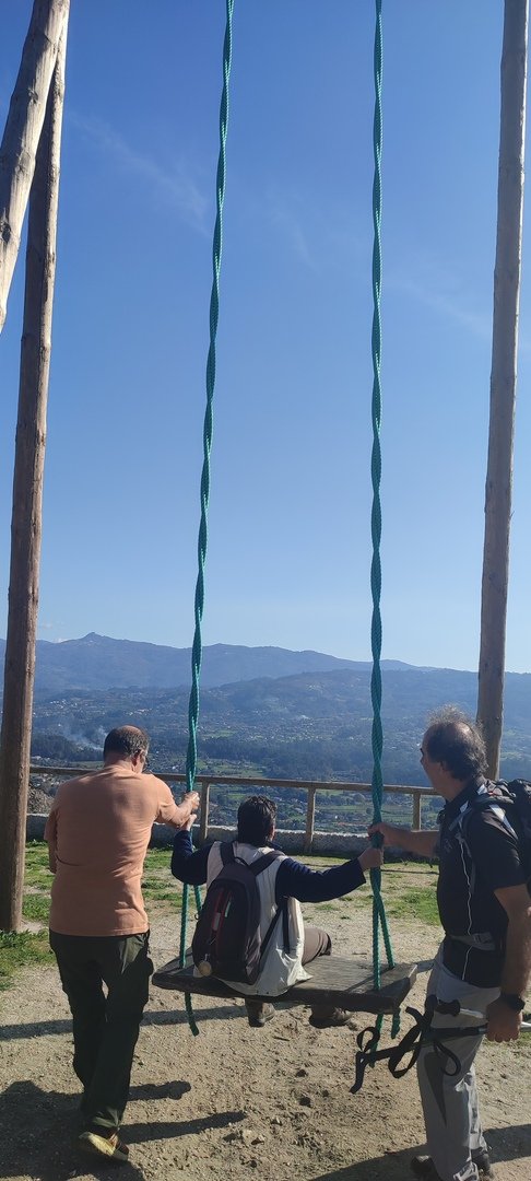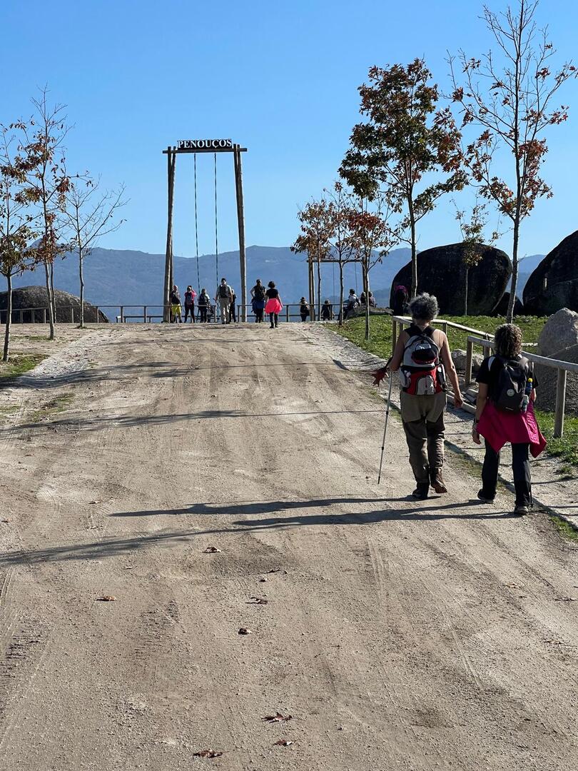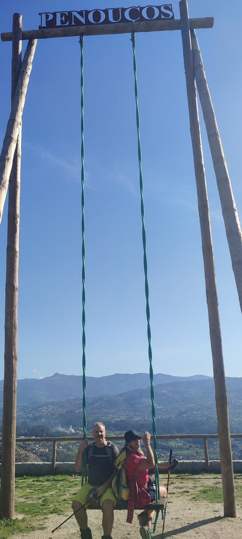 Regressados à Poça do Couto, iniciamos a descida do no nosso percurso, pois havia que controlar as horas para o almoço convívio de S. Martinho. Cruzamos os lugares de Fonte, Balouta e Outeiro pertencentes a Padreiro (Sta. Cristina), belos miradouros para o vale do Lima e mais além ainda, locais bem arranjados com uma exposição solar excelente, bem protegidos dos ventos Norte. Um pouco mais abaixo lá fomos ao encontro do Miradoiro e Baloiços de Penouços instalados num miradouro de grande extensão de onde a vista se perde pelo vale do Lima. Aqui houve um pouco de tempo para “balouçar” e as respetivas fotos de registo. Mas havia que continuar, pois o controle das horas assim o obrigava, mas eis que toca o telemóvel e uma parte do grupo tinha seguido por caminhos errados. Após breve conversa lá ficou combinado que continuariam seguindo por caminhos diferentes até ao objetivo final. Nós, após breve conferência também optamos por seguir por outro caminho, encurtando um pouco a dificuldade, mas retomando o percurso um pouco mais abaixo no lugar de Portela, por onde através de um estreito mas bonito carreiro, fomos descendo até atingir a estrada no local onde havíamos iniciado esta nossa pequena aventura, e onde já se encontravam os outros.