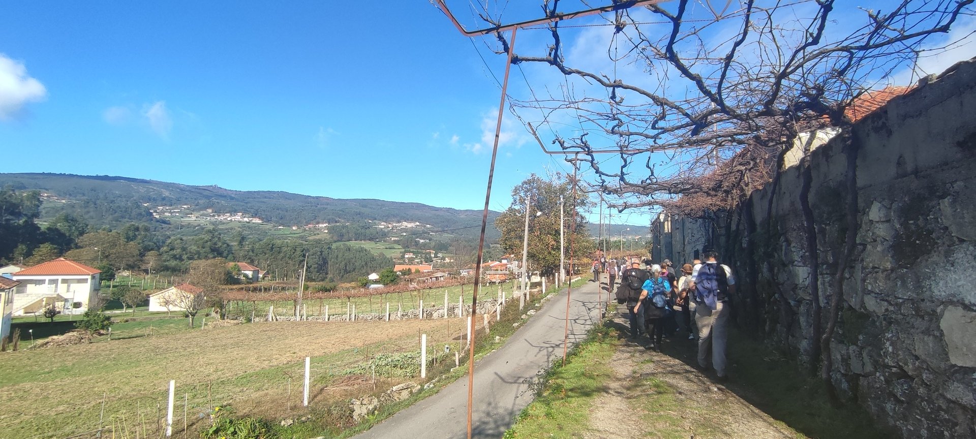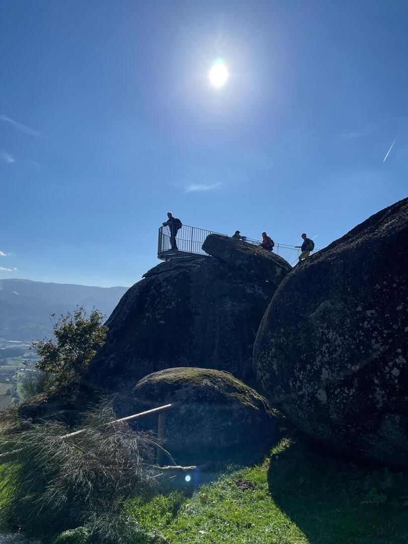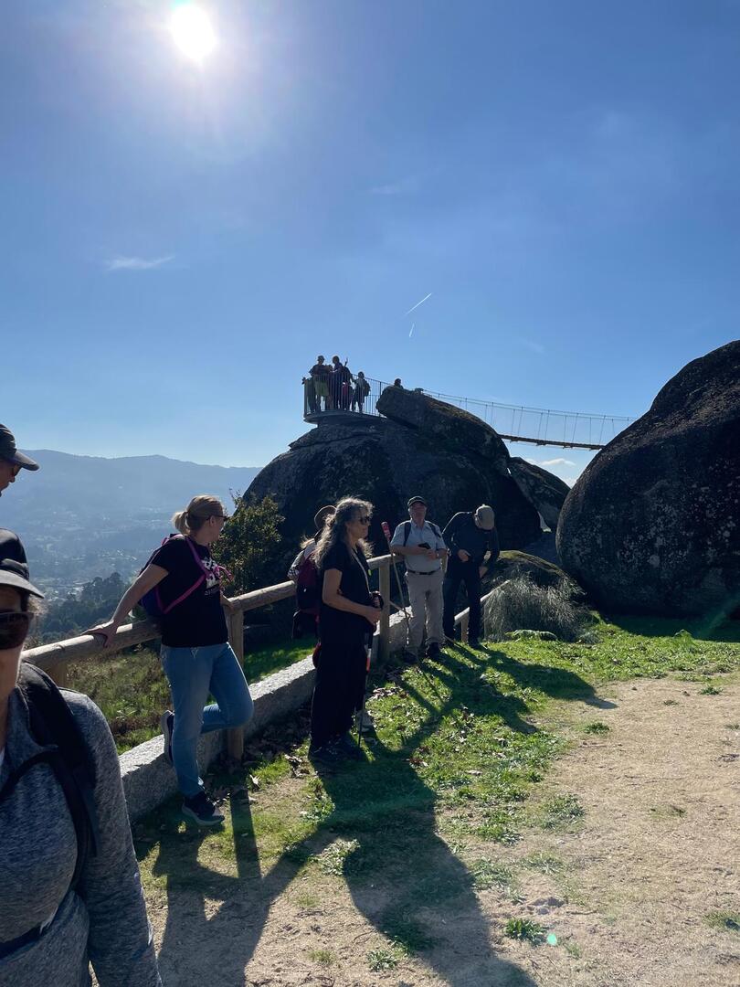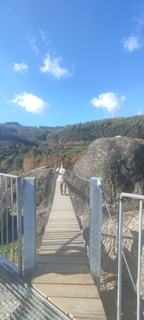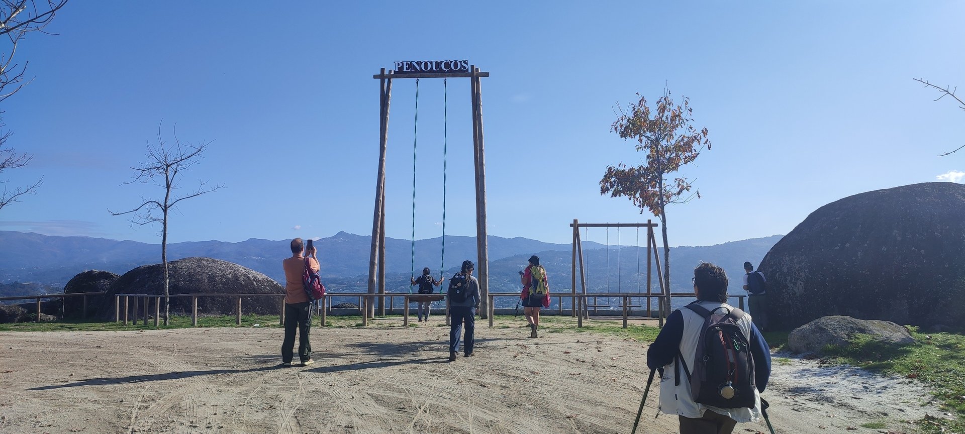Regressados à Poça do Couto, iniciamos a descida do no nosso percurso, pois havia que controlar as horas para o almoço convívio de S. Martinho. Cruzamos os lugares de Fonte, Balouta e Outeiro pertencentes a Padreiro (Sta. Cristina), belos miradouros para o vale do Lima e mais além ainda, locais bem arranjados com uma exposição solar excelente, bem protegidos dos ventos Norte. Um pouco mais abaixo lá fomos ao encontro do Miradoiro e Baloiços de Penouços instalados num miradouro de grande extensão de onde a vista se perde pelo vale do Lima. Aqui houve um pouco de tempo para “balouçar” e as respetivas fotos de registo. Mas havia que continuar, pois o controle das horas assim o obrigava, mas eis que toca o telemóvel e uma parte do grupo tinha seguido por caminhos errados. Após breve conversa lá ficou combinado que continuariam seguindo por caminhos diferentes até ao objetivo final. Nós, após breve conferência também optamos por seguir por outro caminho, encurtando um pouco a dificuldade, mas retomando o percurso um pouco mais abaixo no lugar de Portela, por onde através de um estreito mas bonito carreiro, fomos descendo até atingir a estrada no local onde havíamos iniciado esta nossa pequena aventura, e onde já se encontravam os outros.
