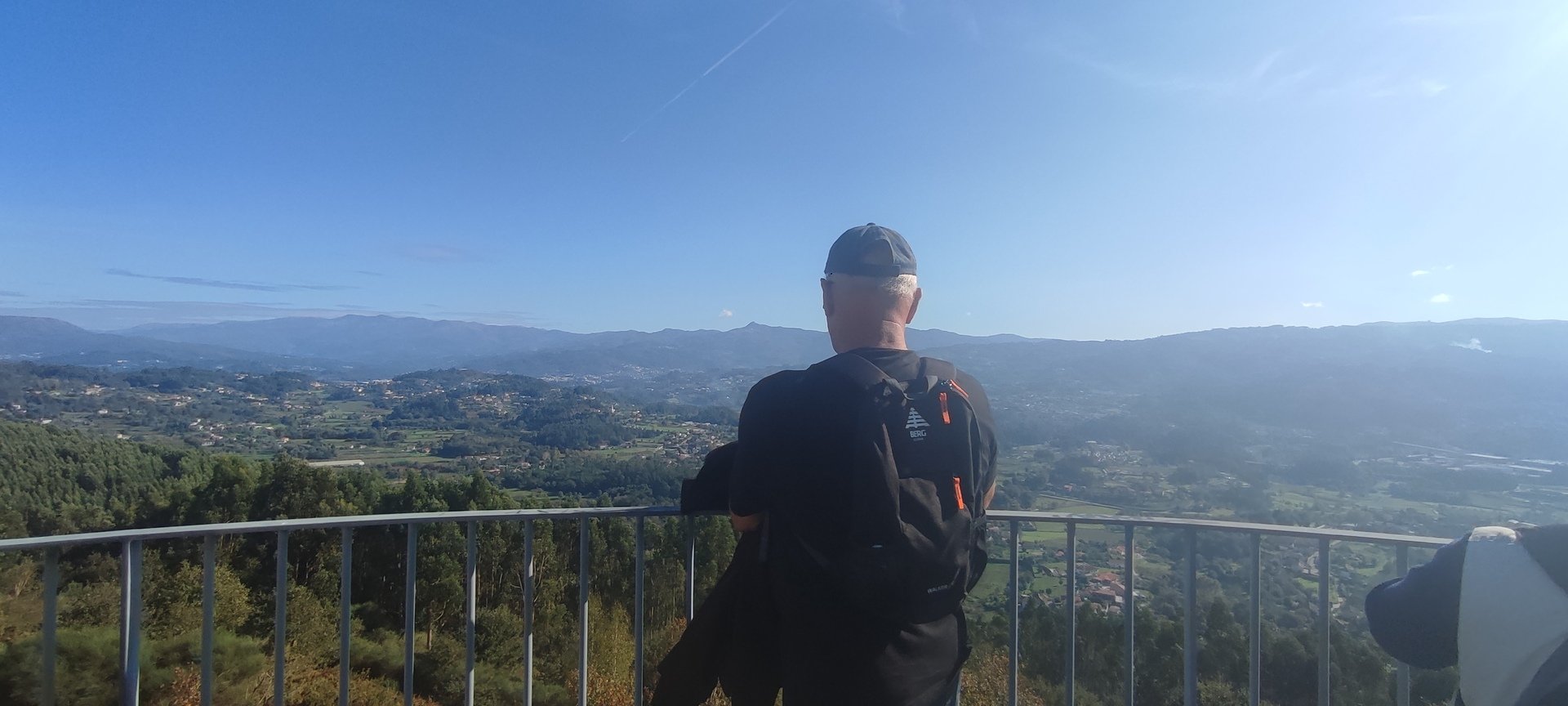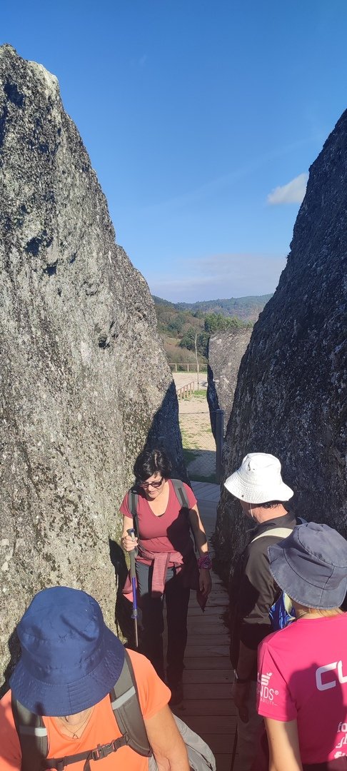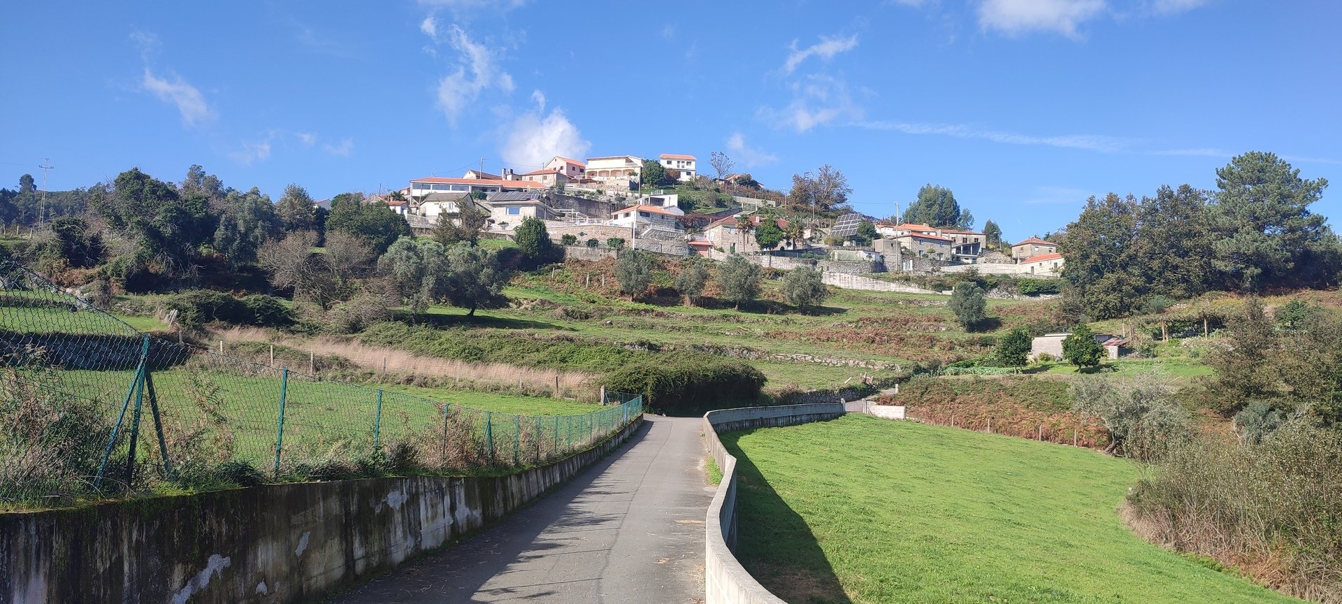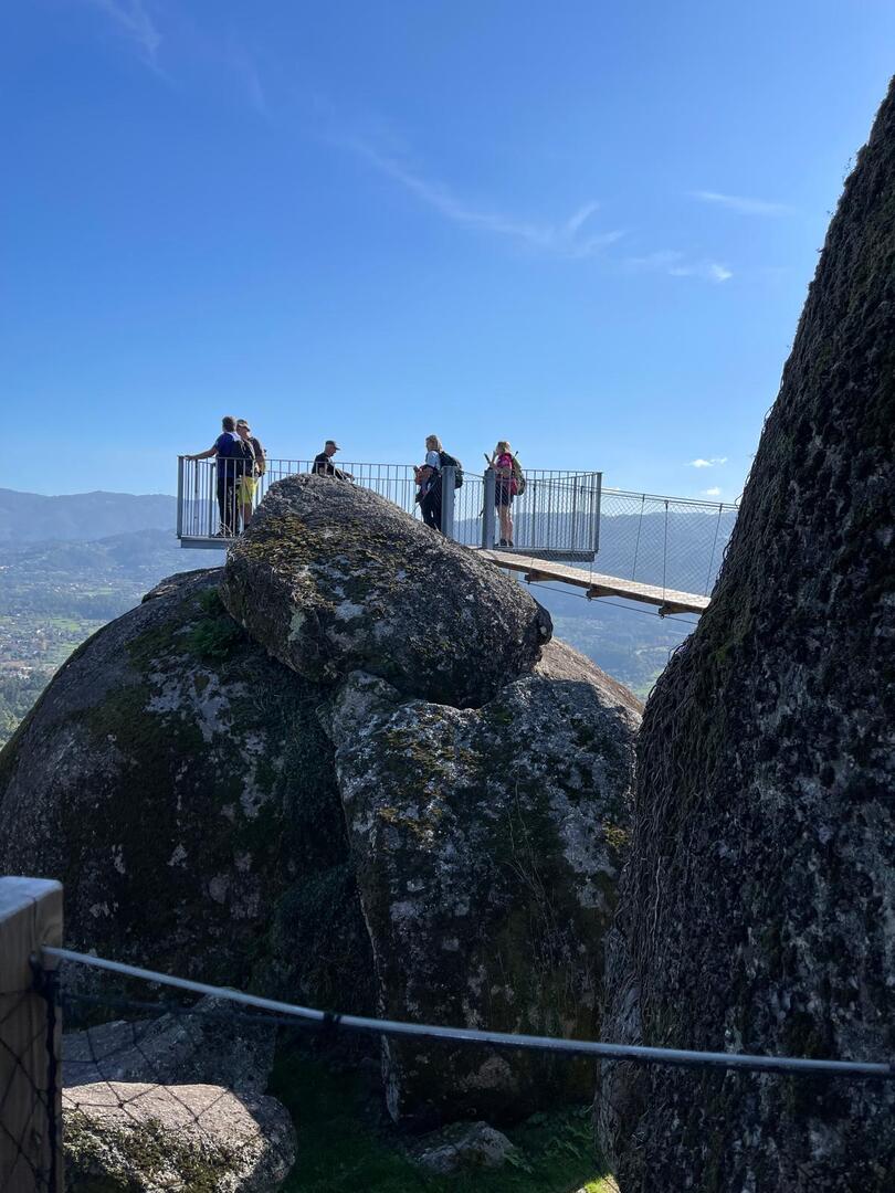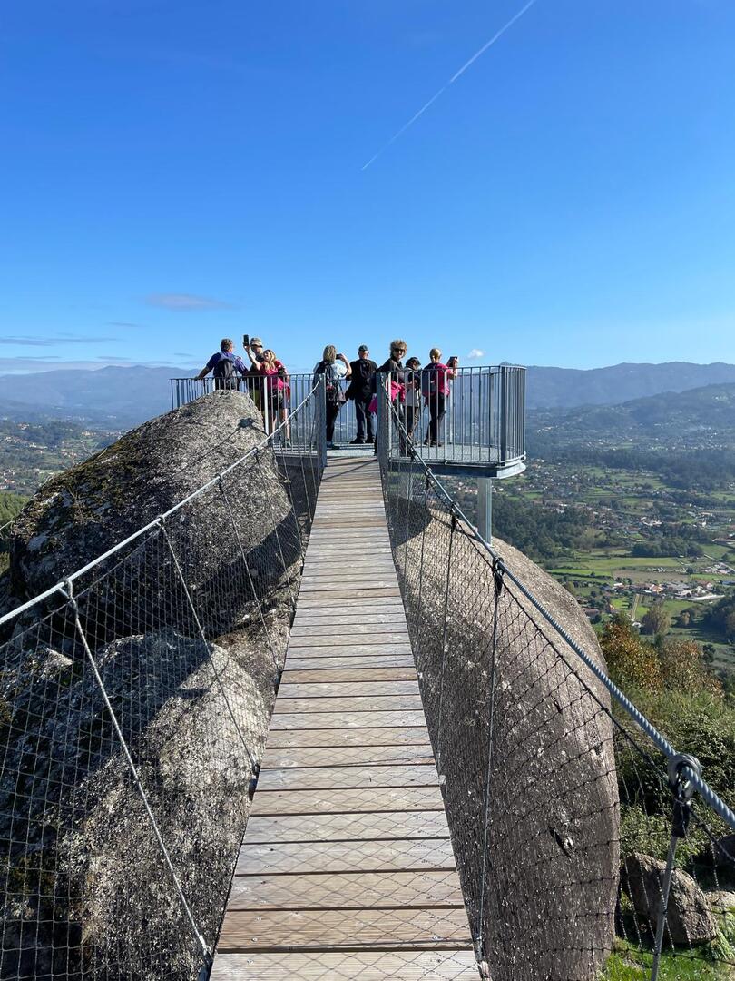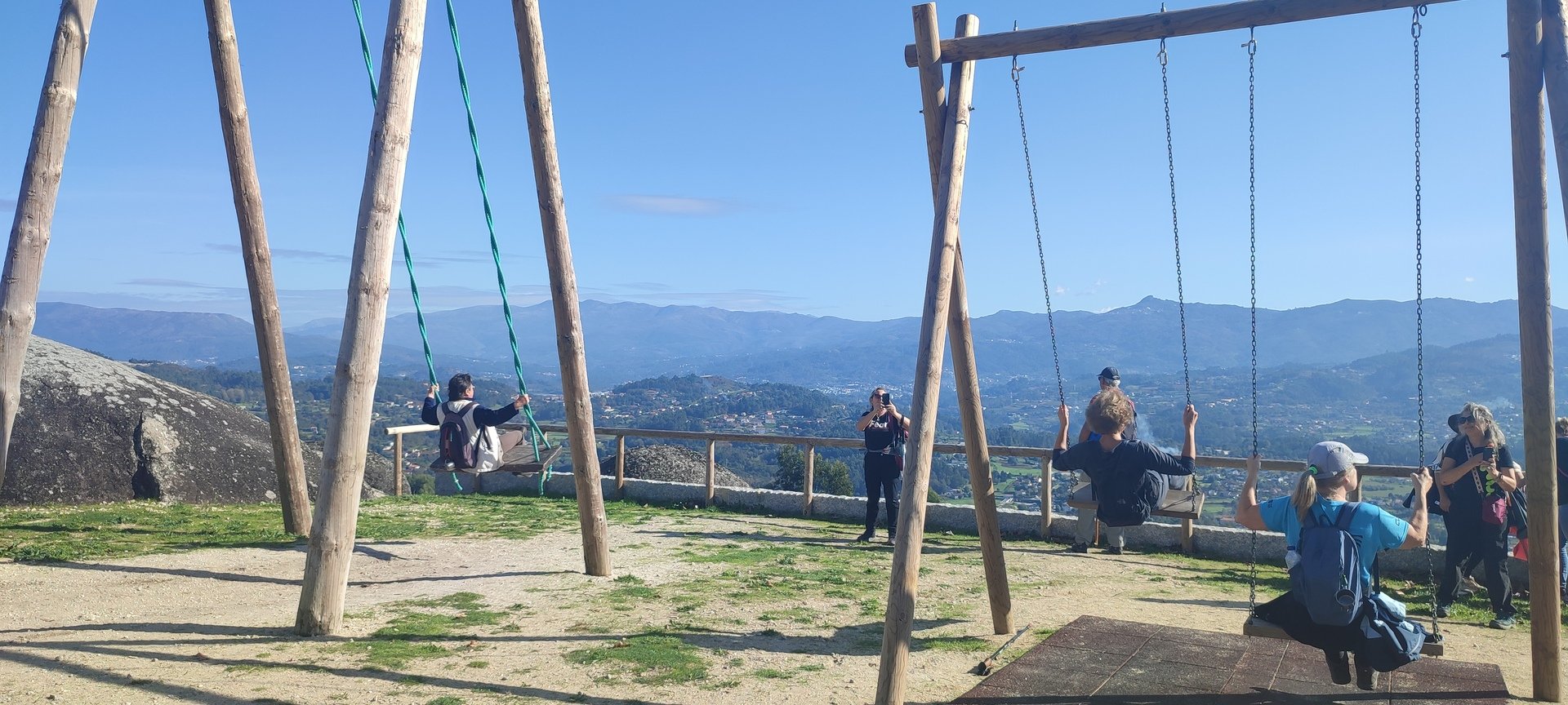 Regressados à Poça do Couto, iniciamos a descida do no nosso percurso, pois havia que controlar as horas para o almoço convívio de S. Martinho. Cruzamos os lugares de Fonte, Balouta e Outeiro pertencentes a Padreiro (Sta. Cristina), belos miradouros para o vale do Lima e mais além ainda, locais bem arranjados com uma exposição solar excelente, bem protegidos dos ventos Norte. Um pouco mais abaixo lá fomos ao encontro do Miradoiro e Baloiços de Penouços instalados num miradouro de grande extensão de onde a vista se perde pelo vale do Lima. Aqui houve um pouco de tempo para “balouçar” e as respetivas fotos de registo. Mas havia que continuar, pois o controle das horas assim o obrigava, mas eis que toca o telemóvel e uma parte do grupo tinha seguido por caminhos errados. Após breve conversa lá ficou combinado que continuariam seguindo por caminhos diferentes até ao objetivo final. Nós, após breve conferência também optamos por seguir por outro caminho, encurtando um pouco a dificuldade, mas retomando o percurso um pouco mais abaixo no lugar de Portela, por onde através de um estreito mas bonito carreiro, fomos descendo até atingir a estrada no local onde havíamos iniciado esta nossa pequena aventura, e onde já se encontravam os outros.