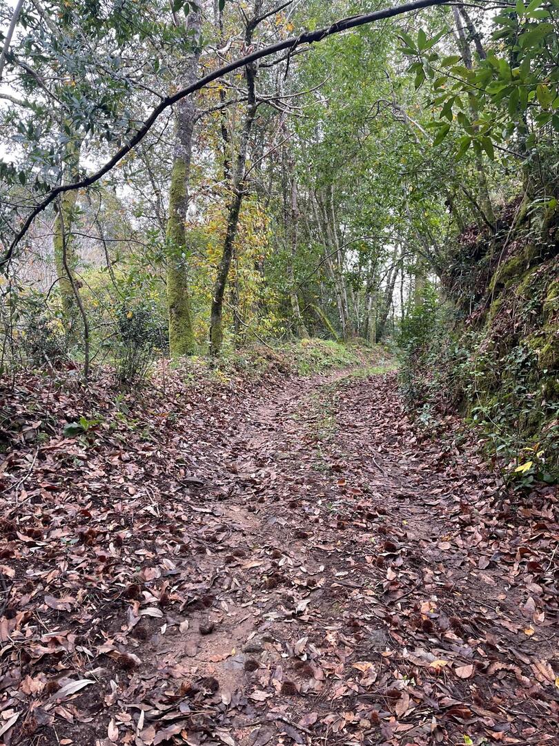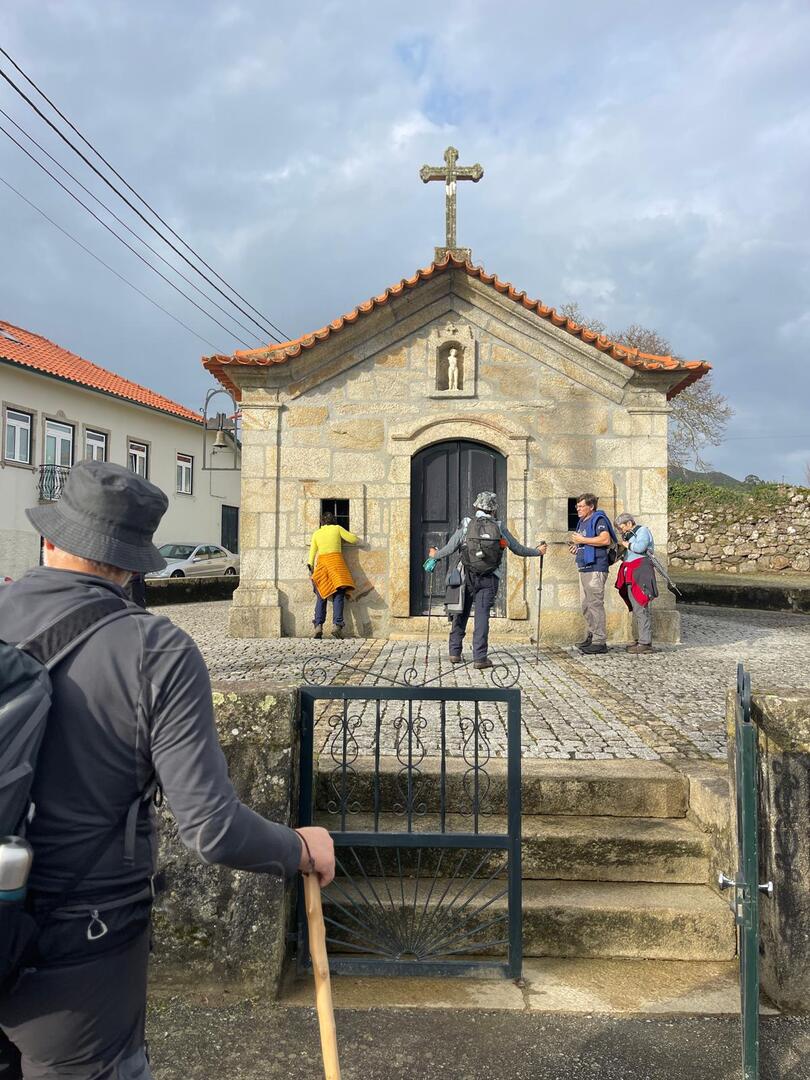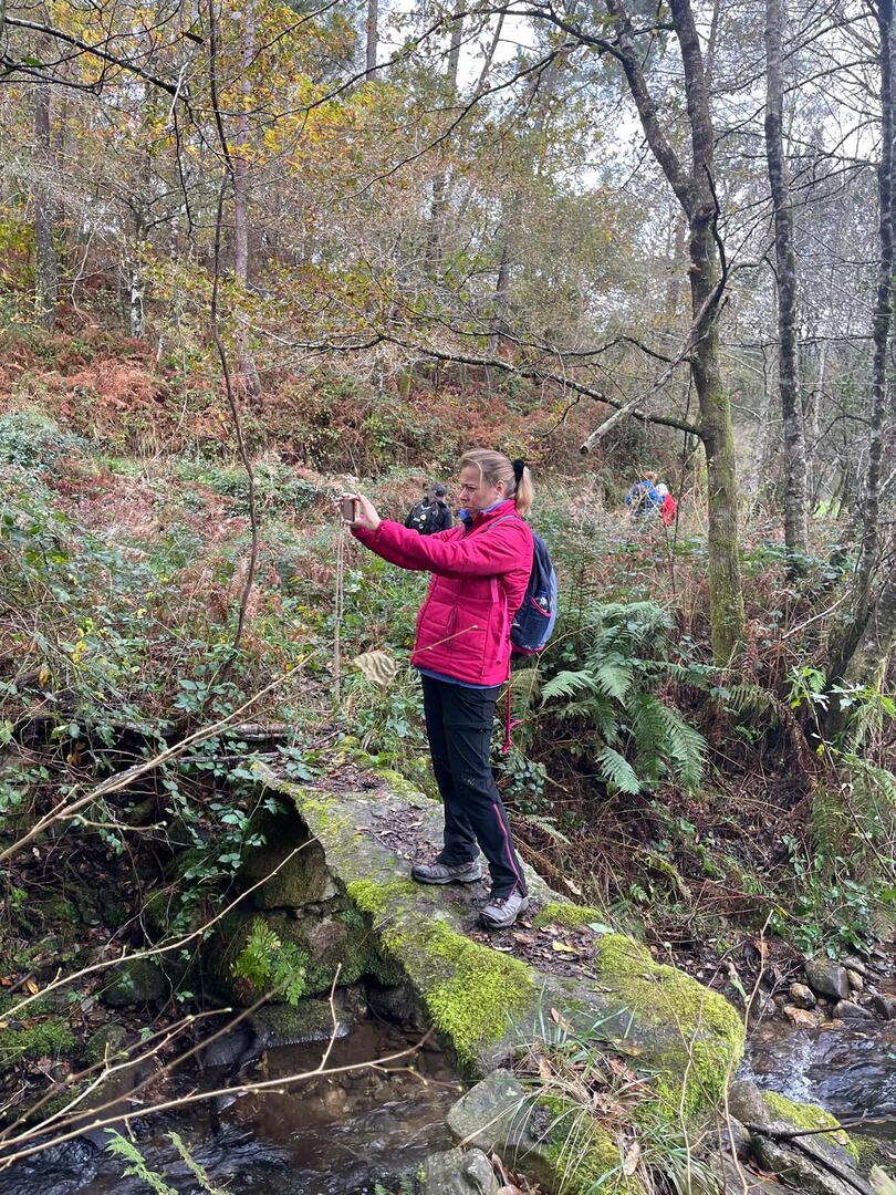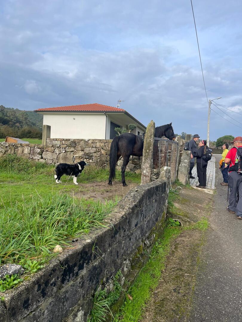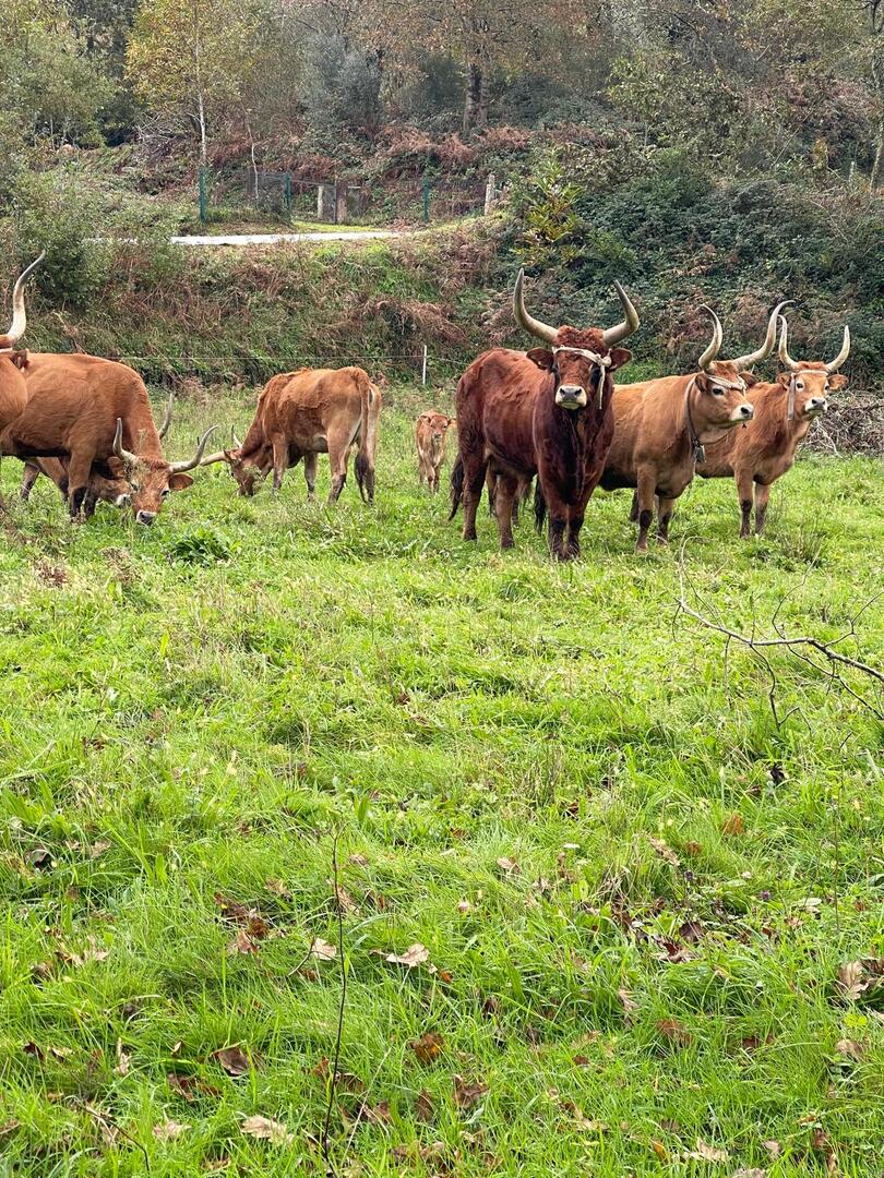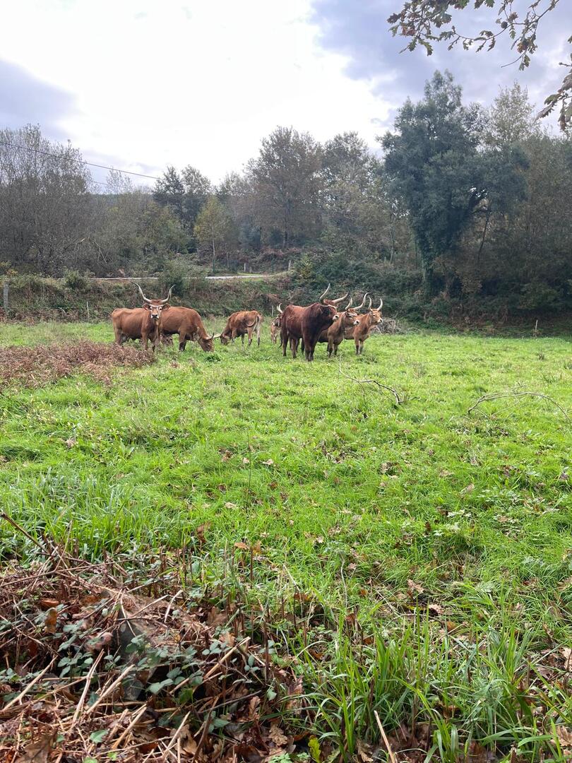 Subimos caminho entre campos agrícolas e vinhedos onde pudemos apreciar esta bela paisagem e aproveitar a tranquilidade que a natureza nos proporcionava. Avistamos uma manada de vacas cachenas, que são uma raça de gado bovino originária da península ibérica, são conhecidas pela sua rusticidade, resistência e pela capacidade de se adaptar a terrenos montanhosos e pobres em recursos, estas vacas têm como principal características, porte pequeno, chifres longos e curvados e pelagem castanha. Estes riachos geralmente desaguam no rio Coura e desempenham um papel importante no abastecimento da água e na irrigação das terras agrícolas locais.
