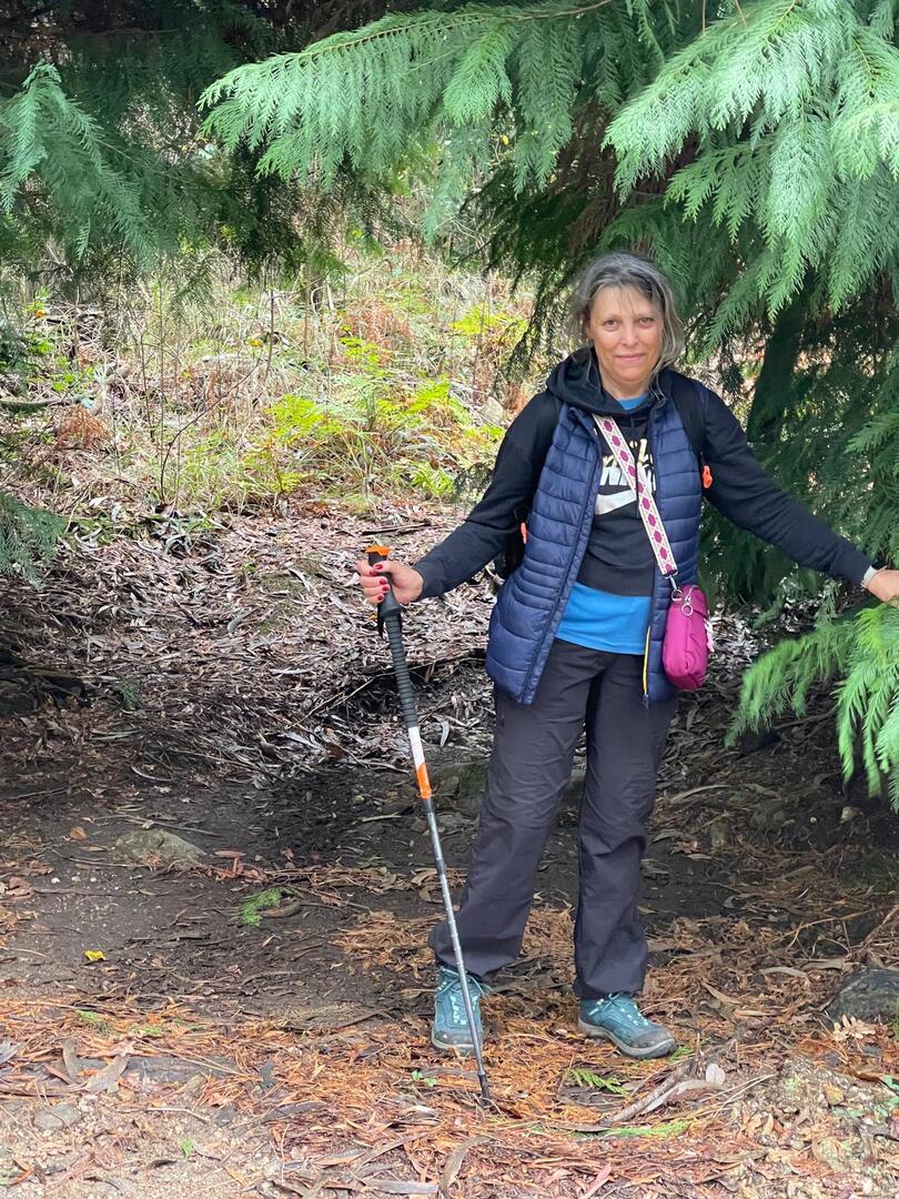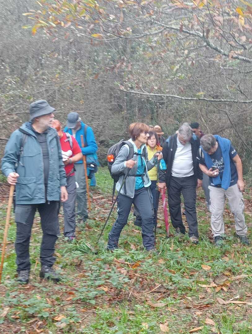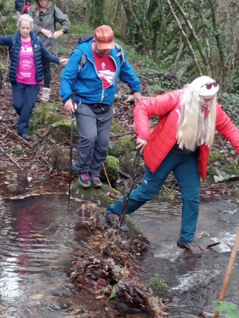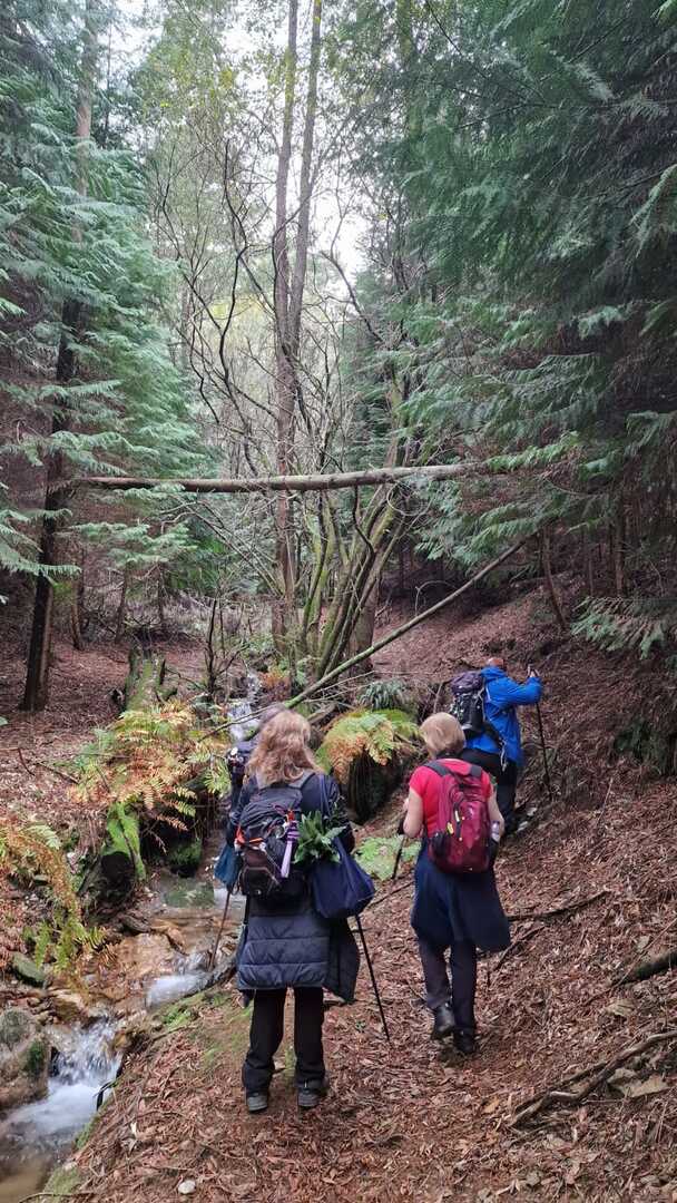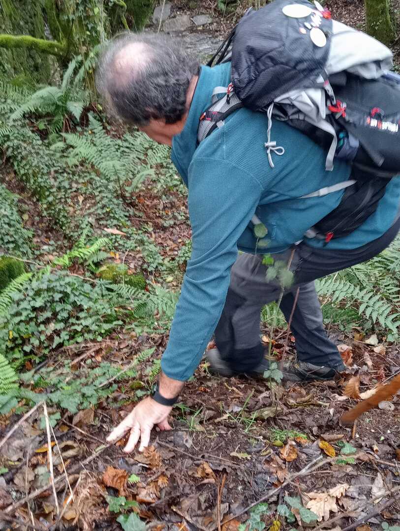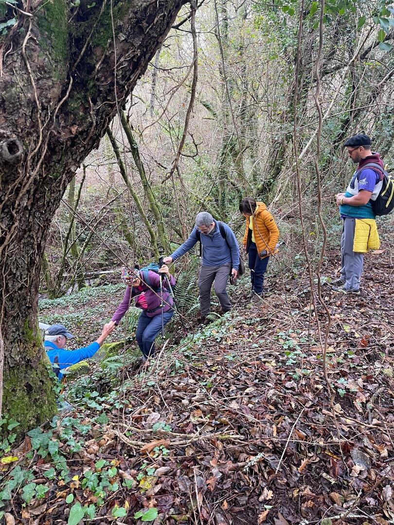 Embrenhados na floresta continuamos caminho, por vezes tivemos o apoio dos “paus” do Miguel e do Carvalhido para subirmos monte acima sem cairmos, mas há sempre alguma peripécia, neste caso foi a Fernanda que não sabia se havia de segurar no telefone ou no pau, resultado “bate cu” no chão.