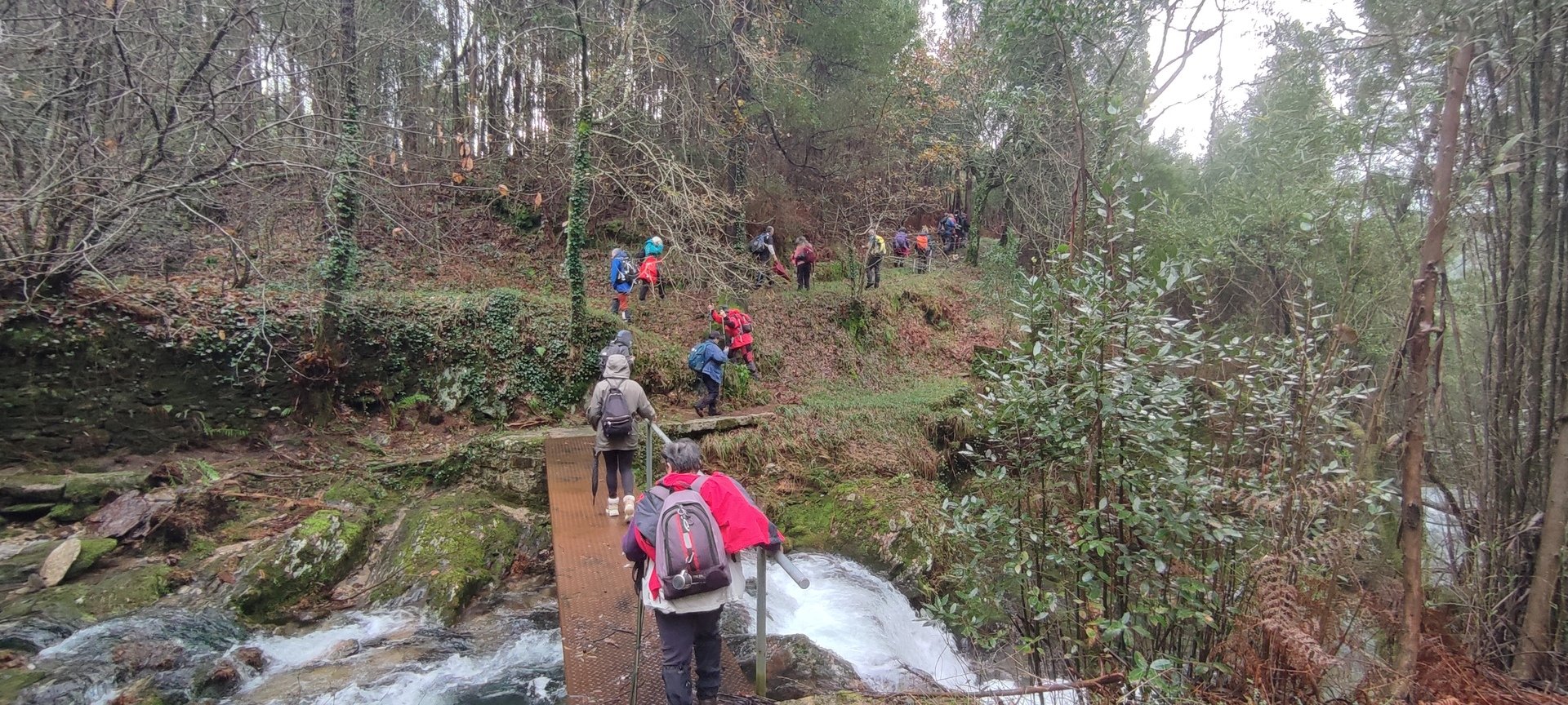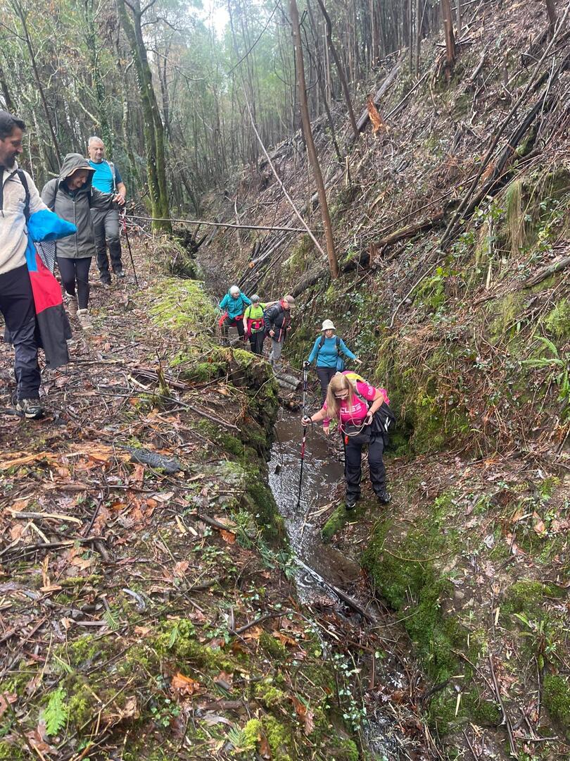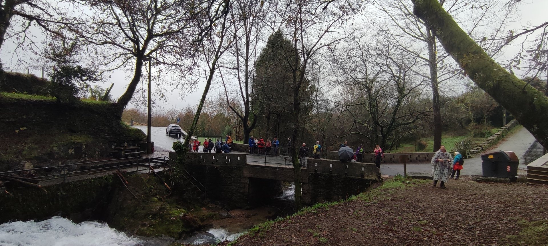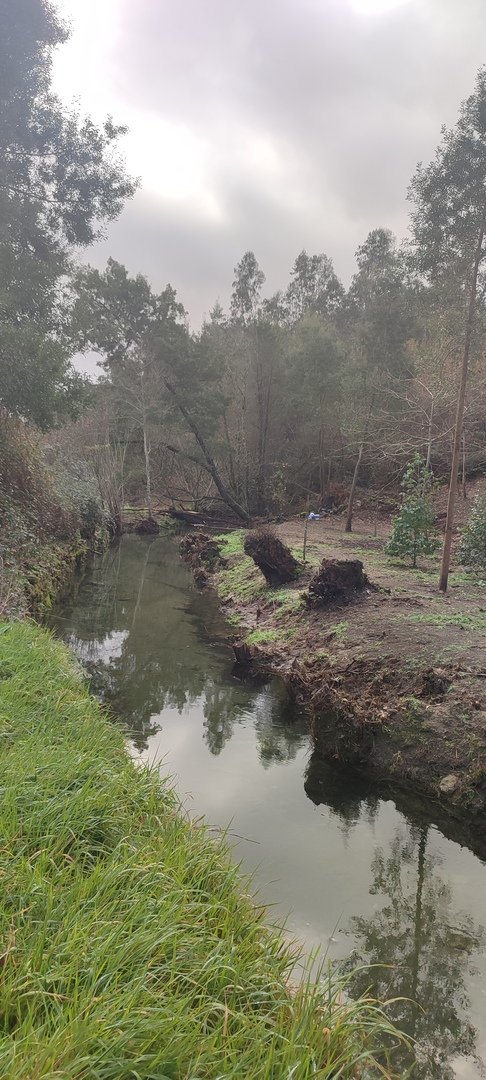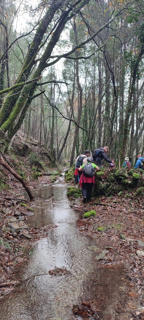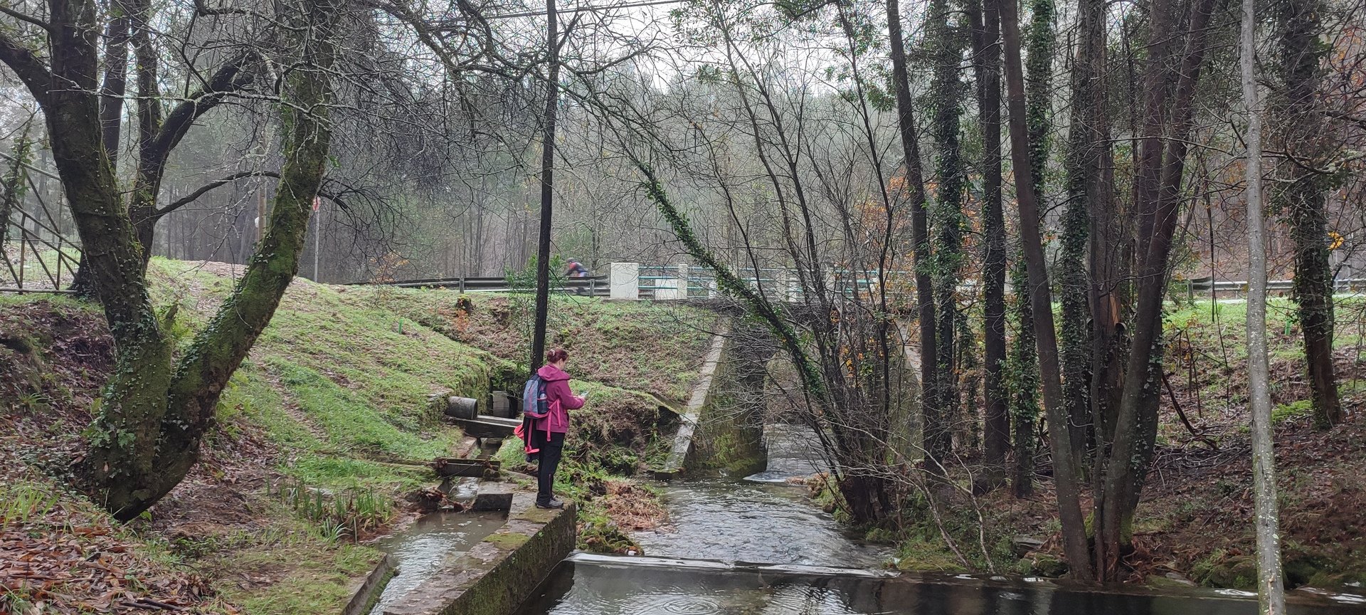 Sempre acompanhados pela chuva miudinha, continuamos descendo, agora no sentido Norte acompanhando a breve trecho o traçado do caminho de santiago e o PR22-Trilho dos Romeiros que depois abandonamos, para, continuando por caminhos florestais bastante alagados atingimos a Ponte dos Asnos sobre o ribeiro dos Campos vindo das encostas da Serra D'Arga. Aqui foi feito um breve reabastecimento dando oportunidade a se tirarem fotos do açude e trecho do ribeiro.