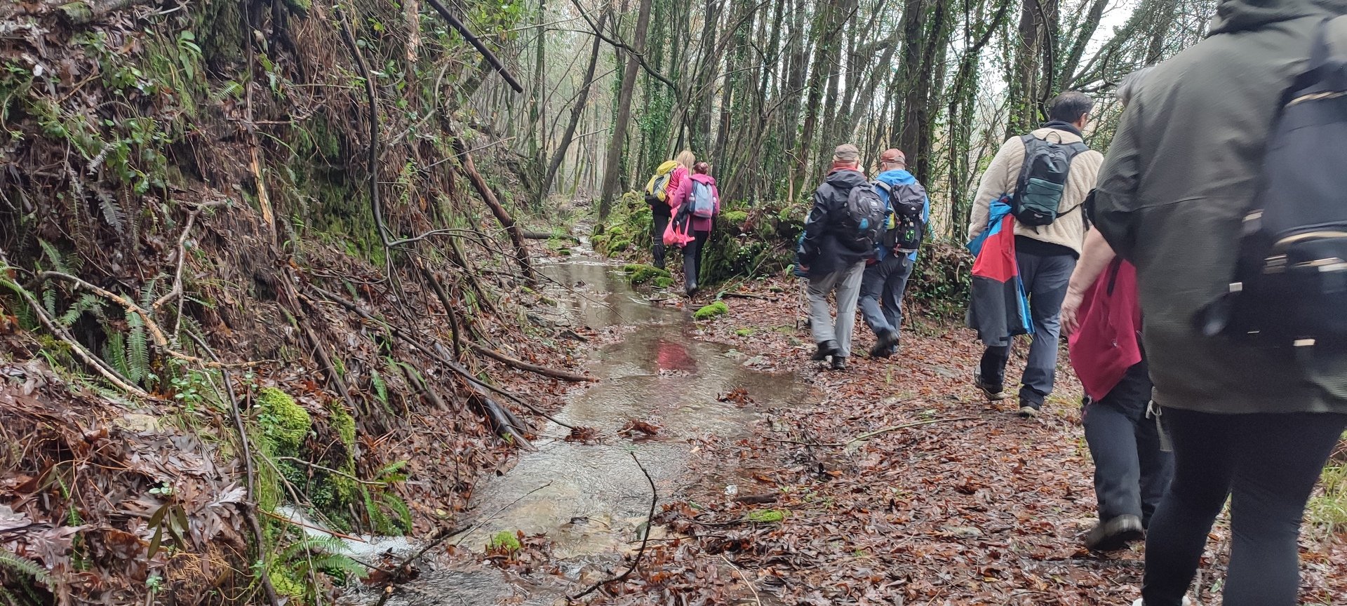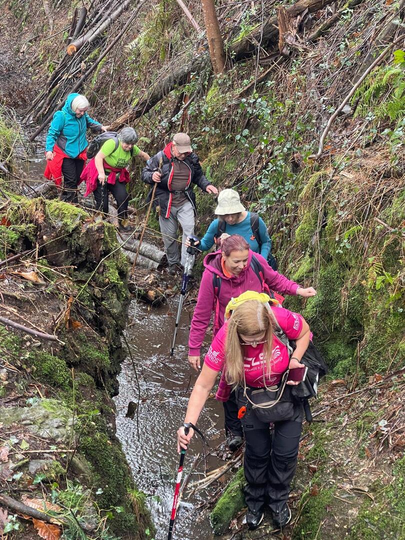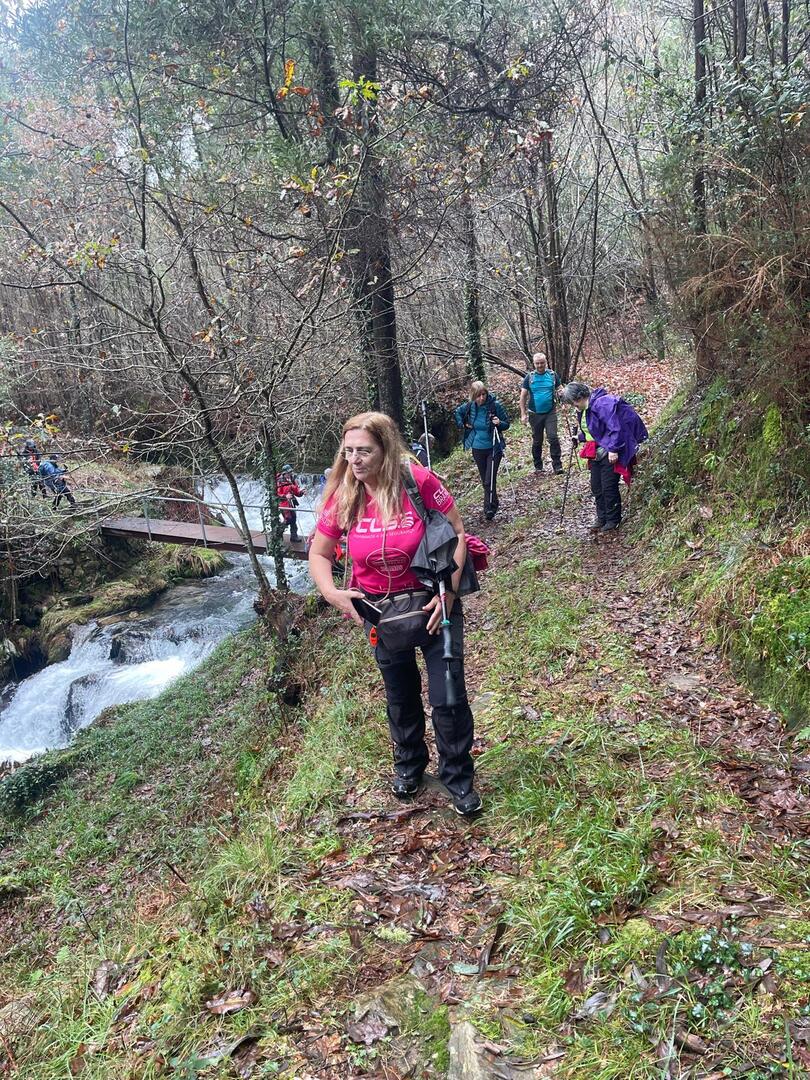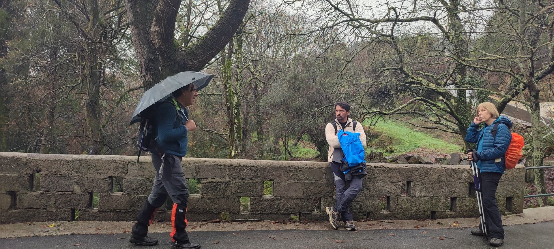 Sempre acompanhados pela chuva miudinha, continuamos descendo, agora no sentido Norte acompanhando a breve trecho o traçado do caminho de santiago e o PR22-Trilho dos Romeiros que depois abandonamos, para, continuando por caminhos florestais bastante alagados atingimos a Ponte dos Asnos sobre o ribeiro dos Campos vindo das encostas da Serra D'Arga. Aqui foi feito um breve reabastecimento dando oportunidade a se tirarem fotos do açude e trecho do ribeiro.