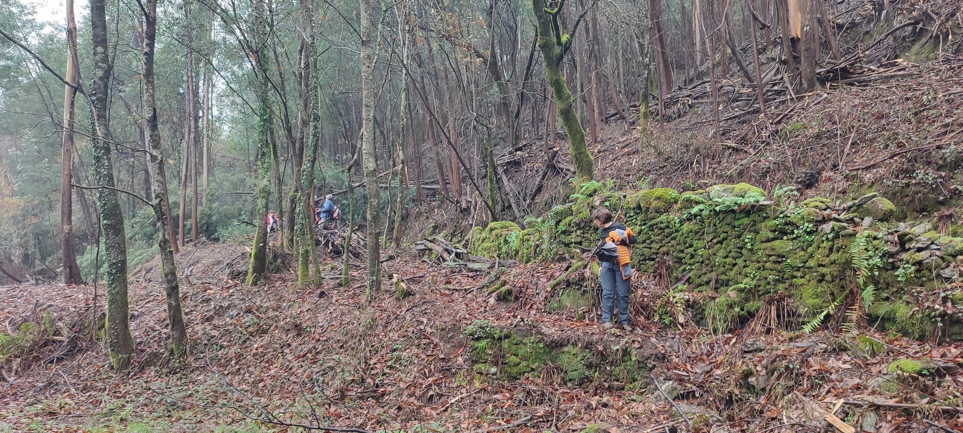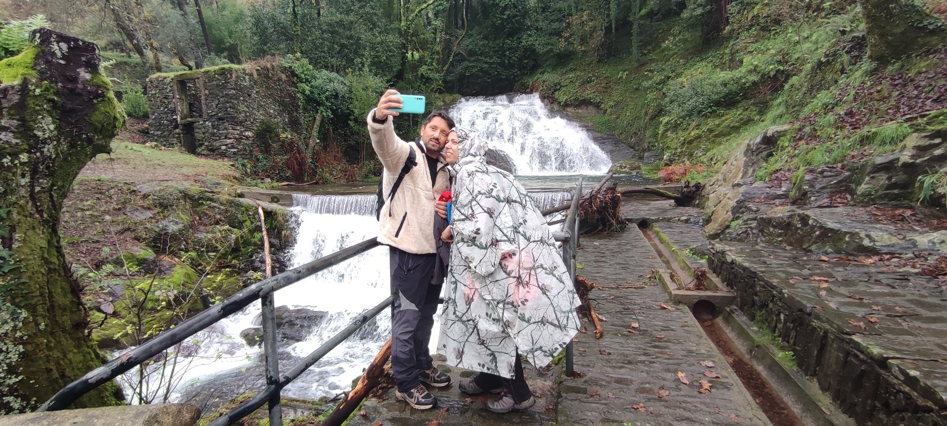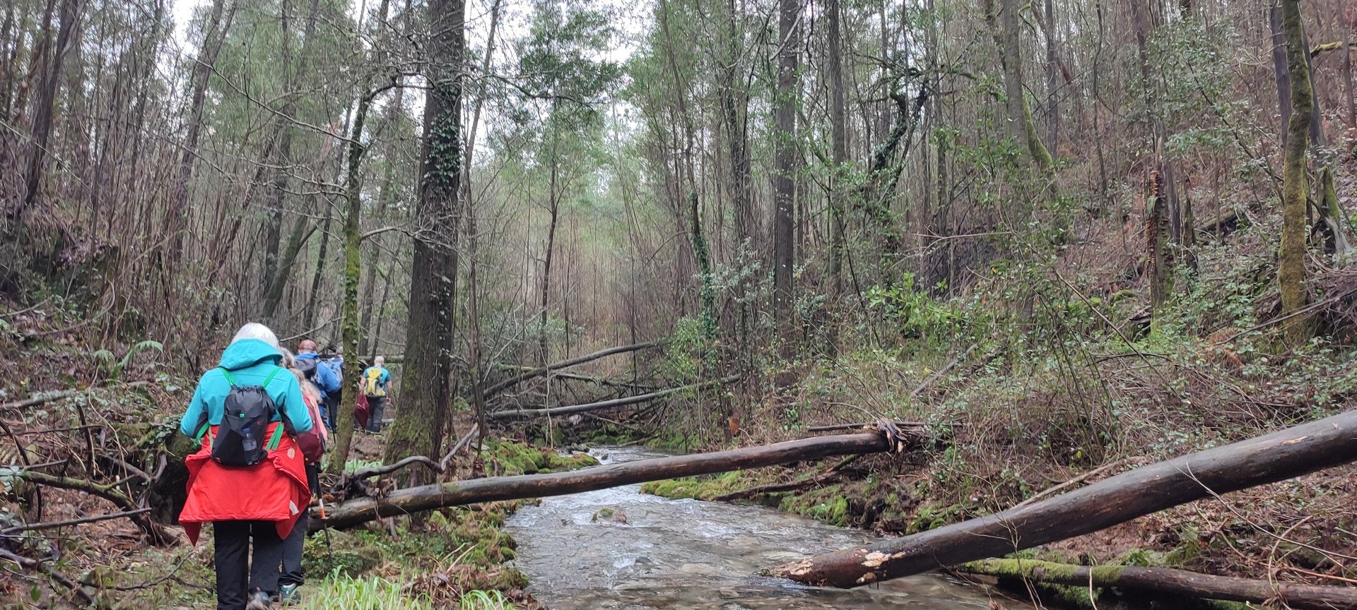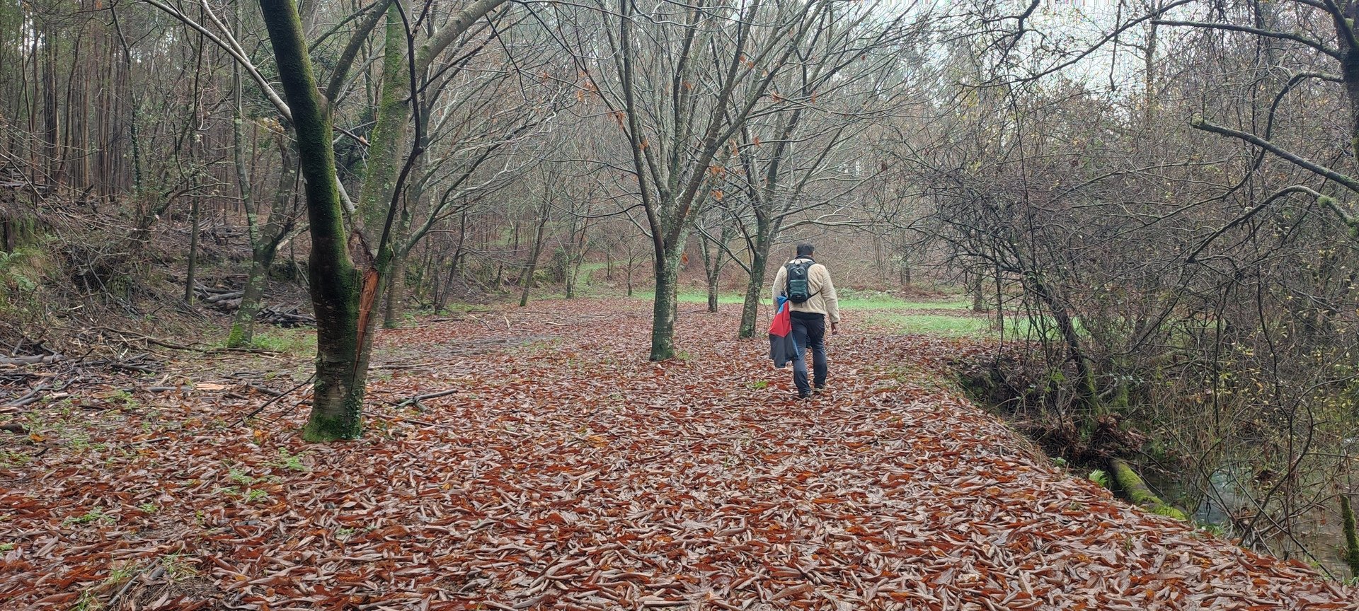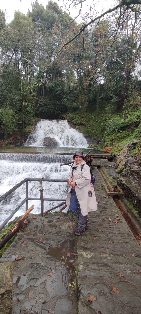 Sempre acompanhados pela chuva miudinha, continuamos descendo, agora no sentido Norte acompanhando a breve trecho o traçado do caminho de santiago e o PR22-Trilho dos Romeiros que depois abandonamos, para, continuando por caminhos florestais bastante alagados atingimos a Ponte dos Asnos sobre o ribeiro dos Campos vindo das encostas da Serra D'Arga. Aqui foi feito um breve reabastecimento dando oportunidade a se tirarem fotos do açude e trecho do ribeiro.