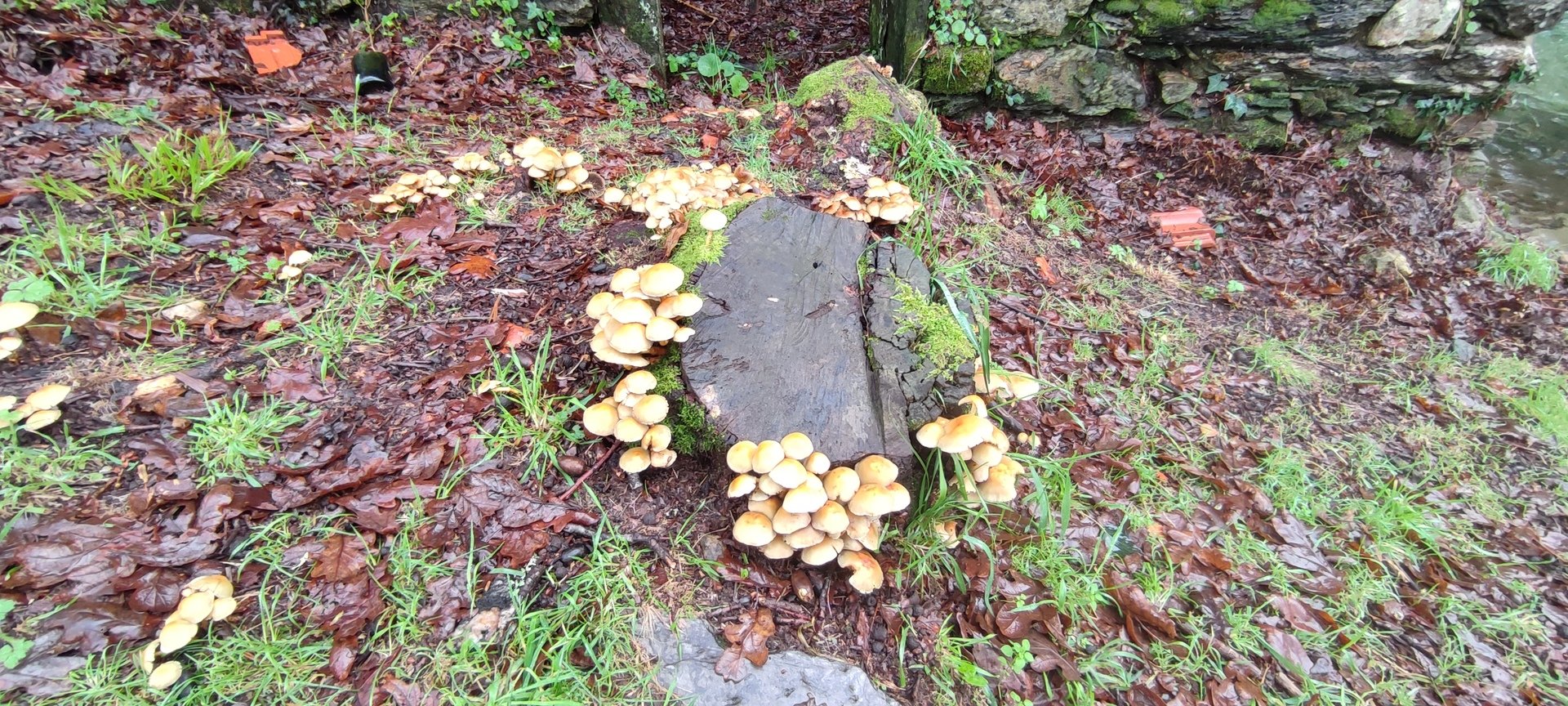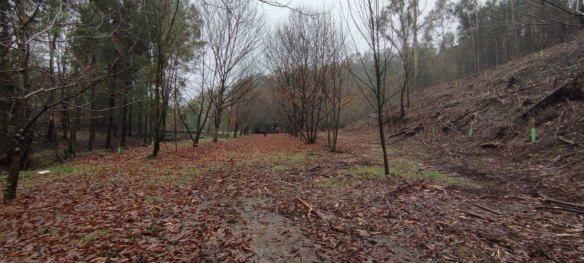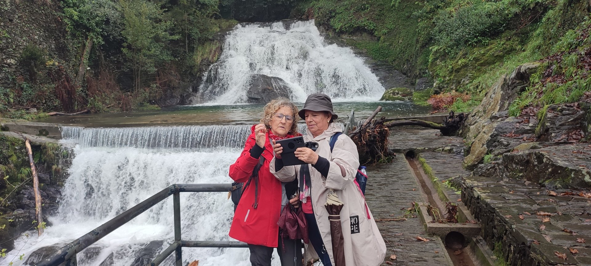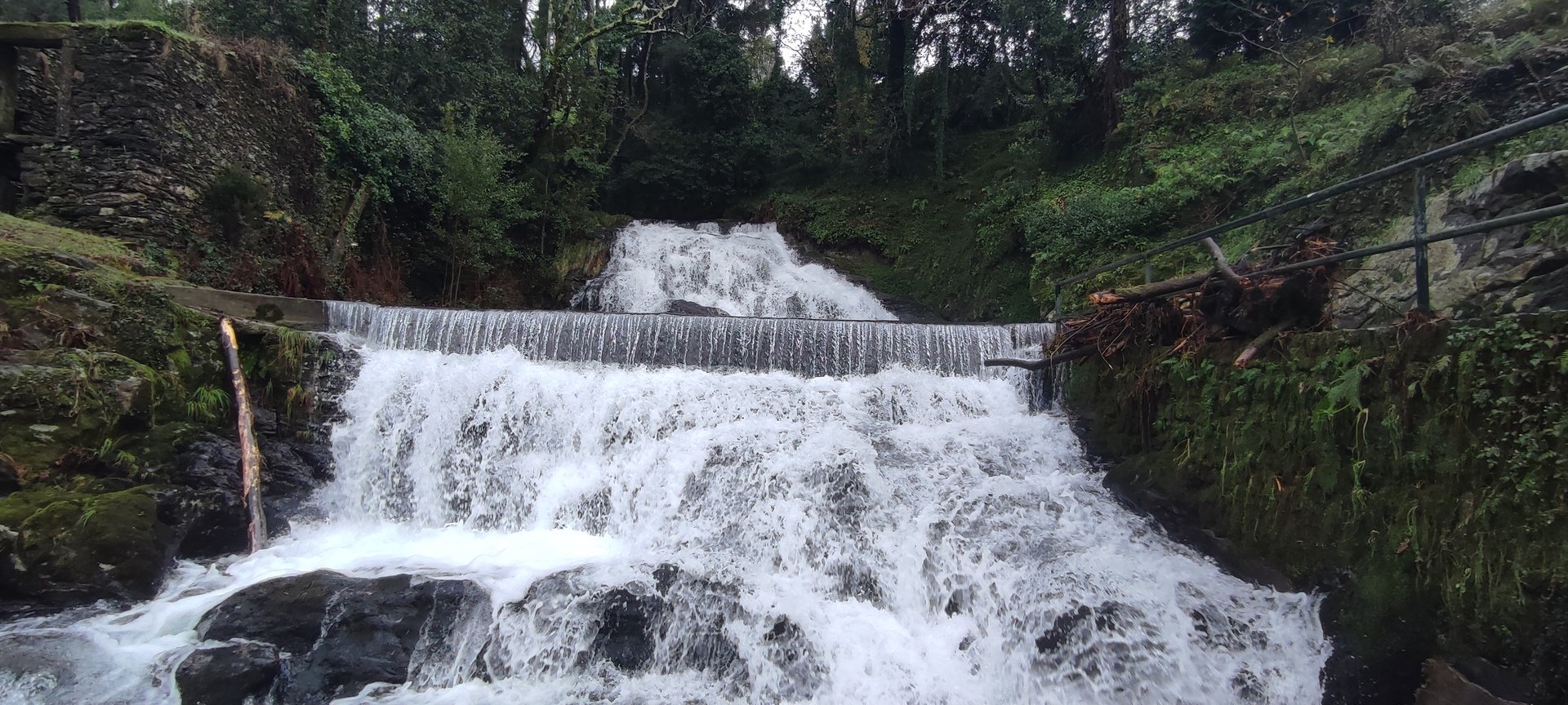 Sempre acompanhados pela chuva miudinha, continuamos descendo, agora no sentido Norte acompanhando a breve trecho o traçado do caminho de santiago e o PR22-Trilho dos Romeiros que depois abandonamos, para, continuando por caminhos florestais bastante alagados atingimos a Ponte dos Asnos sobre o ribeiro dos Campos vindo das encostas da Serra D'Arga. Aqui foi feito um breve reabastecimento dando oportunidade a se tirarem fotos do açude e trecho do ribeiro.