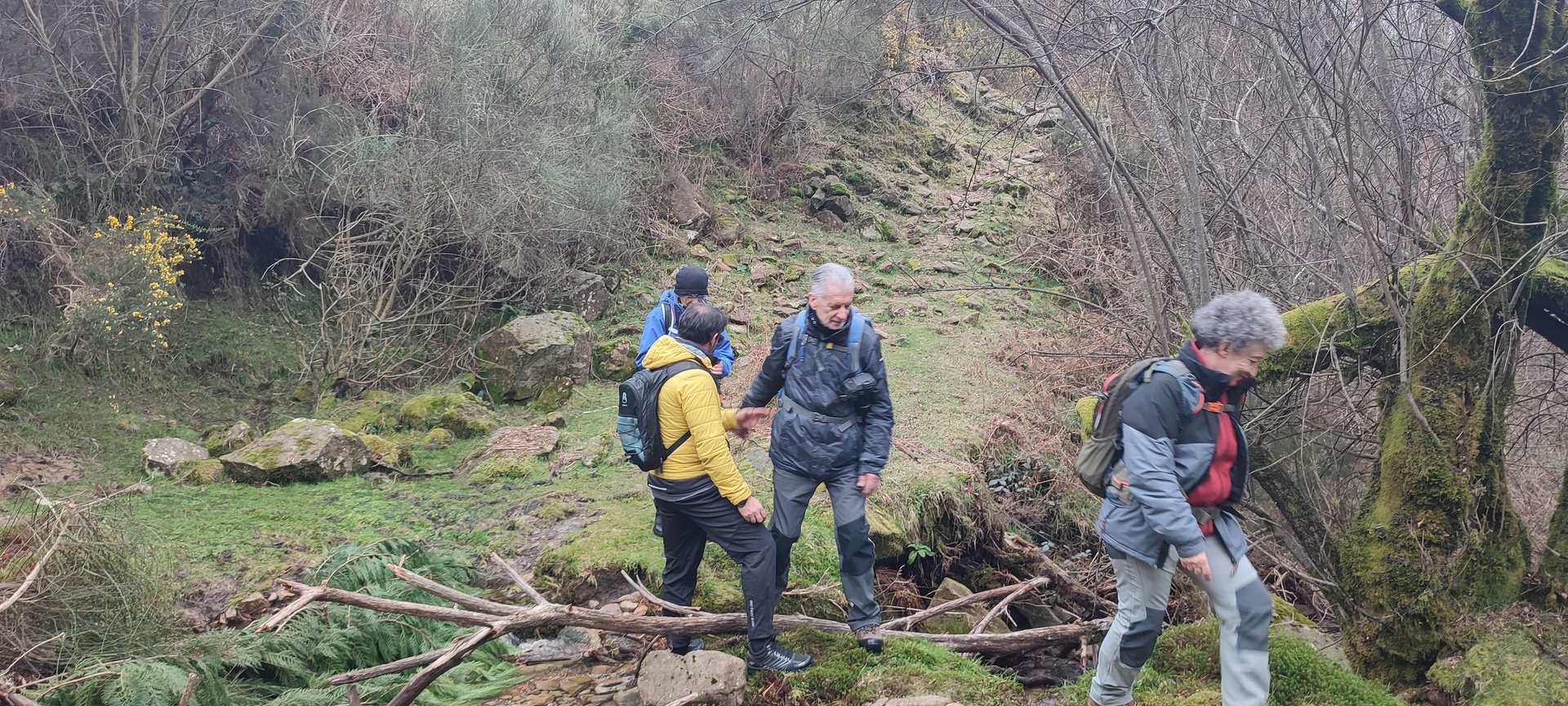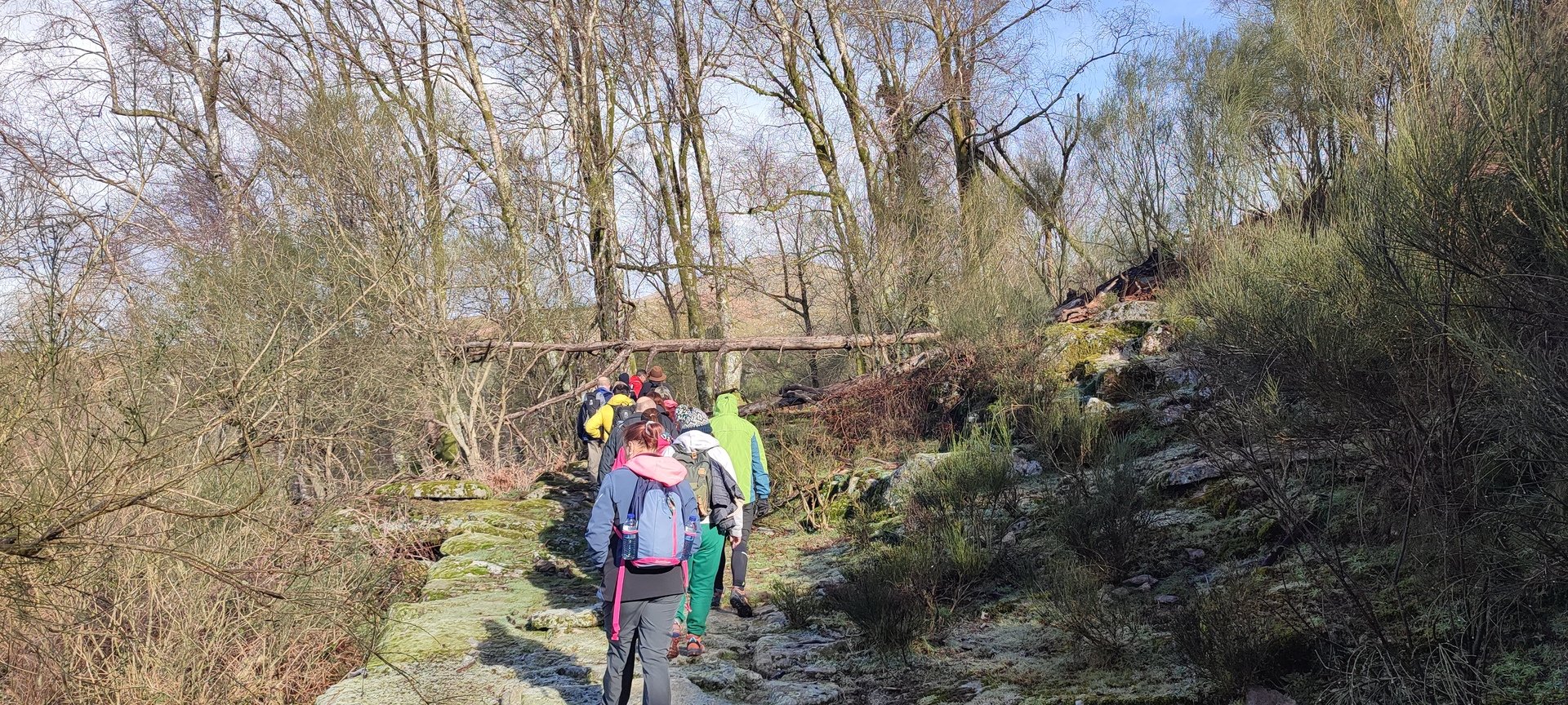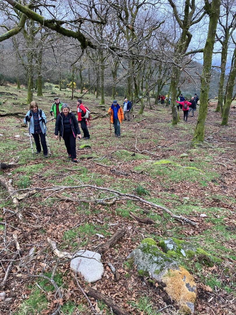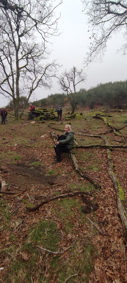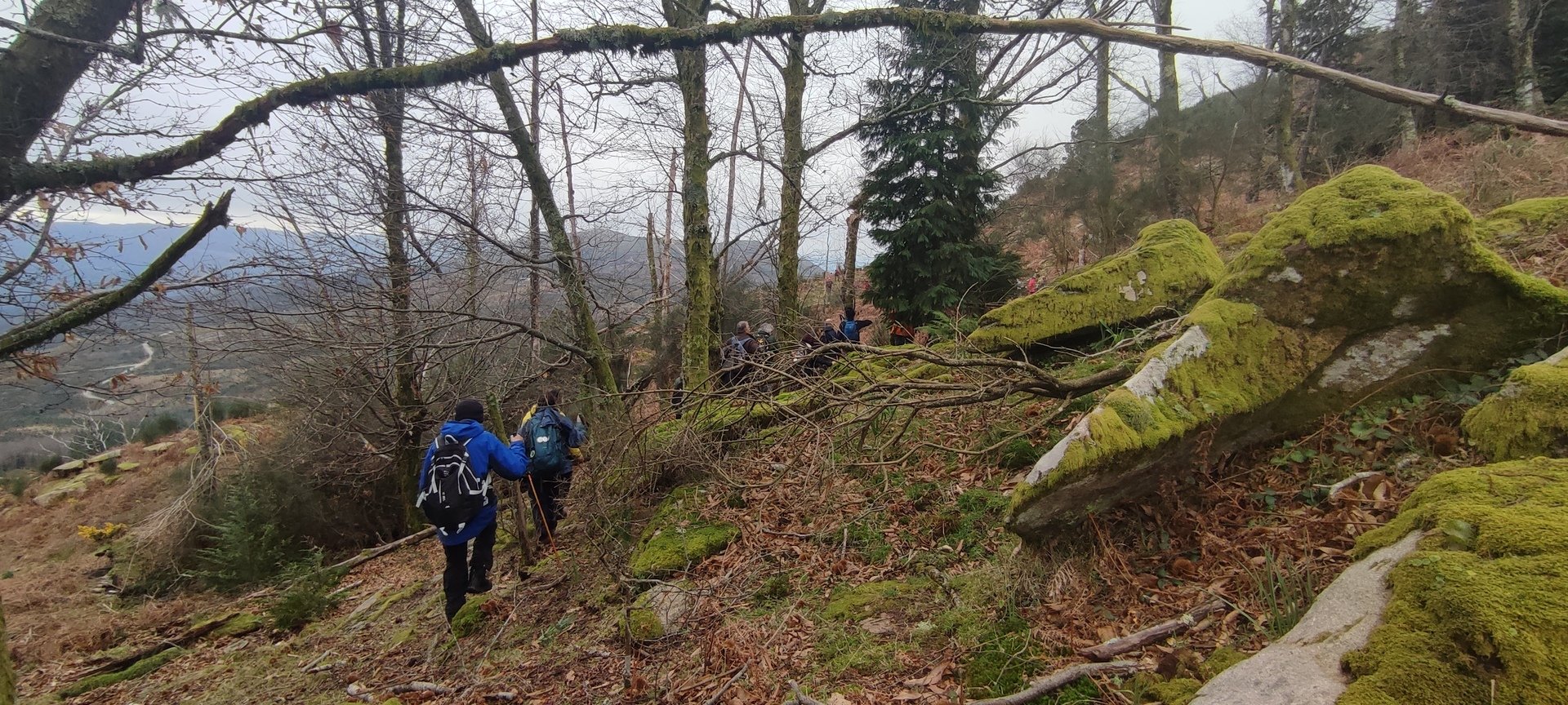 Retomámos a subida, pela calçada, acompanhados pela belíssima paisagem dos montes circundantes e aproveitámos para "matabichar", uma vez que do pequeno almoço já se havia perdido a memória. Não tardámos a entrar numa zona arborizada, cujas árvores de folha caduca apresentavam uma beleza diferente com os seus troncos cobertos de musgos e líquenes dando um ar de floresta encantada onde só faltava aparecer um duende traquina para nos pregar uma partida.