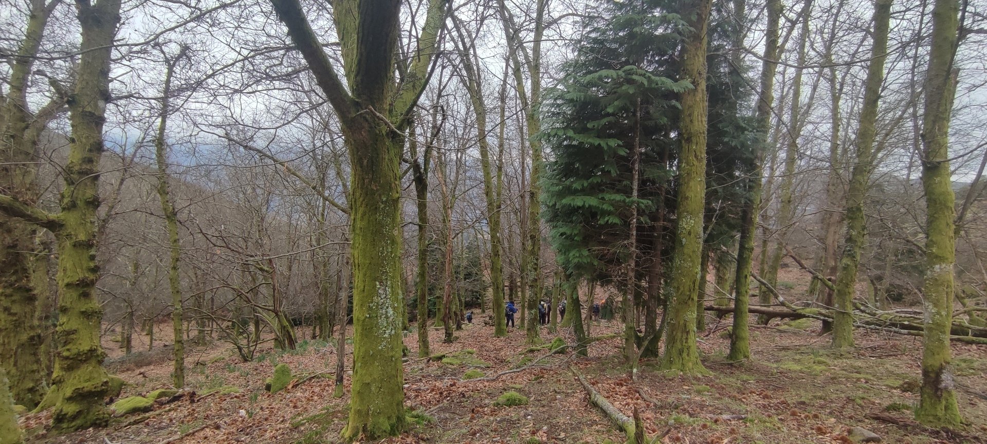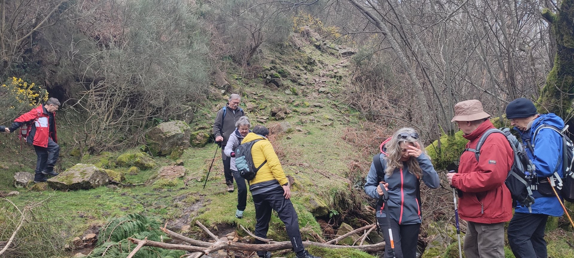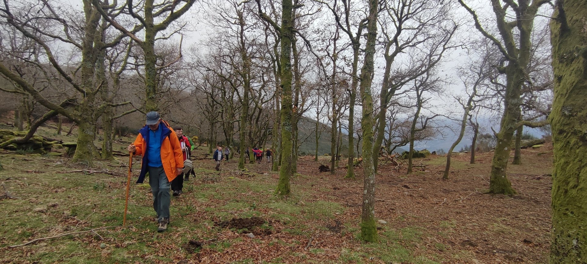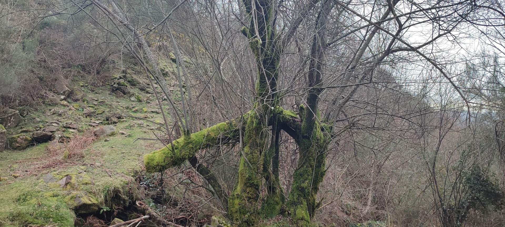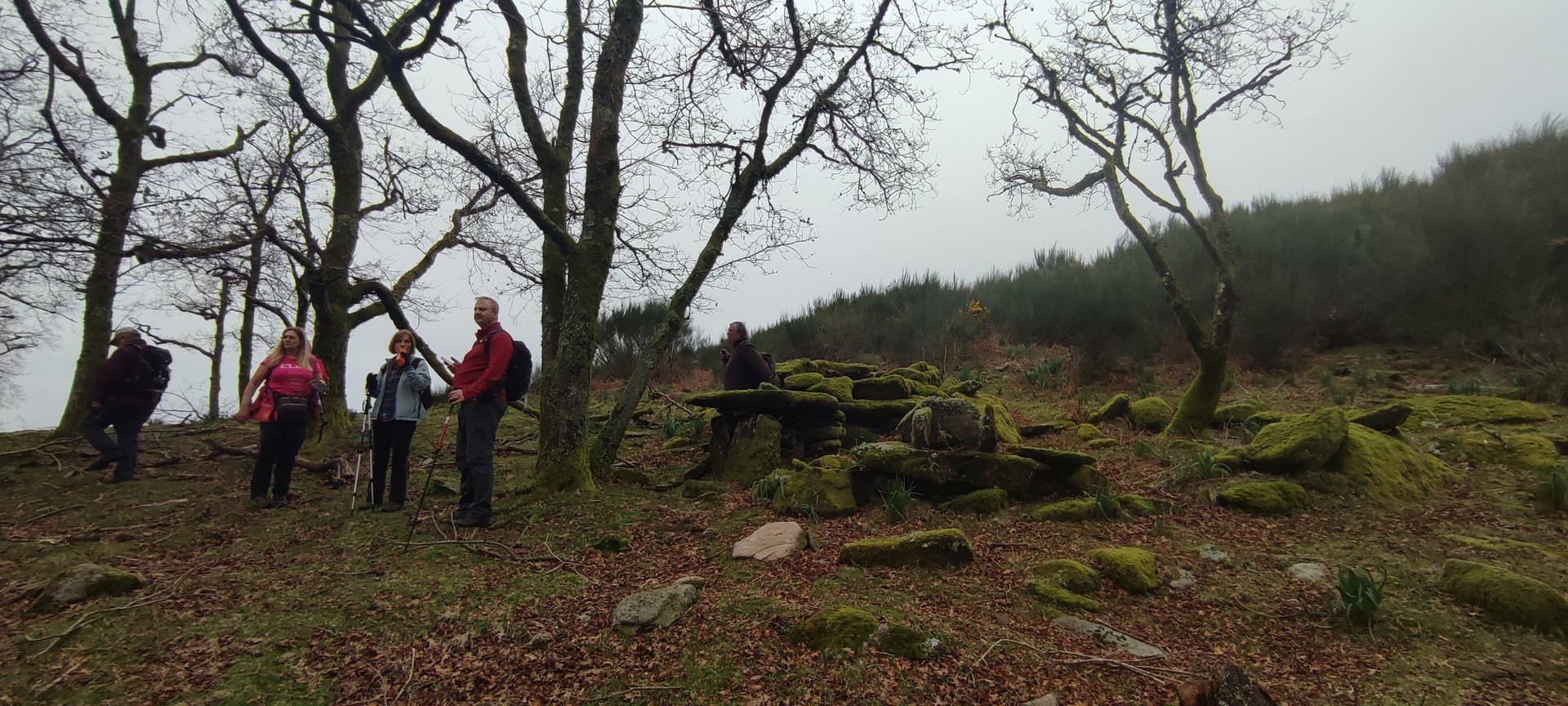 Retomámos a subida, pela calçada, acompanhados pela belíssima paisagem dos montes circundantes e aproveitámos para "matabichar", uma vez que do pequeno almoço já se havia perdido a memória. Não tardámos a entrar numa zona arborizada, cujas árvores de folha caduca apresentavam uma beleza diferente com os seus troncos cobertos de musgos e líquenes dando um ar de floresta encantada onde só faltava aparecer um duende traquina para nos pregar uma partida.