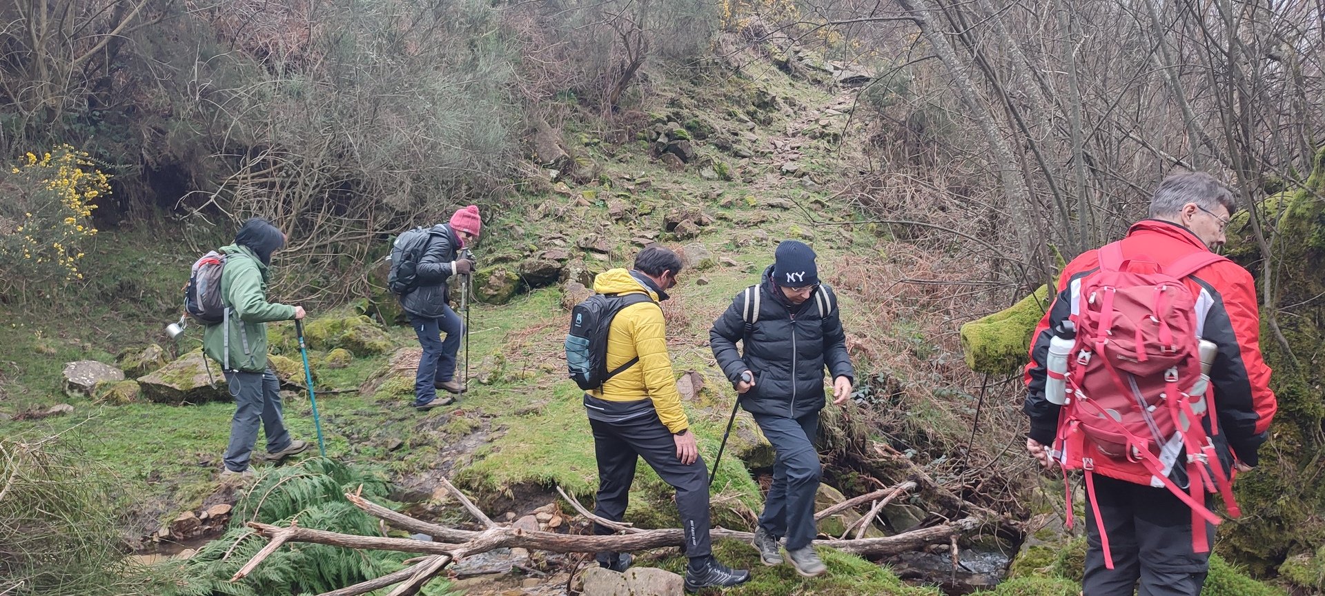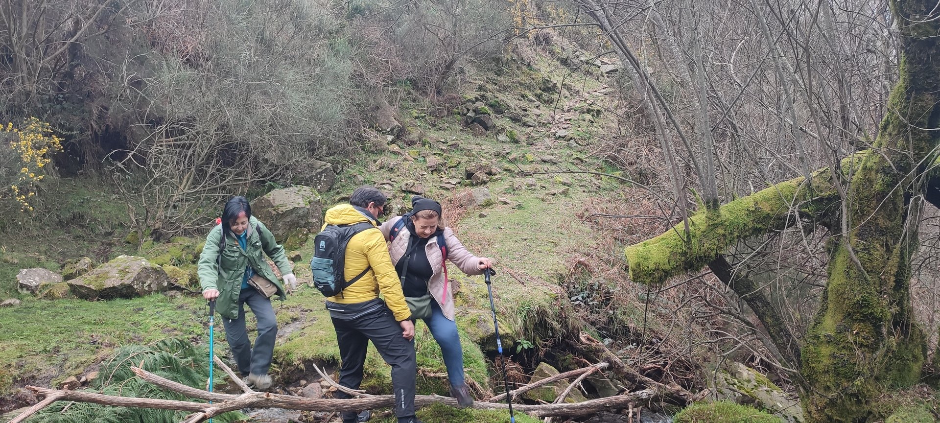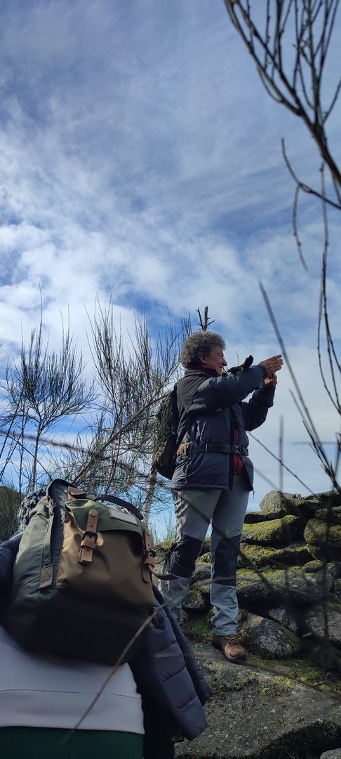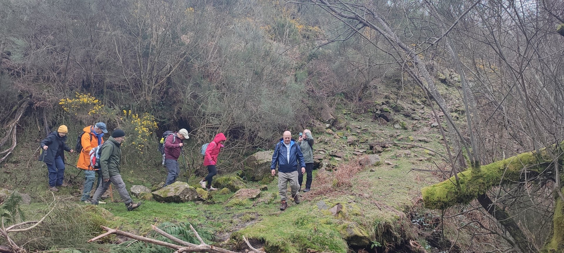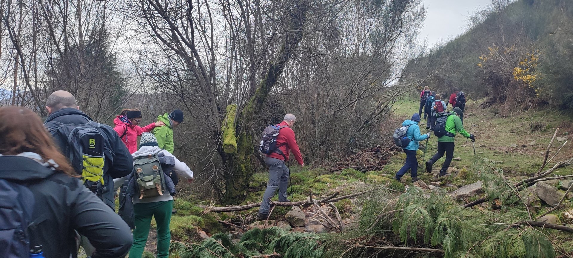 Retomámos a subida, pela calçada, acompanhados pela belíssima paisagem dos montes circundantes e aproveitámos para "matabichar", uma vez que do pequeno almoço já se havia perdido a memória. Não tardámos a entrar numa zona arborizada, cujas árvores de folha caduca apresentavam uma beleza diferente com os seus troncos cobertos de musgos e líquenes dando um ar de floresta encantada onde só faltava aparecer um duende traquina para nos pregar uma partida.