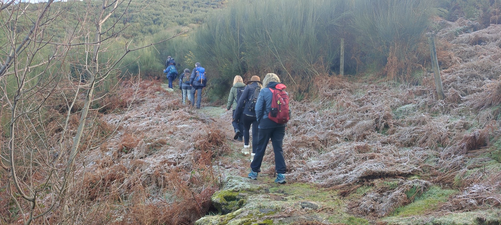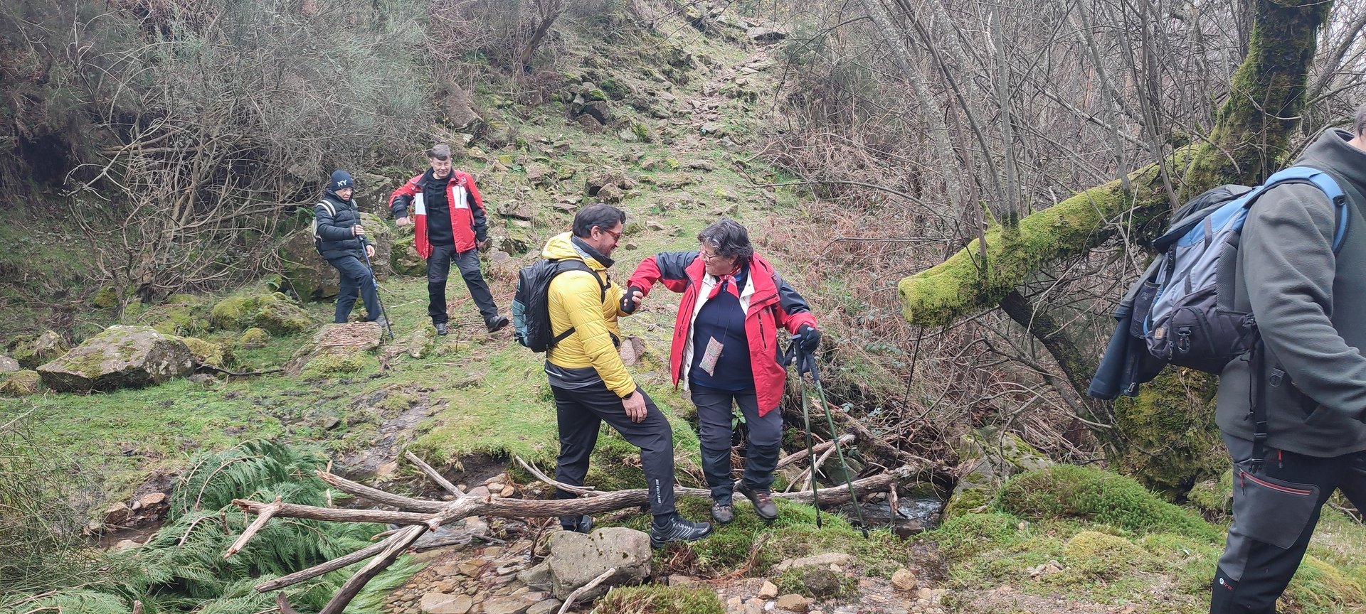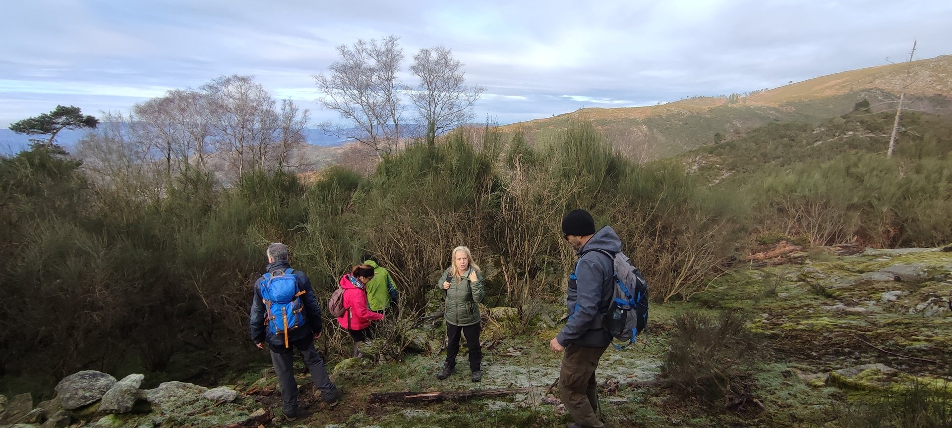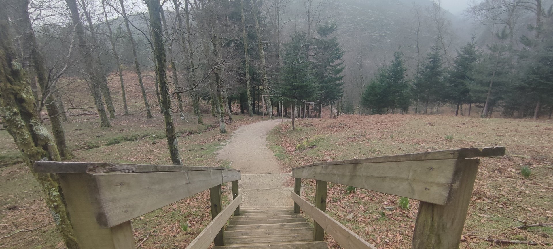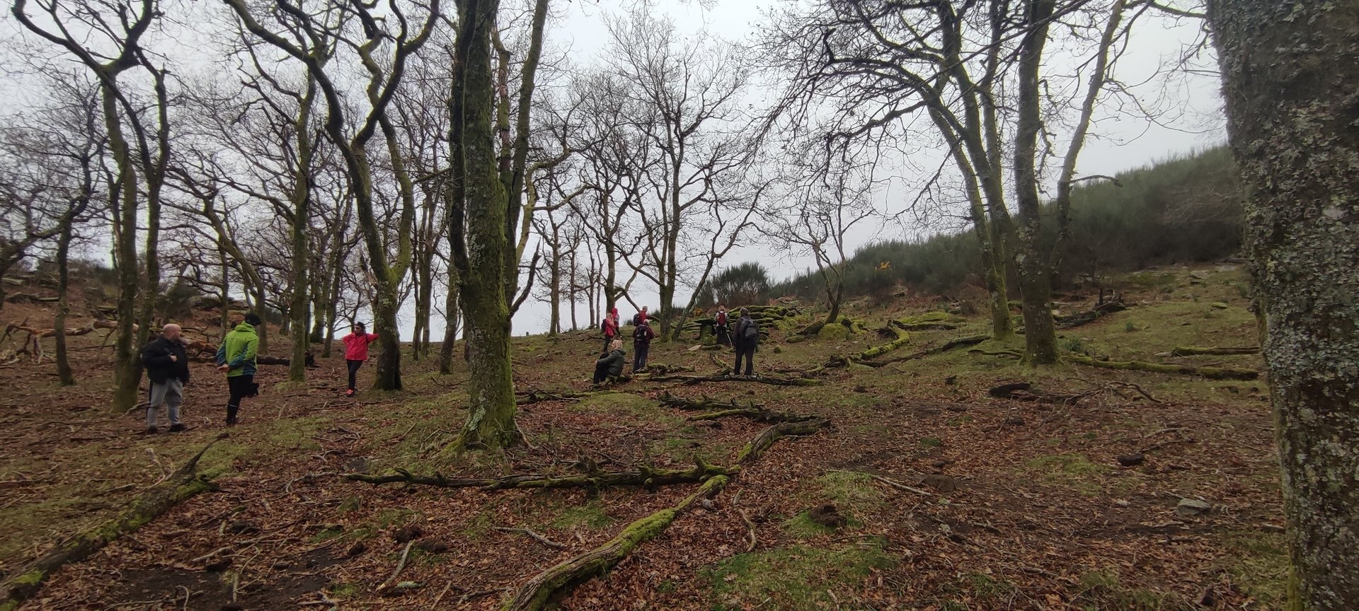 Retomámos a subida, pela calçada, acompanhados pela belíssima paisagem dos montes circundantes e aproveitámos para "matabichar", uma vez que do pequeno almoço já se havia perdido a memória. Não tardámos a entrar numa zona arborizada, cujas árvores de folha caduca apresentavam uma beleza diferente com os seus troncos cobertos de musgos e líquenes dando um ar de floresta encantada onde só faltava aparecer um duende traquina para nos pregar uma partida.