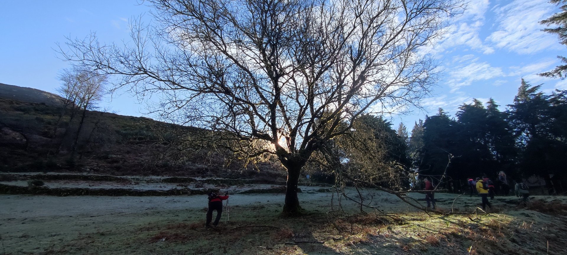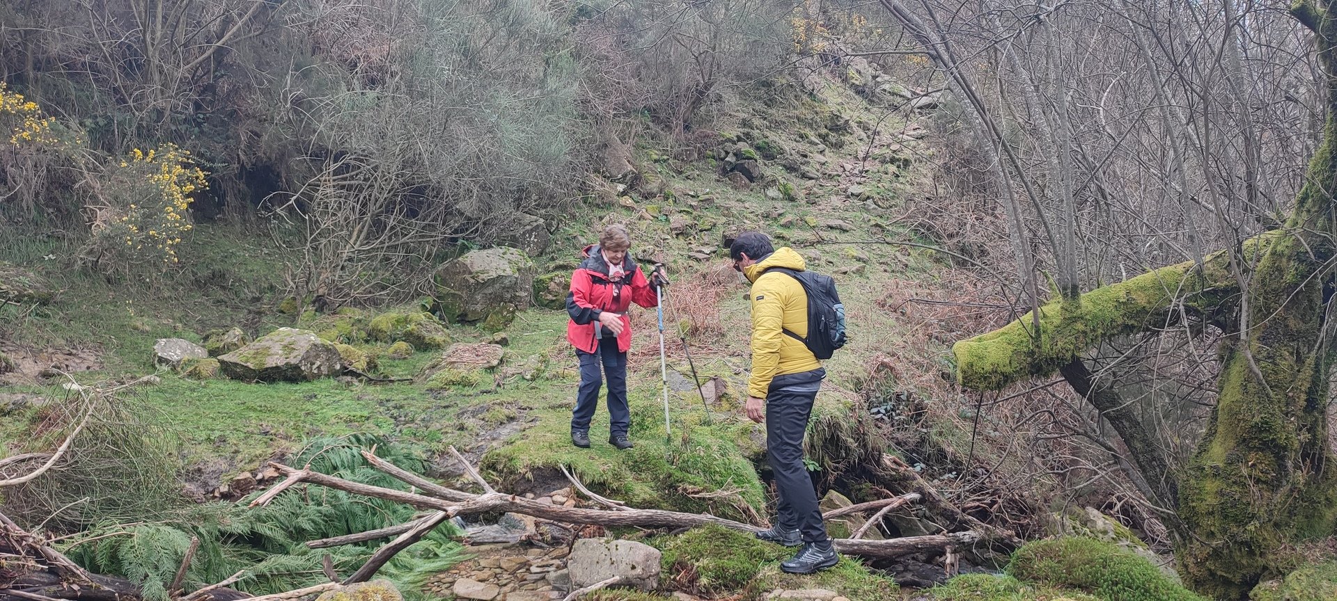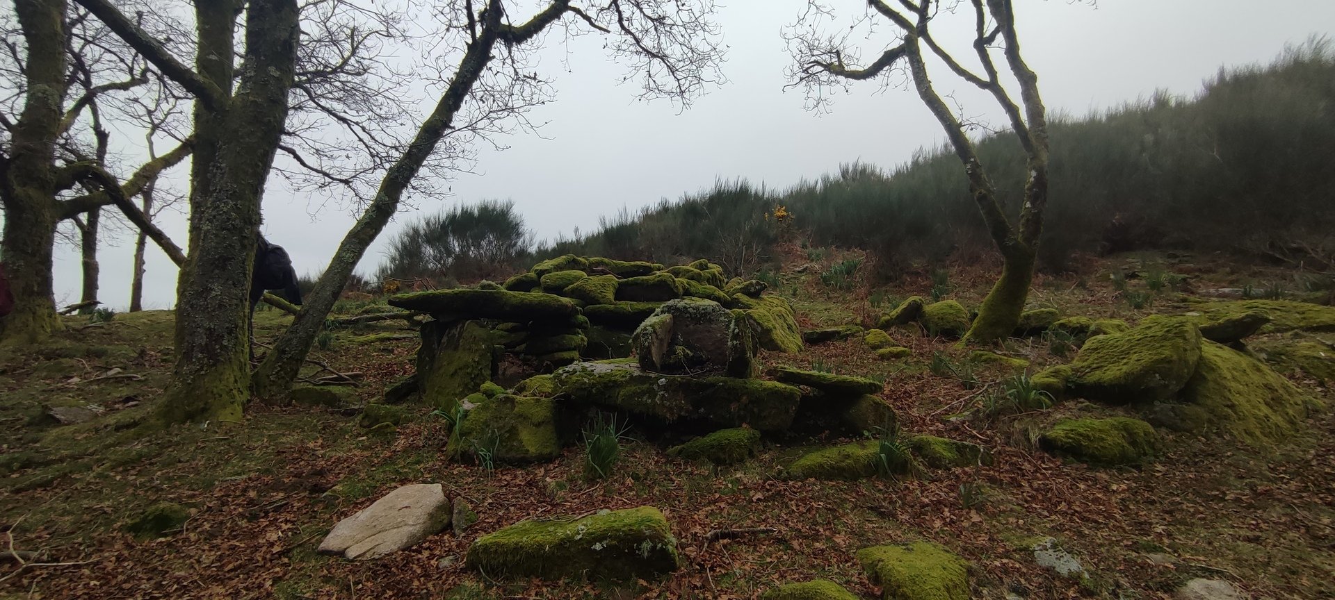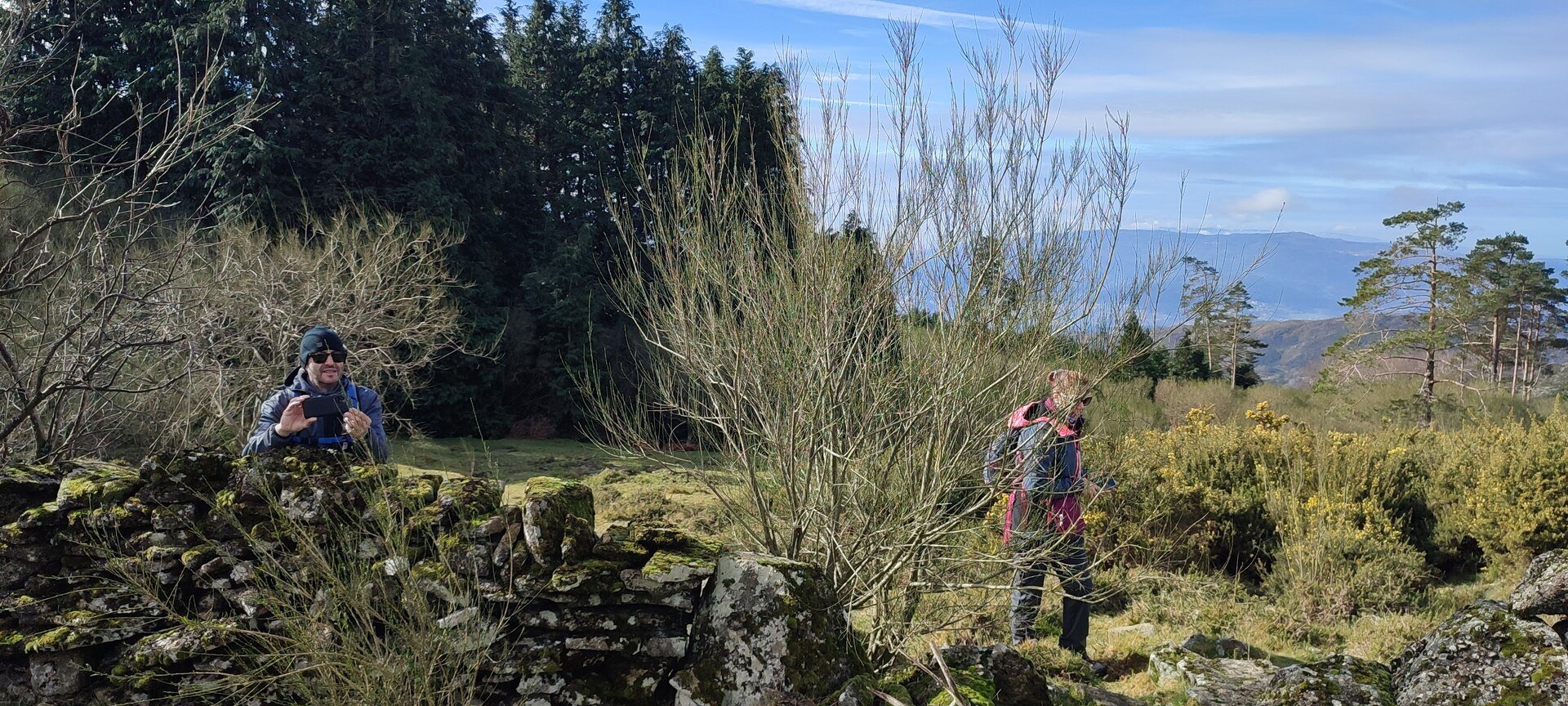 Retomámos a subida, pela calçada, acompanhados pela belíssima paisagem dos montes circundantes e aproveitámos para "matabichar", uma vez que do pequeno almoço já se havia perdido a memória. Não tardámos a entrar numa zona arborizada, cujas árvores de folha caduca apresentavam uma beleza diferente com os seus troncos cobertos de musgos e líquenes dando um ar de floresta encantada onde só faltava aparecer um duende traquina para nos pregar uma partida.