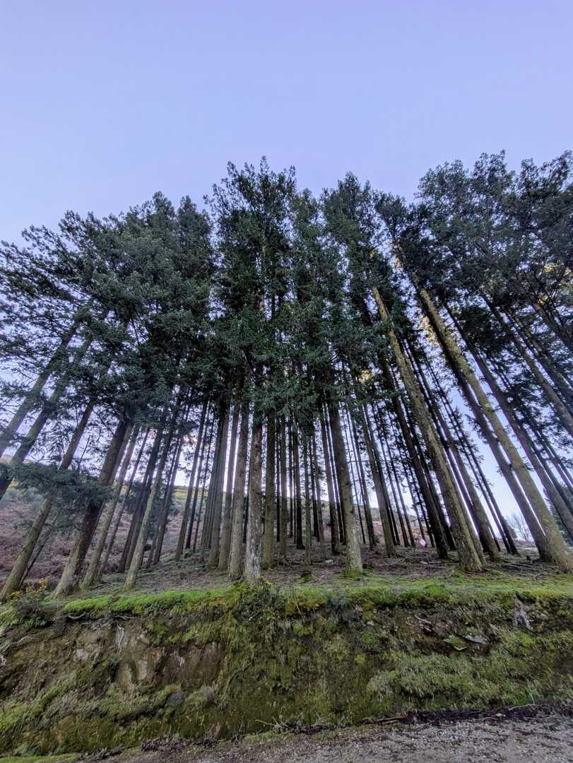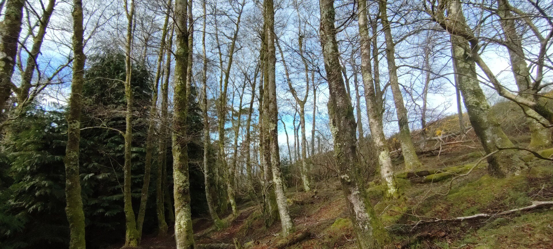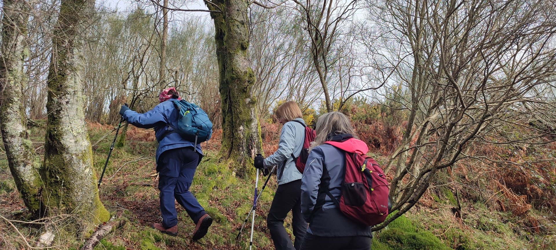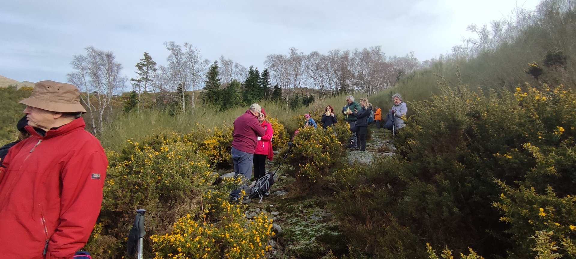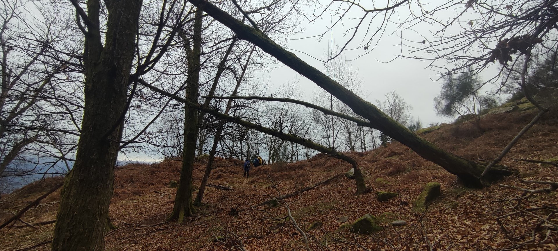 Retomámos a subida, pela calçada, acompanhados pela belíssima paisagem dos montes circundantes e aproveitámos para "matabichar", uma vez que do pequeno almoço já se havia perdido a memória. Não tardámos a entrar numa zona arborizada, cujas árvores de folha caduca apresentavam uma beleza diferente com os seus troncos cobertos de musgos e líquenes dando um ar de floresta encantada onde só faltava aparecer um duende traquina para nos pregar uma partida.
