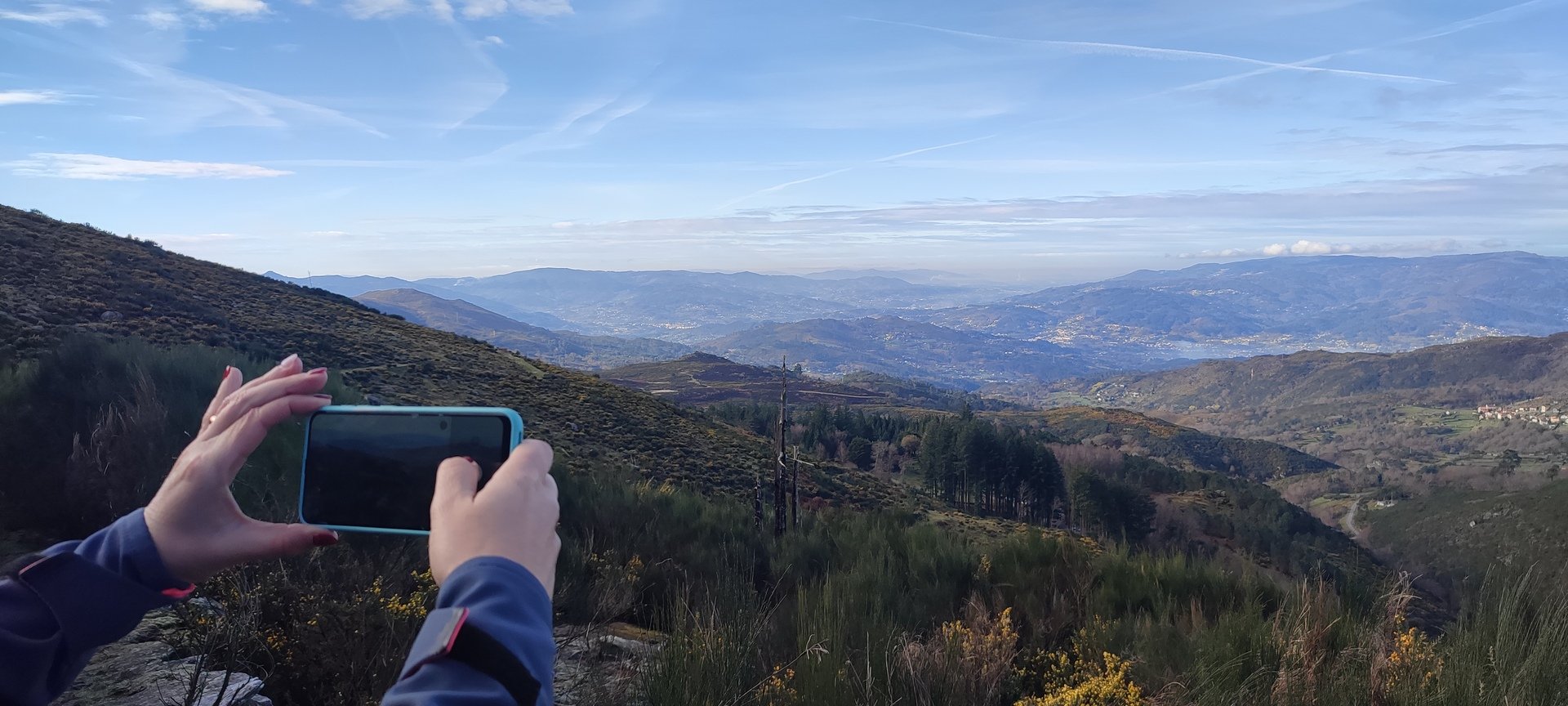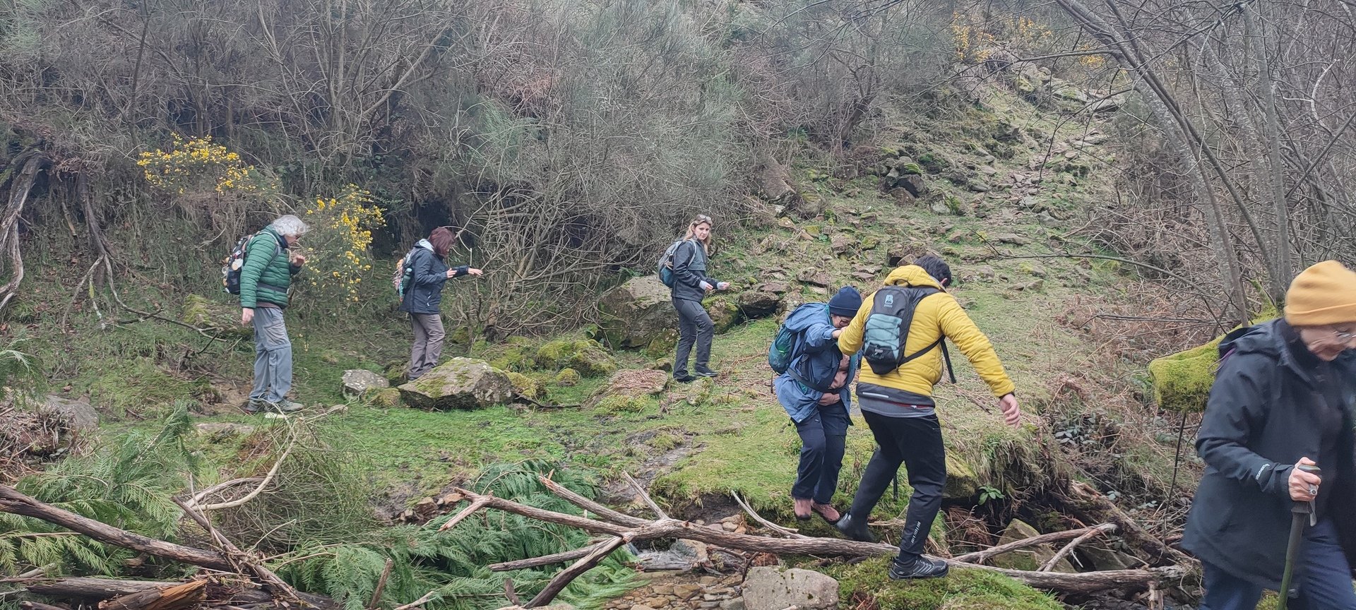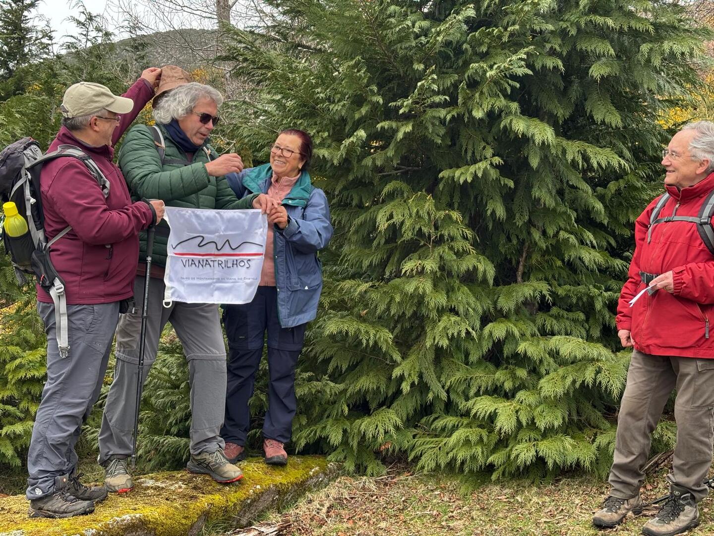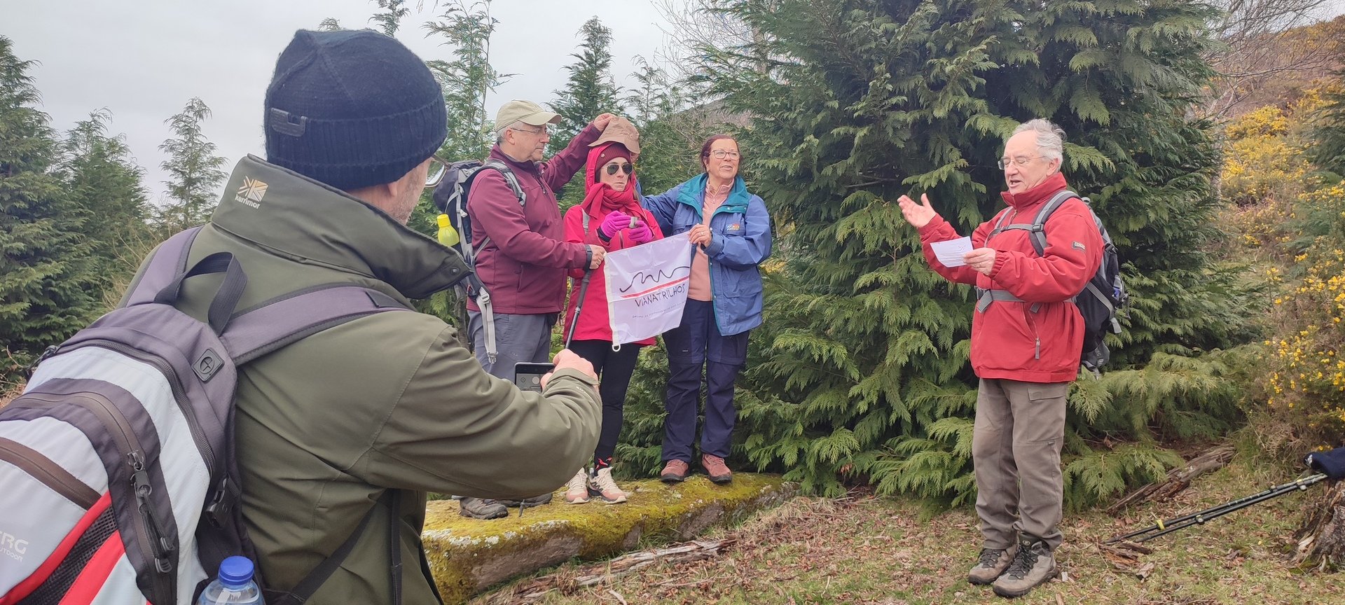 Começámos a descida por um caminho algo difícil pois as chuvas terão arrastado a terra, deixando-o muito pedregoso. Tendo em frente o Vale do Lima onde o rio que lhe deu o nome parecia um espelho em forma de serpente, descemos até uma pequena floresta, local aprazível para descansar e onde se procedeu à cerimónia de batismo dos 7 novos companheiros de caminhada, sendo eles, por ordem de batismo: Judite Neiva, Juca Ferraz, Ana Borlido, Célia Ribeiro, Pedro Teixeira, João Soares e Adelina Antunes.