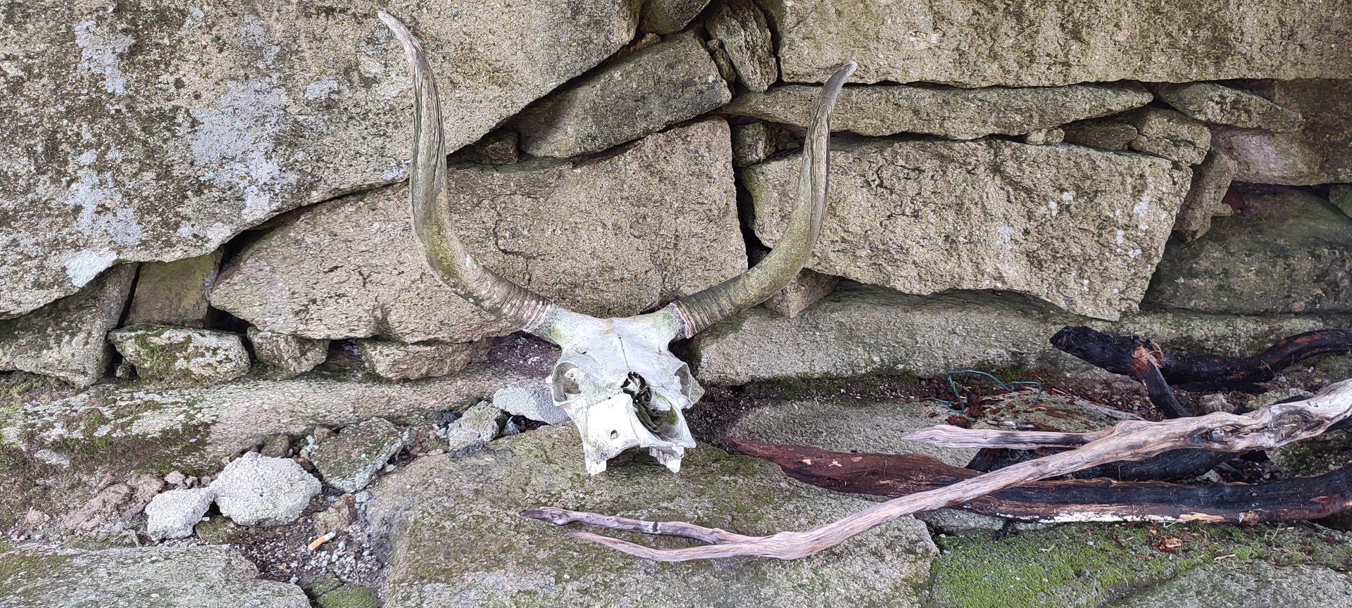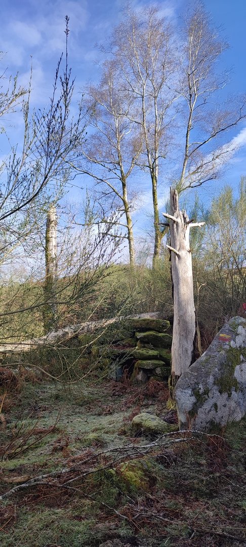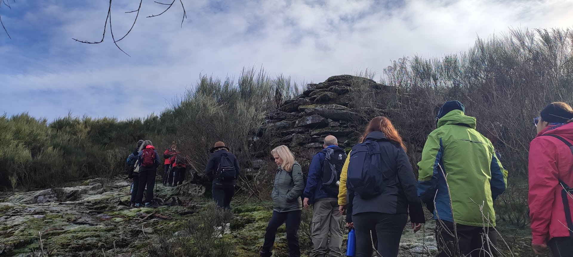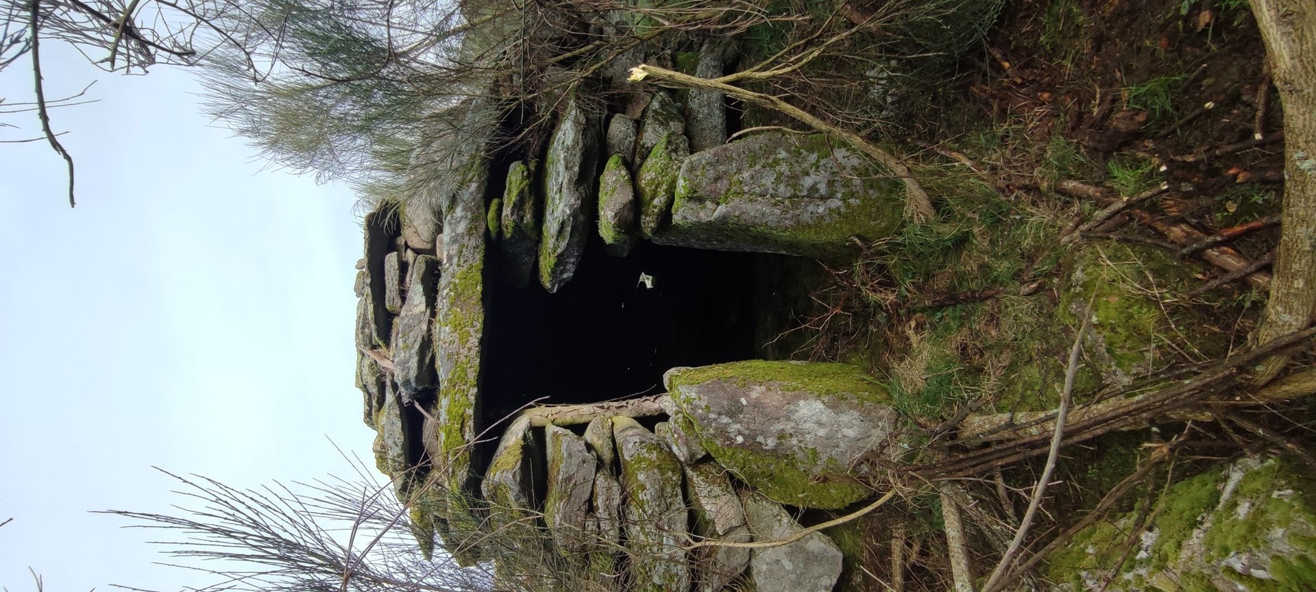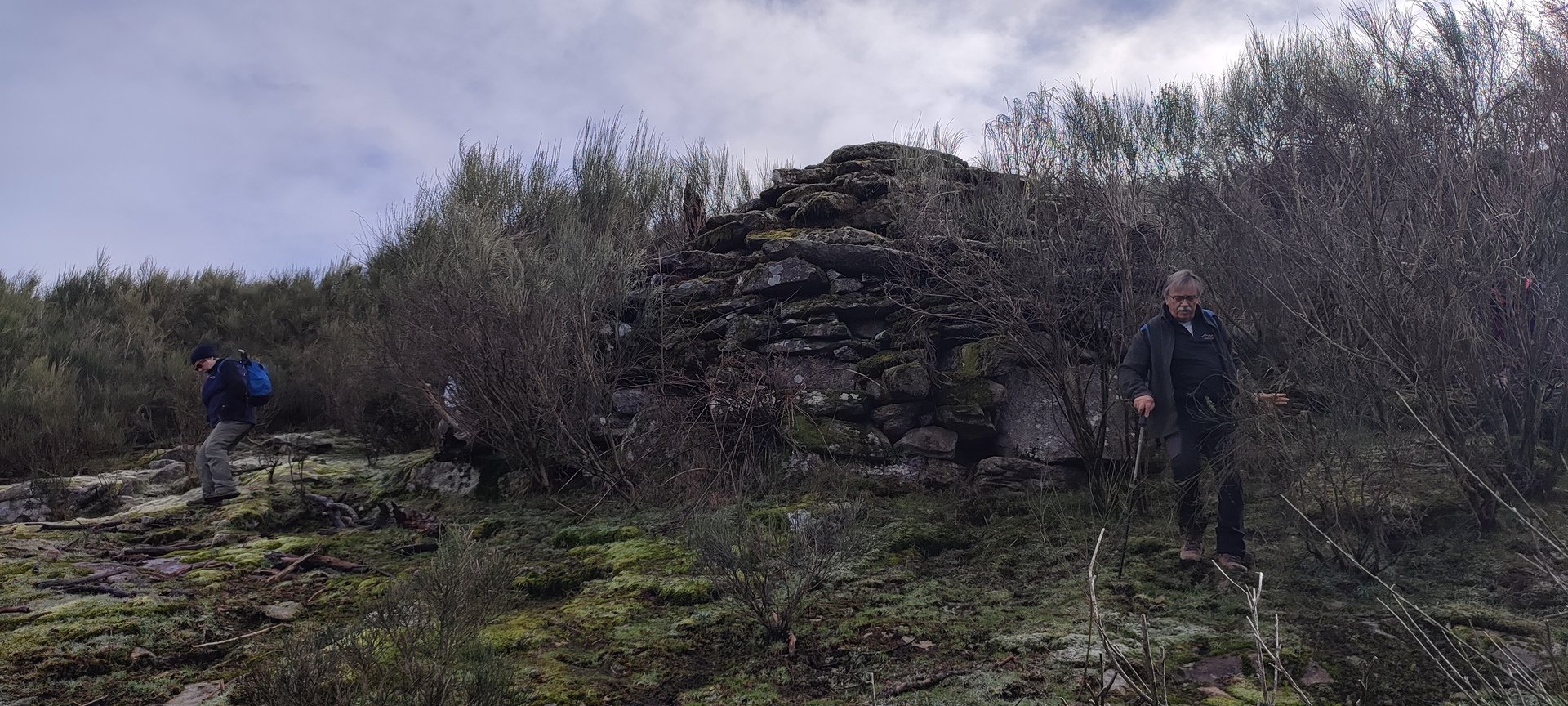 Subindo, serra acima, chegámos junto da Branda de Currais Velhos, que encontrámos envolta em densa vegetação. Outrora estaria sob um extenso pinhal onde o gado e os pastores se refugiavam. Agora, depois de anteriores incêndios e abandono, os cortelhos quase não se veem tapados pelos silvados e outras vegetações invasoras. Mesmo assim, conseguimos fazer um pouco de corta mato e fomos apreciar um cortelho bastante grande e em condições razoáveis, bem escondido.