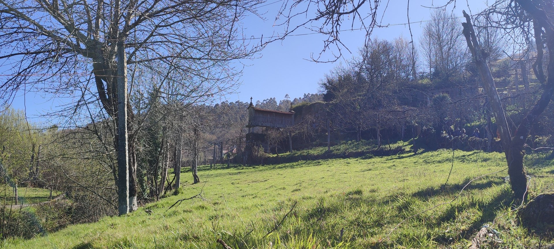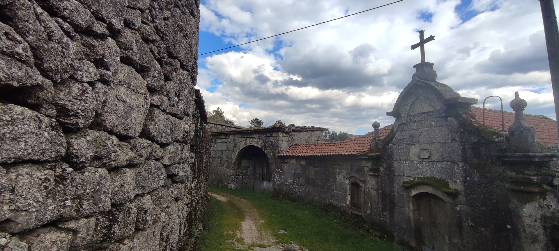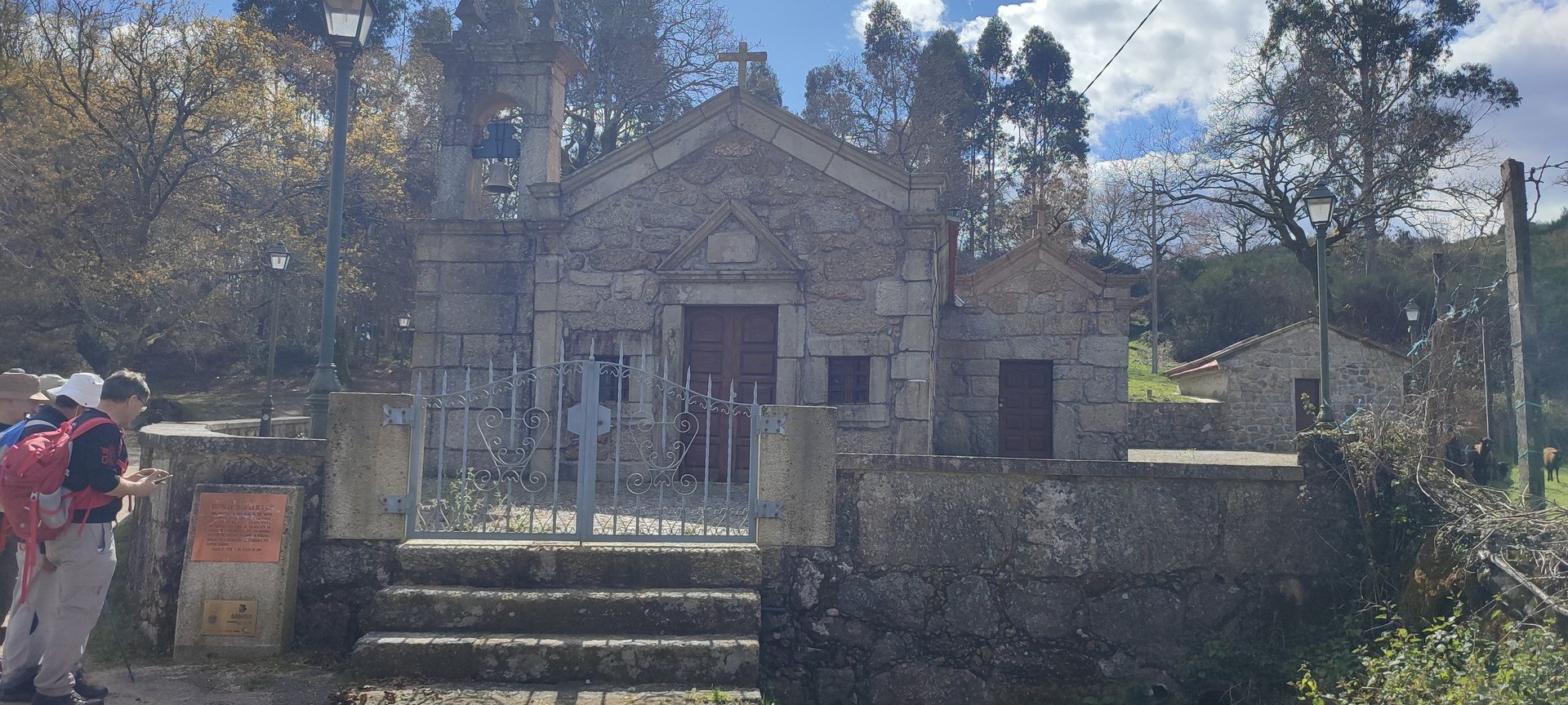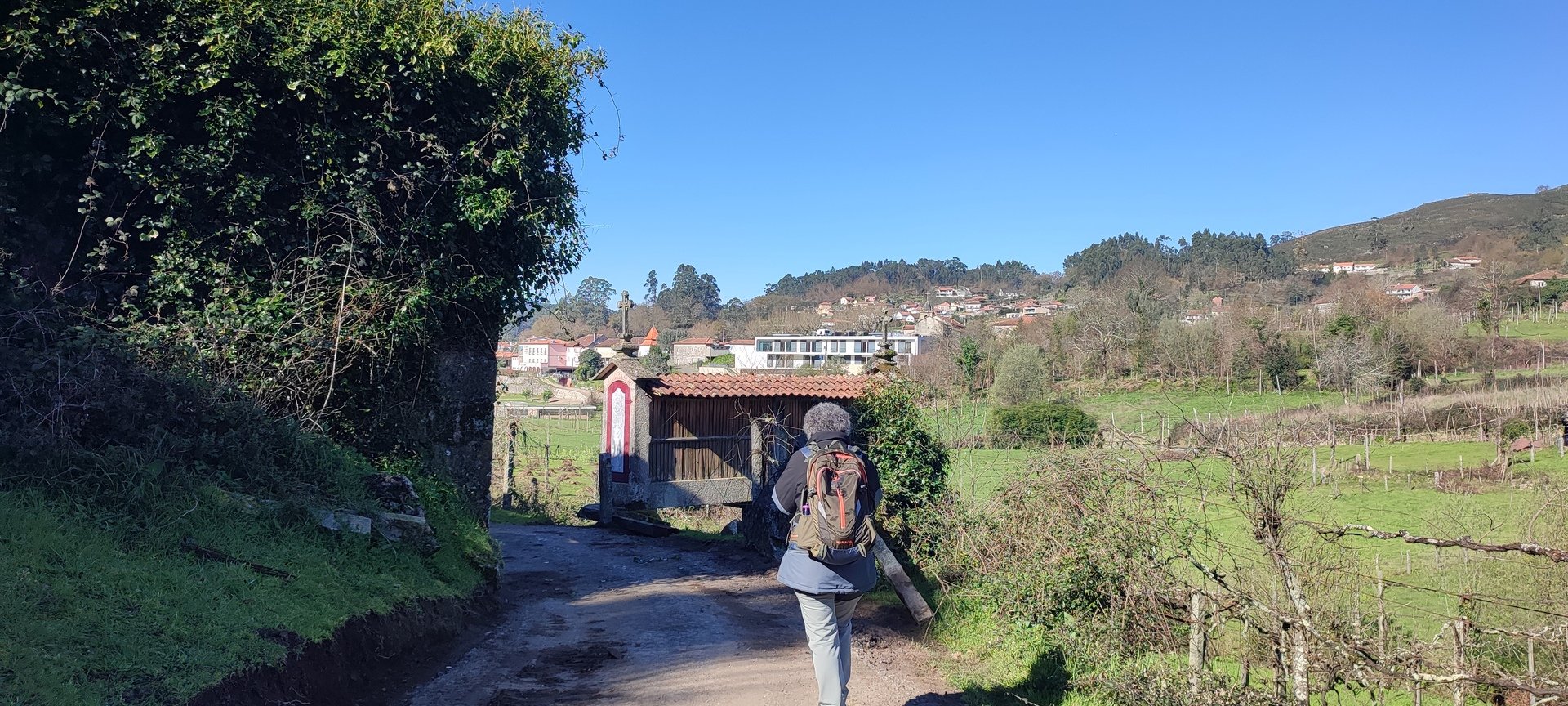 Após o pequeno descanso e com o estômago confortado, recomeçámos o trilho, desta vez a subir, por caminhos rurais onde havia bastante água. Mais adiante entrámos num campo onde está uma criação de galinhas. É privado, mas permite passagem aos utilizadores do trilho desde que abram e voltem a fechar umas cancelas de ferro. Continuámos por caminhos em campos de cultivo e fomos ter a um portão que contornámos para passar, continuando até à Capela da Senhora do Amparo, no Lugar de Cabo.
