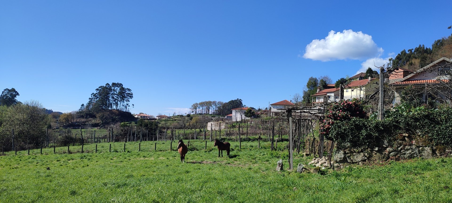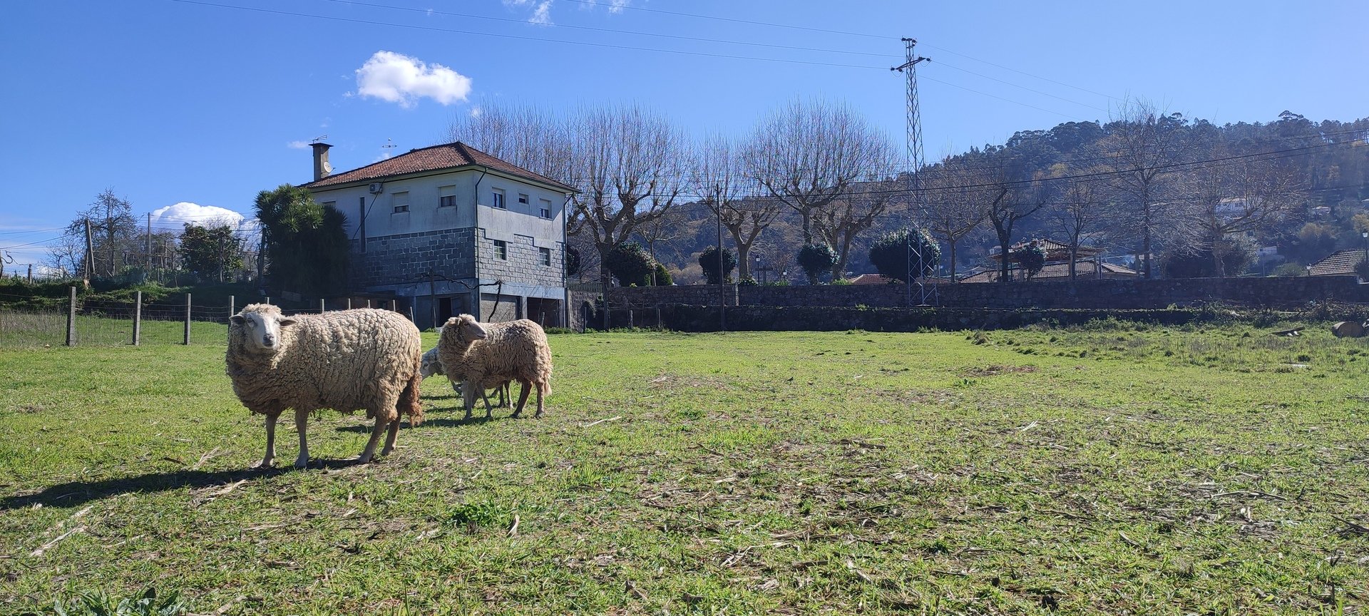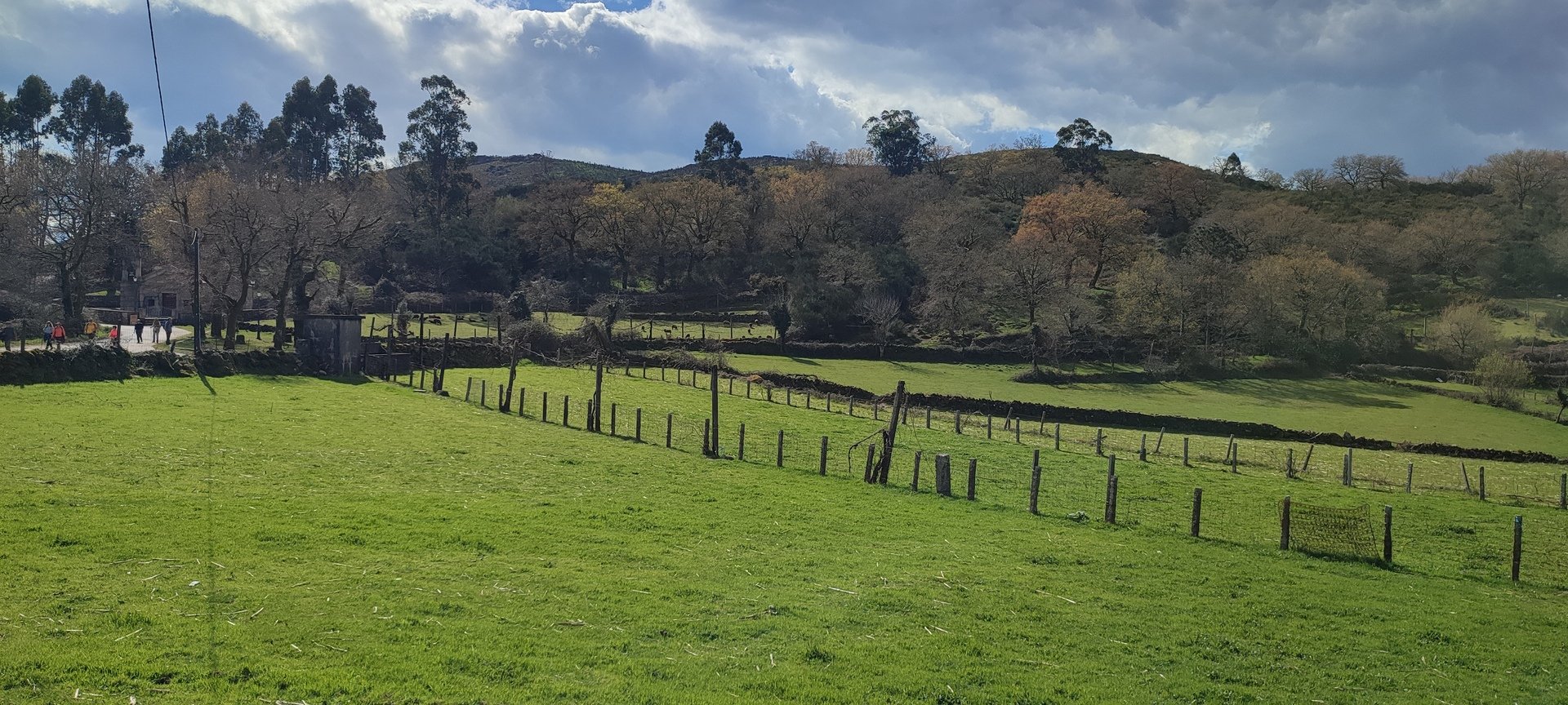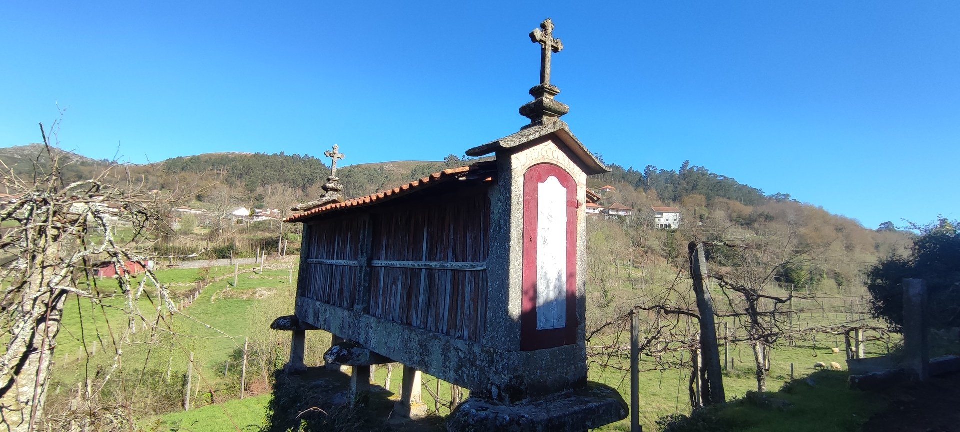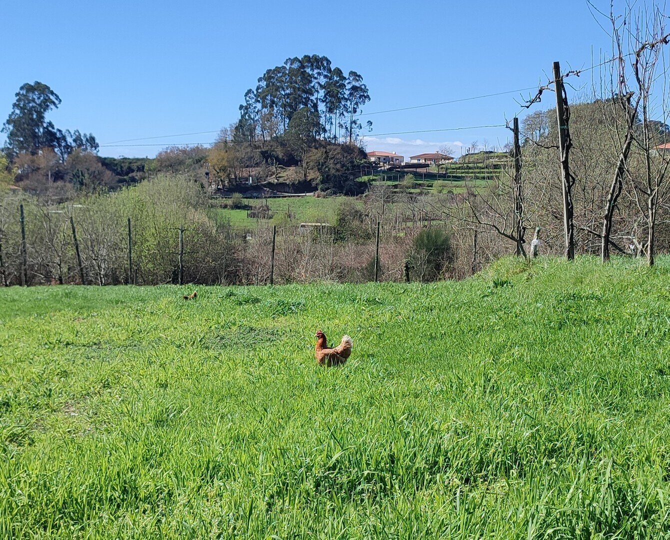 Após o pequeno descanso e com o estômago confortado, recomeçámos o trilho, desta vez a subir, por caminhos rurais onde havia bastante água. Mais adiante entrámos num campo onde está uma criação de galinhas. É privado, mas permite passagem aos utilizadores do trilho desde que abram e voltem a fechar umas cancelas de ferro. Continuámos por caminhos em campos de cultivo e fomos ter a um portão que contornámos para passar, continuando até à Capela da Senhora do Amparo, no Lugar de Cabo.