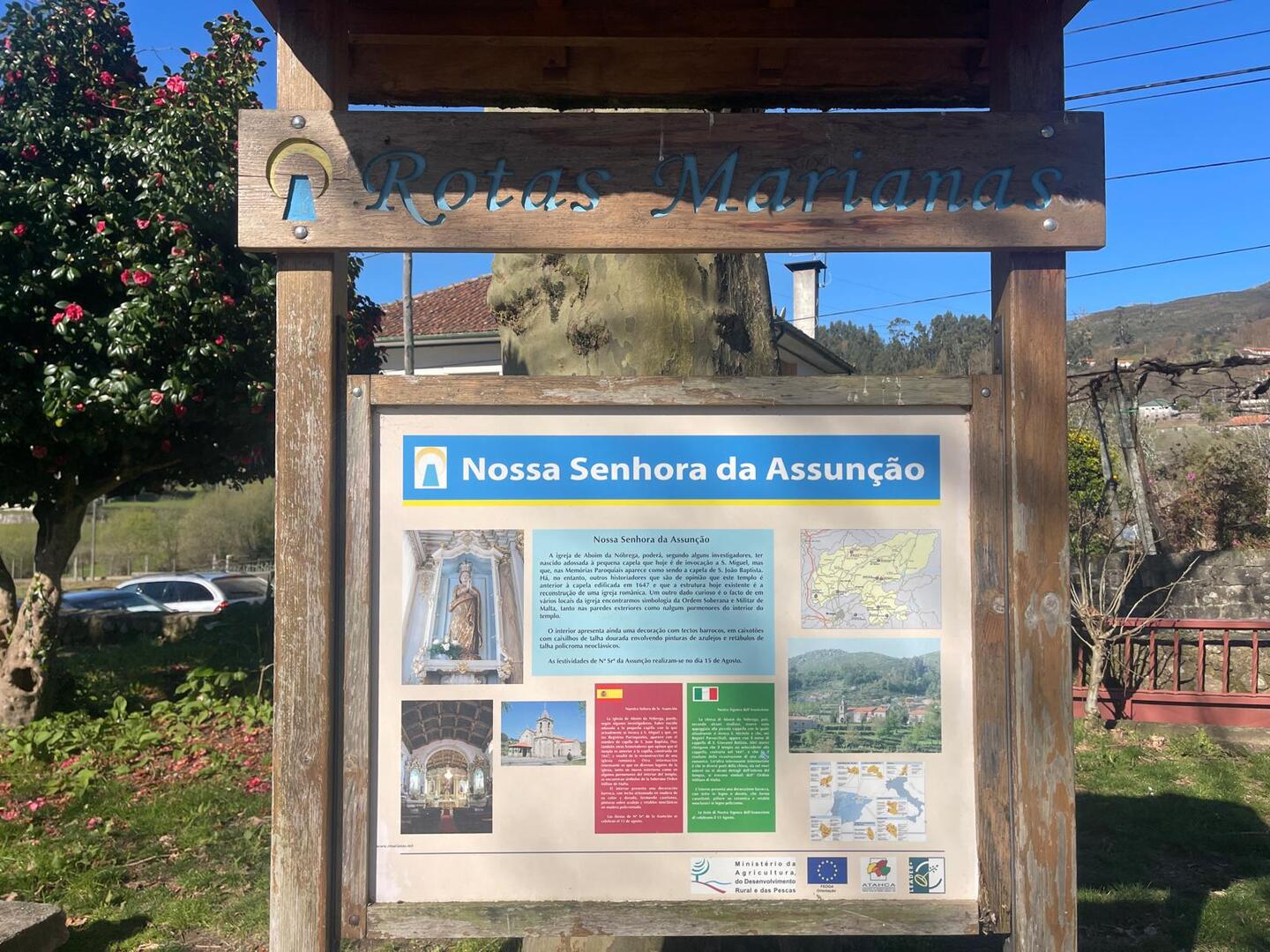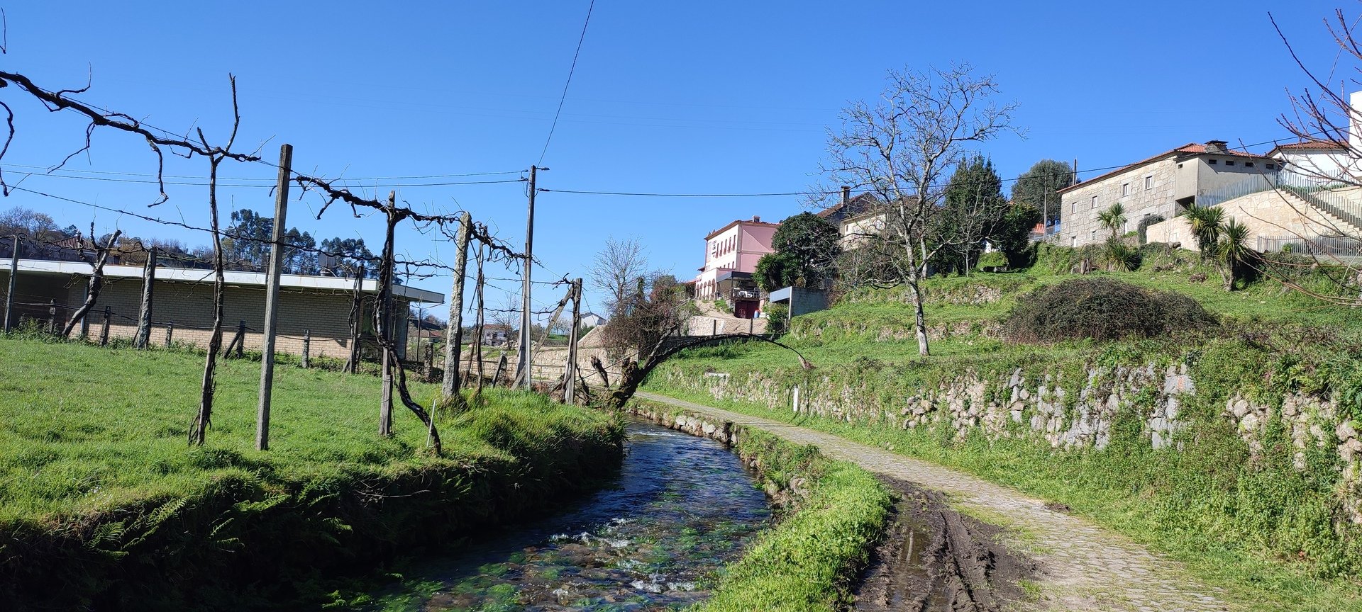 Continuando a caminhar, voltámos a cruzar o rio Vade, desta feita por uma pequena ponte, a Ponte da Quelha de Frades. O troço que nos trouxe até aqui, desde o Parque de Campismo, faz parte da Via Mariana que abandonámos ao desviarmo-nos para o adro da igreja de Nossa Senhora da Assunção onde fizemos a primeira paragem para comer a bucha da manhã.