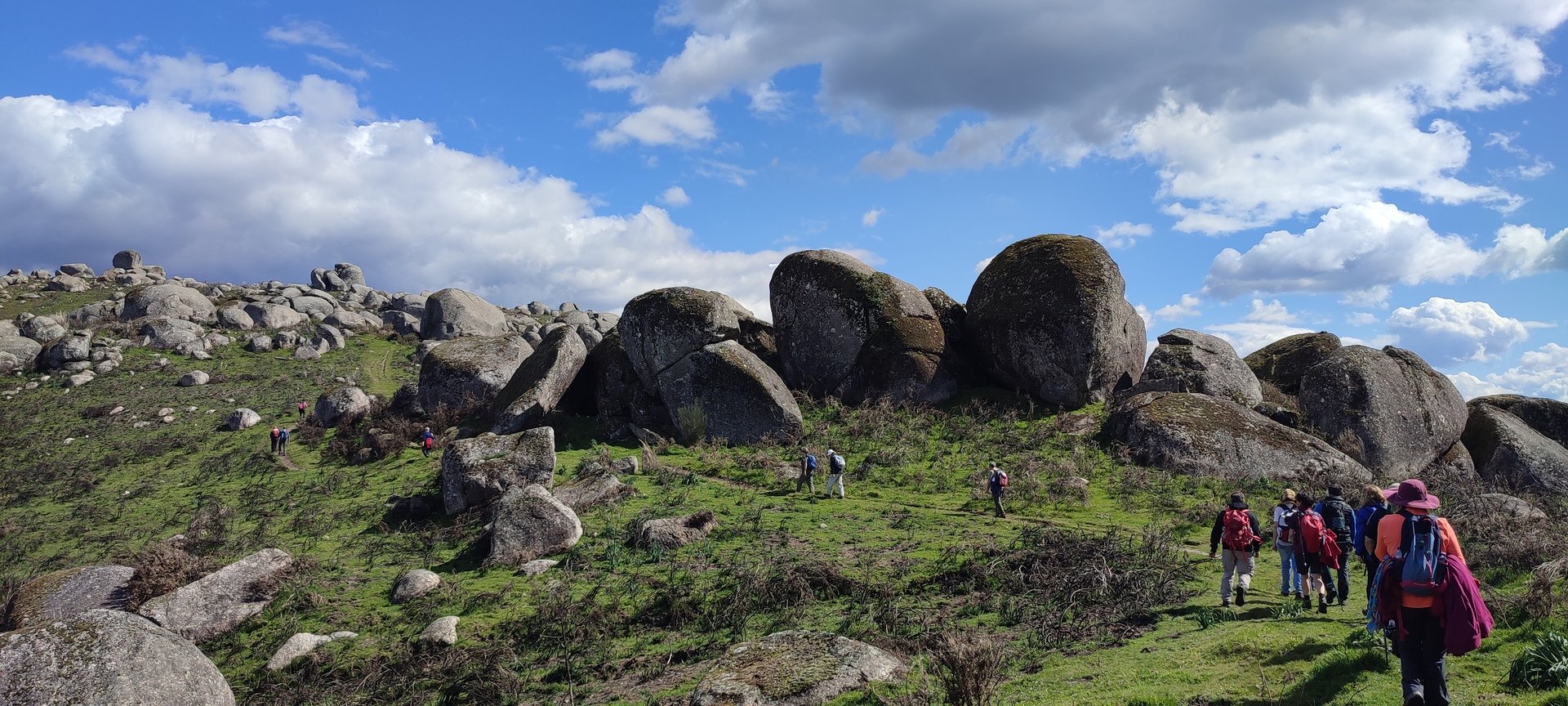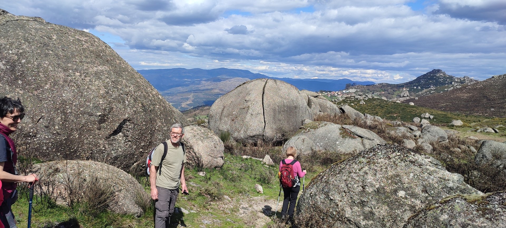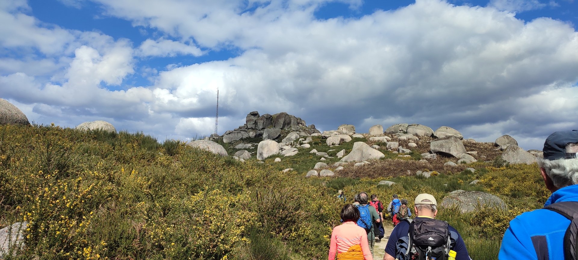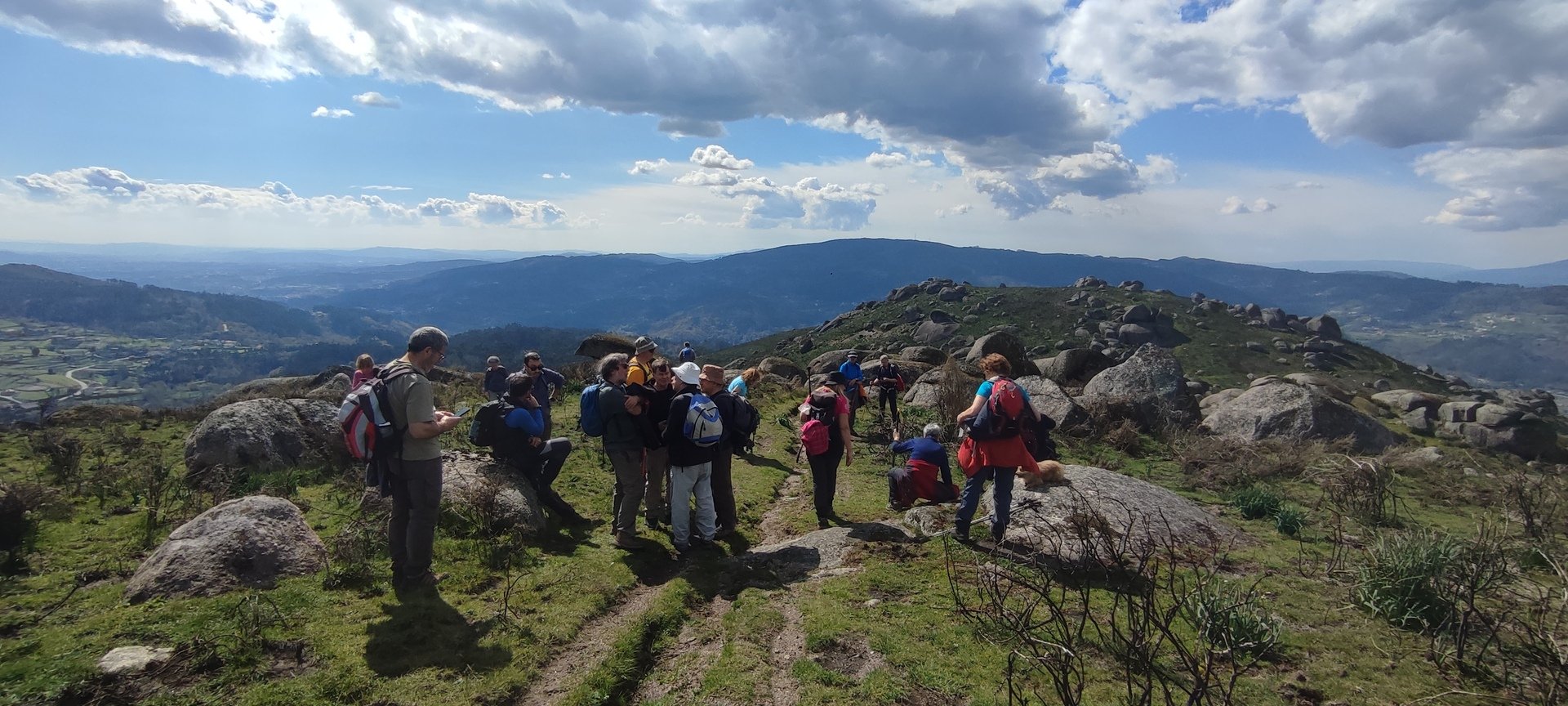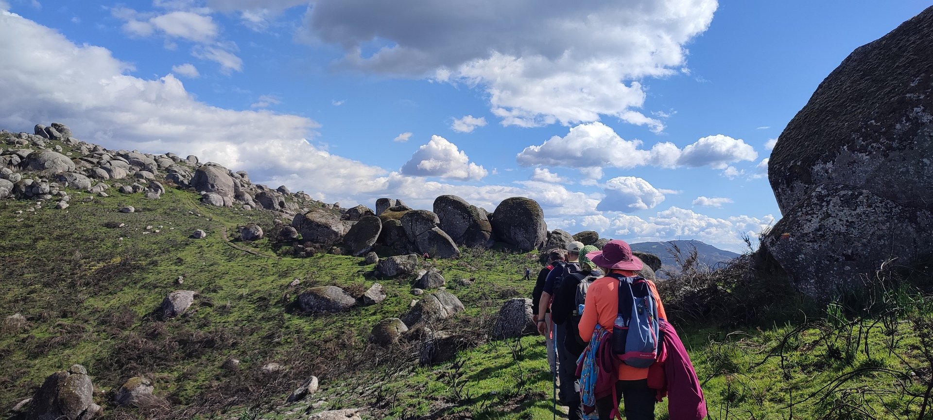 Aproveitou-se para fazer o registo fotográfico do grupo e após o repasto, sem esquecer o café e algum produto alcoólico para lavar a chávena, seguimos por um carreiro de montanha por sinal lindíssimo, sempre bordeado por um exército de penedos de diferentes formas e tamanhos conforme a vontade do fenómeno que os formou.