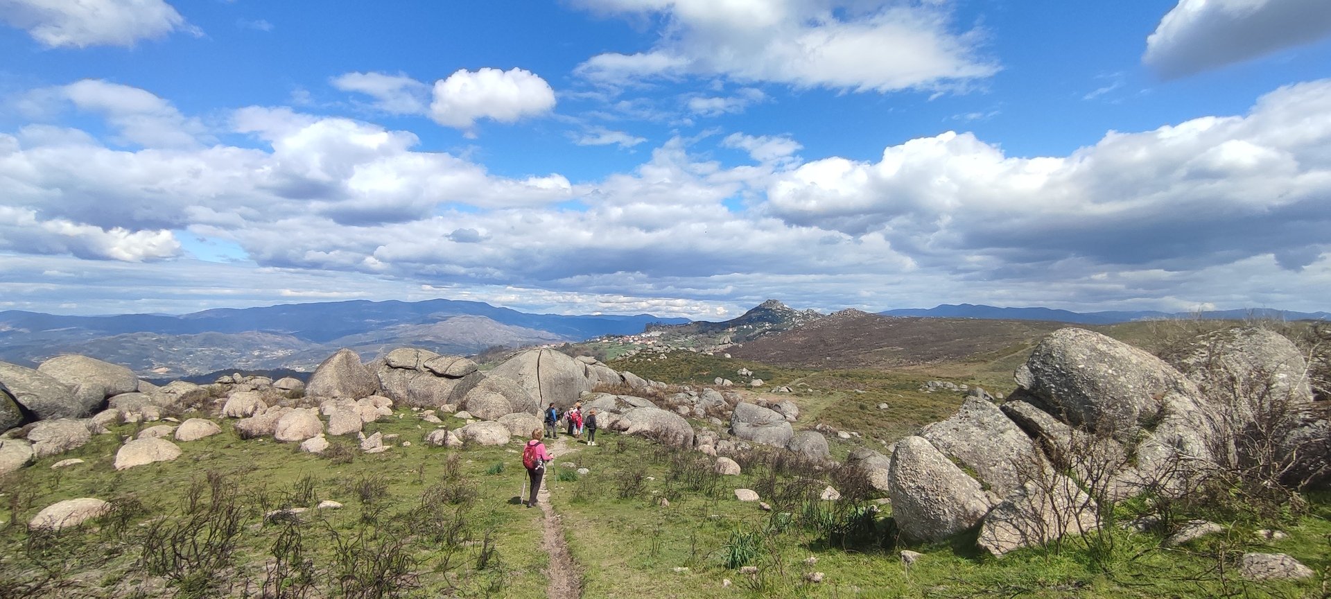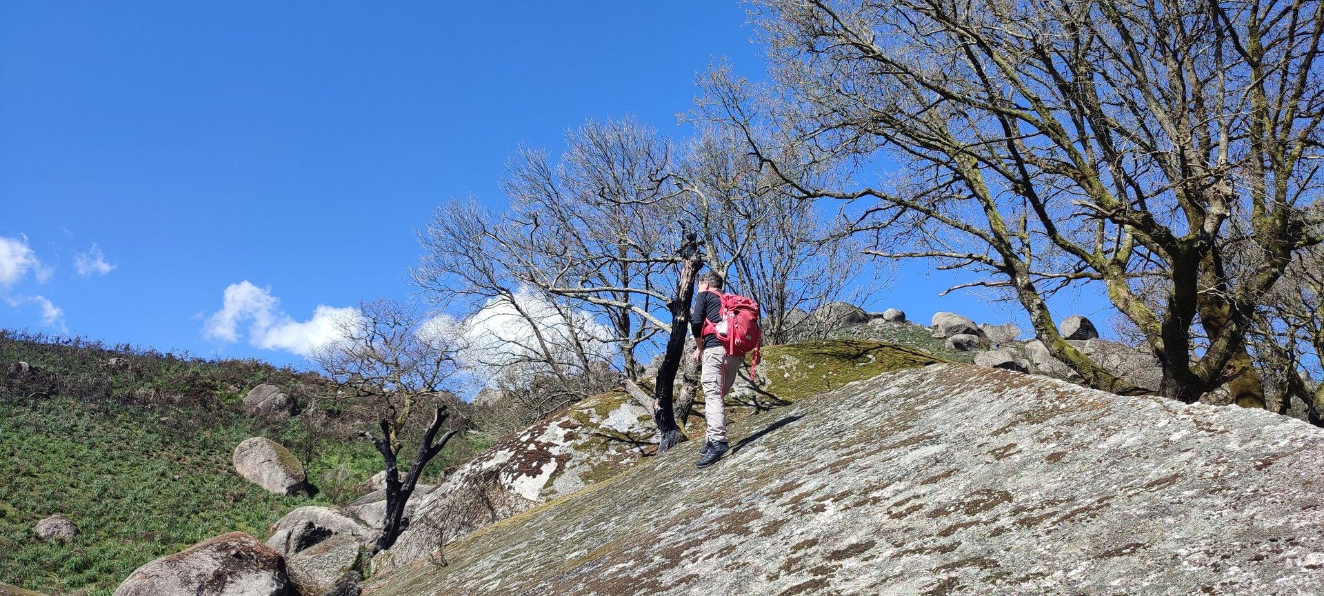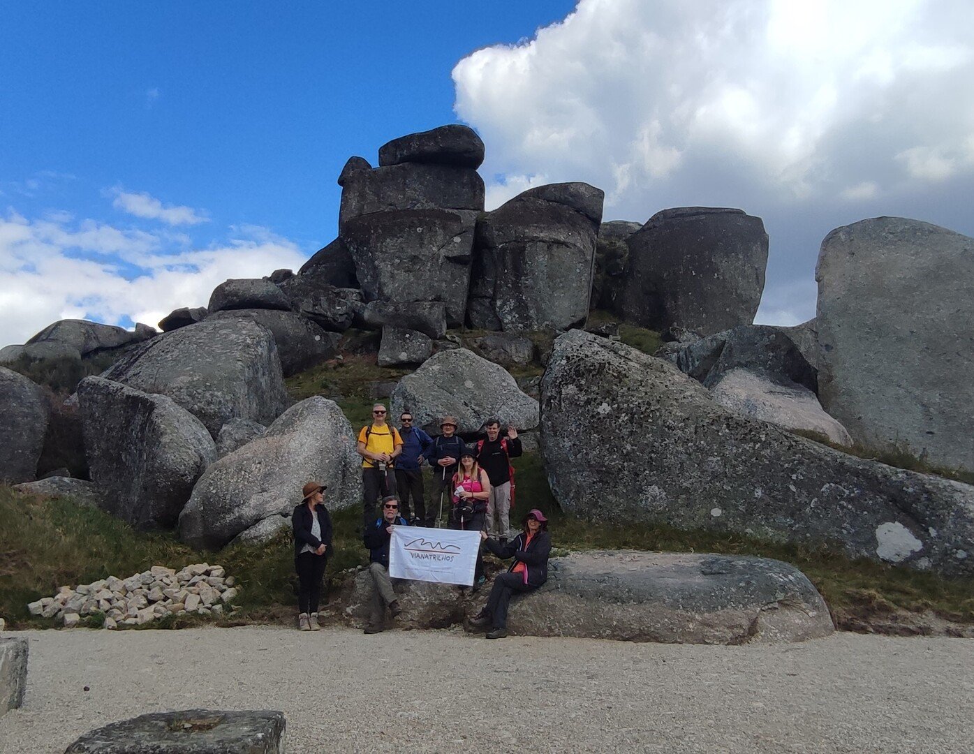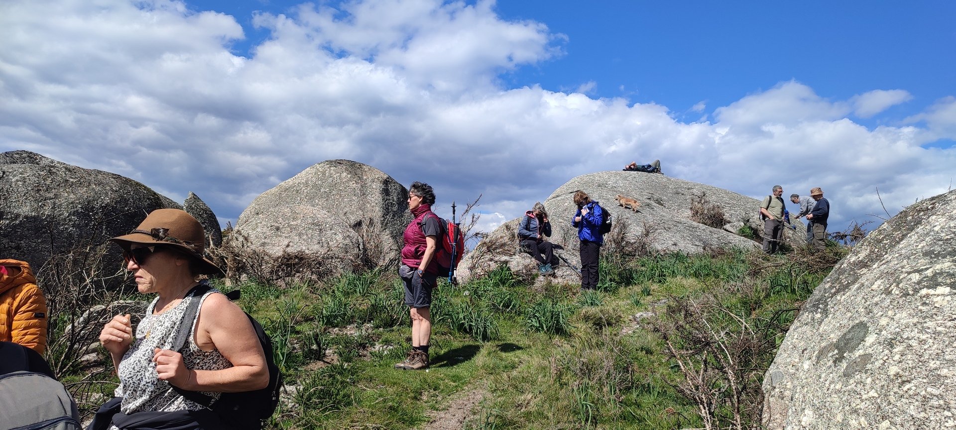 Aproveitou-se para fazer o registo fotográfico do grupo e após o repasto, sem esquecer o café e algum produto alcoólico para lavar a chávena, seguimos por um carreiro de montanha por sinal lindíssimo, sempre bordeado por um exército de penedos de diferentes formas e tamanhos conforme a vontade do fenómeno que os formou.
