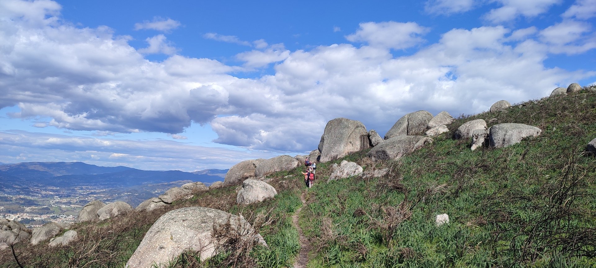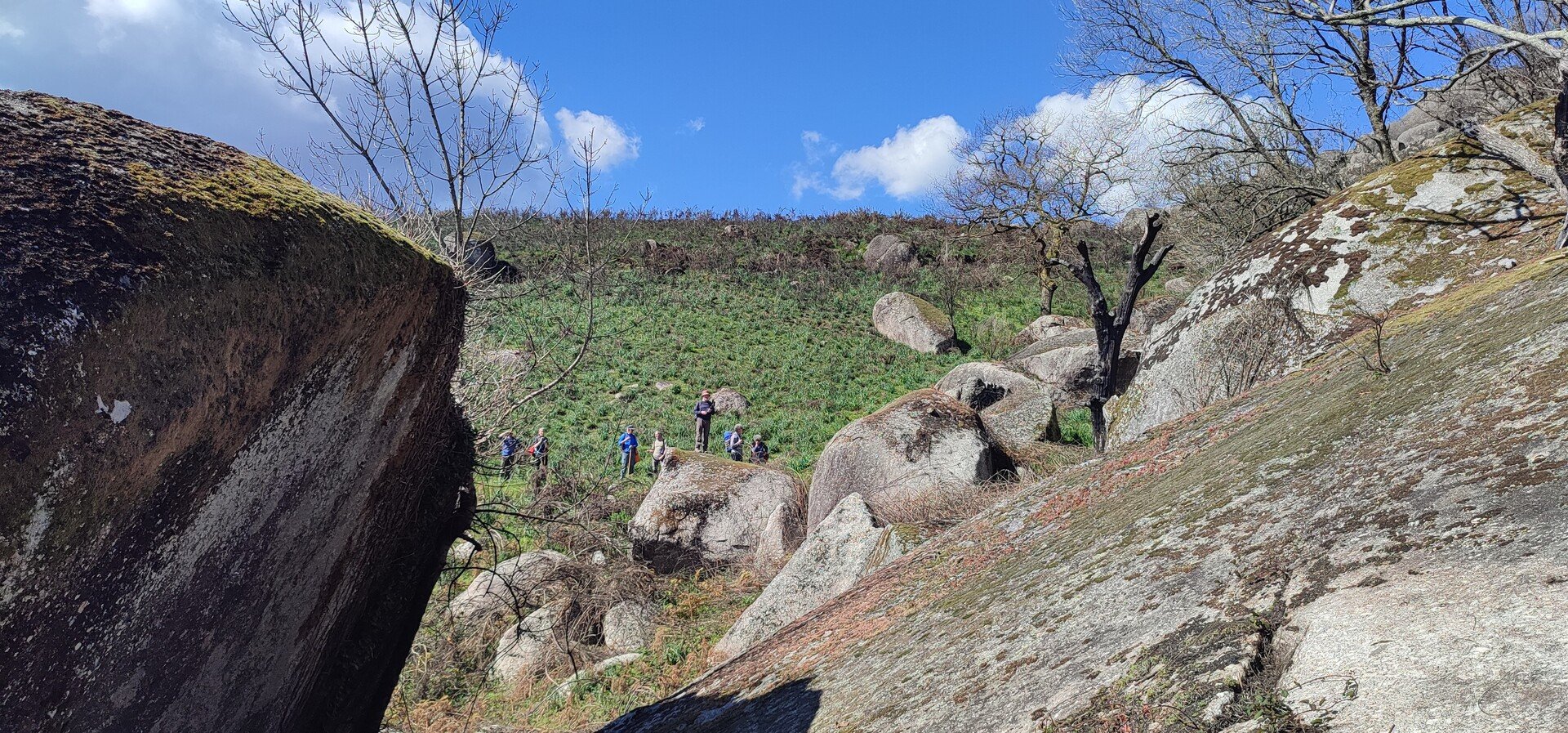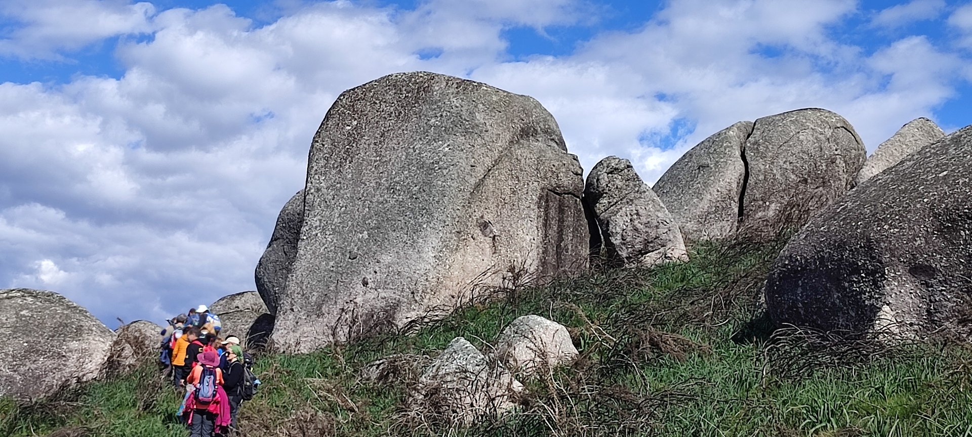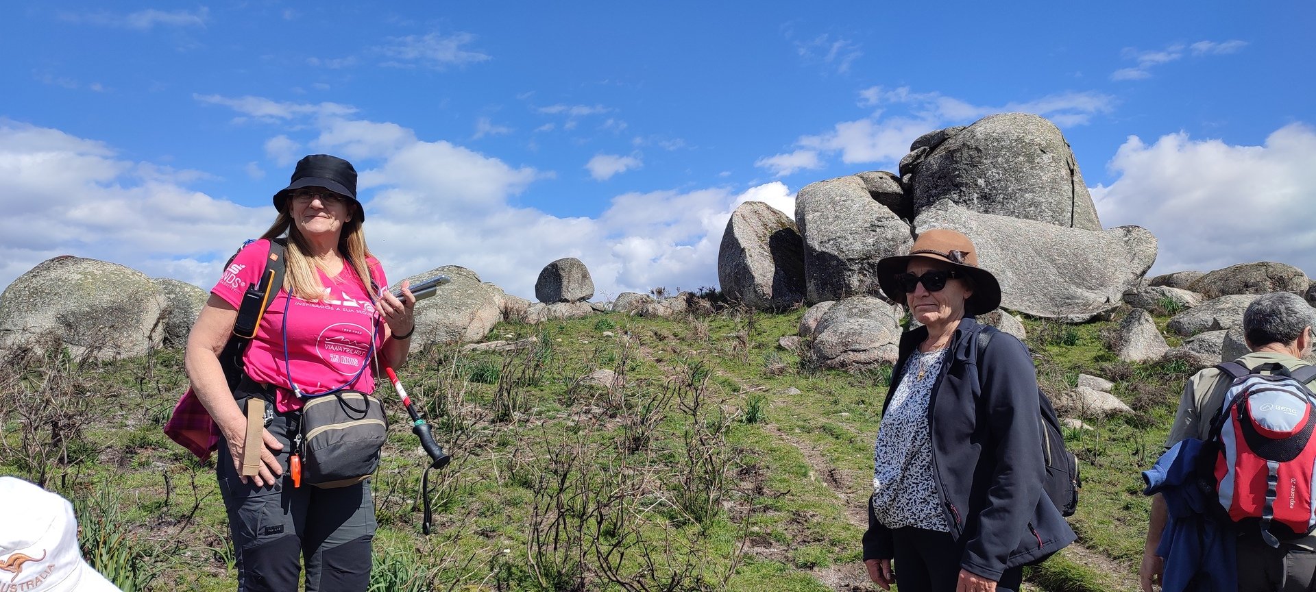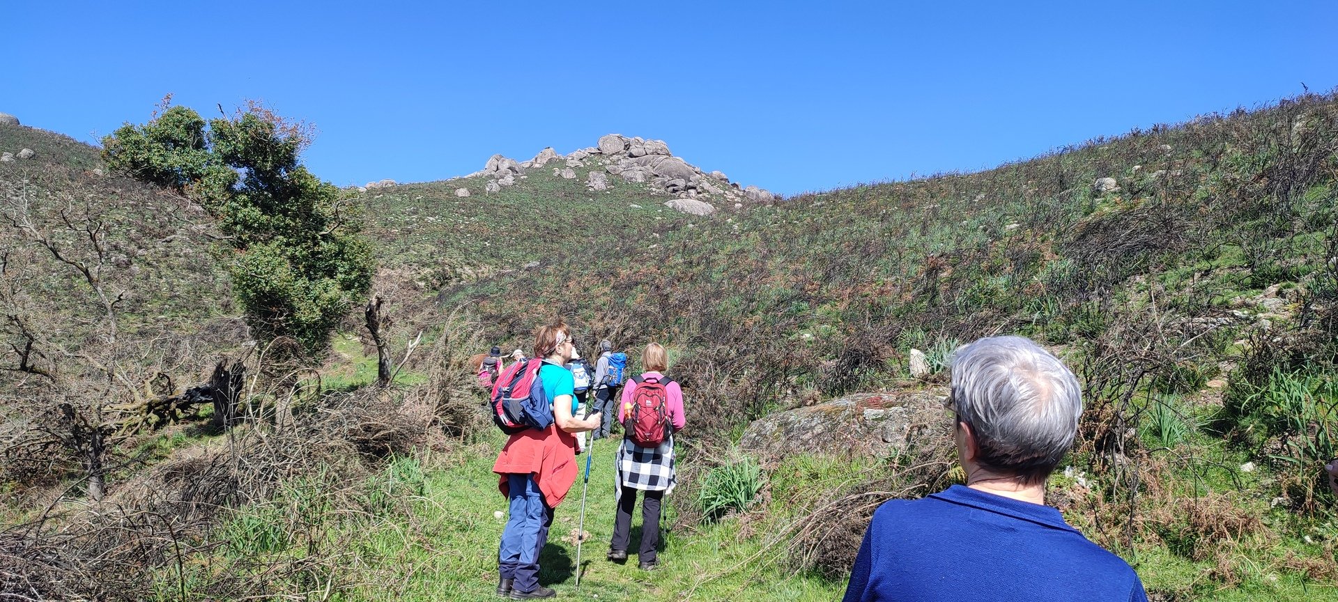 Aproveitou-se para fazer o registo fotográfico do grupo e após o repasto, sem esquecer o café e algum produto alcoólico para lavar a chávena, seguimos por um carreiro de montanha por sinal lindíssimo, sempre bordeado por um exército de penedos de diferentes formas e tamanhos conforme a vontade do fenómeno que os formou.