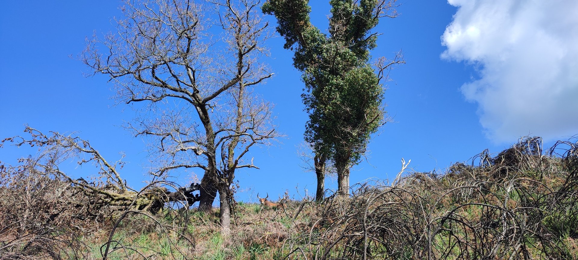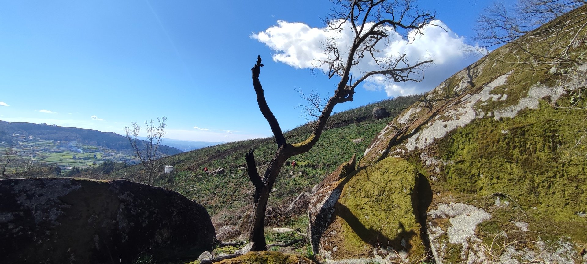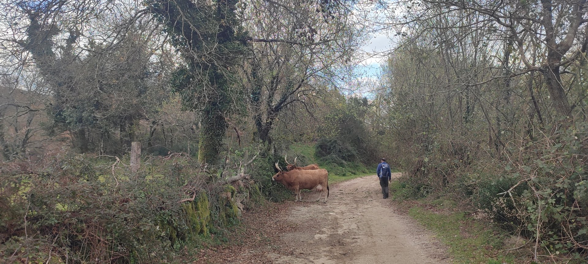 Voltámos ao Lugar de Fonte Mulhe e continuámos serra acima por um trilho serrano. No meio da passagem do trilho, um possante boi pastava e mostrou o seu desagrado pela nossa presença bufando um pouco. Hesitámos, decidimos aguardar que o bicho se afastasse o que foi fazendo muito vagarosamente. De repente aparece a Elsa a caminhar na direção da fera, decidida a acabar com aquele impasse. Perante esta situação imprevista, o bovino ficou desconfiado mas quieto e assim passámos todos sob o olhar atónito do animal.
