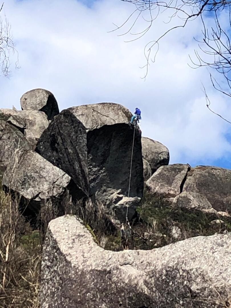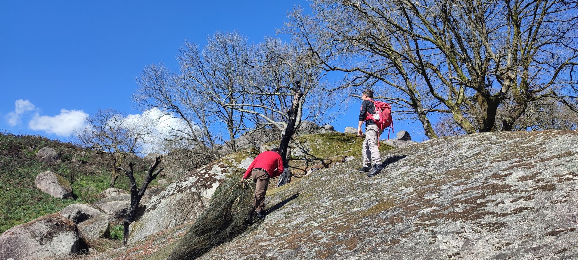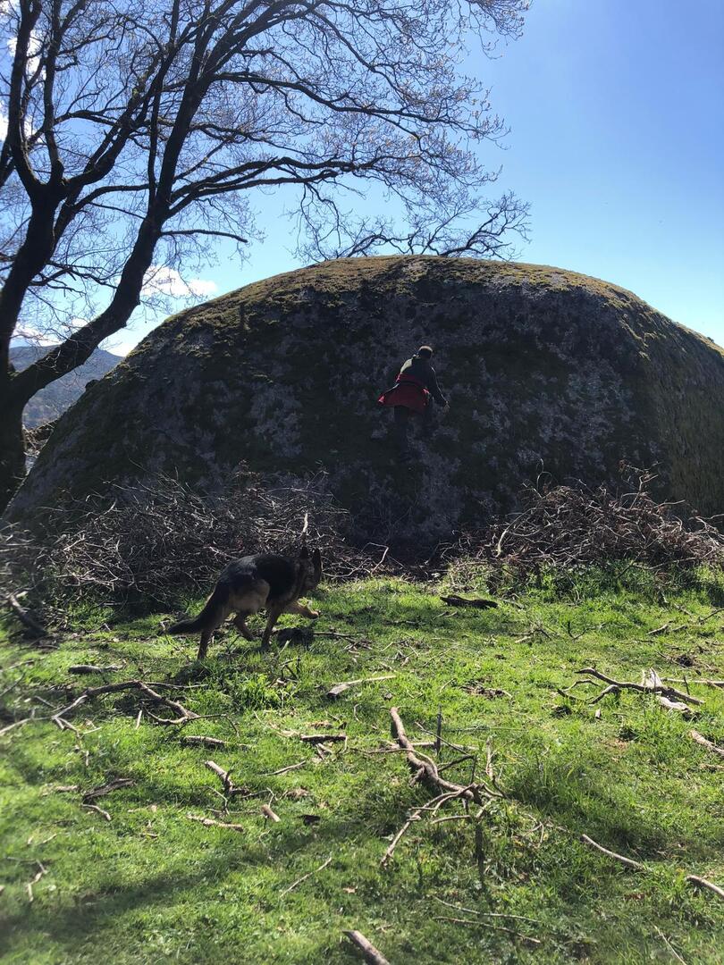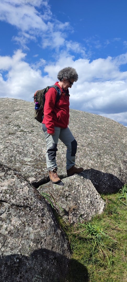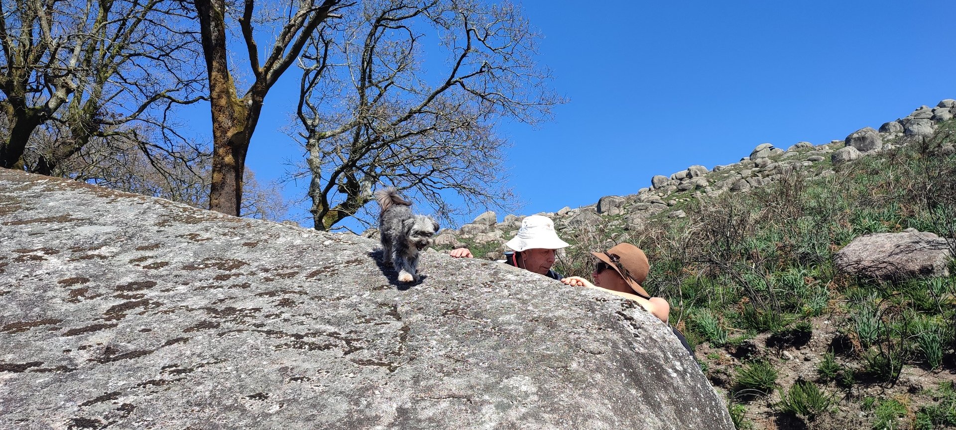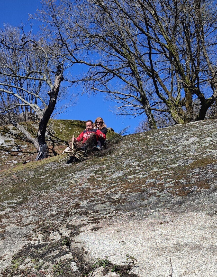 Trata-se de um penedo inclinado e com superfície lisa onde os naturais da zona se divertem a subir a pé, descendo a escorregar sentados em ramos de giesta. Apesar de todos terem sido convidados a experimentar tal desporto improvisado, apenas três caminheiros aceitaram o desafio do Domingos: Sandrina, Elsa e Sandra. Estão de parabéns e merecem admiração, palmas e um lanche reforçado!