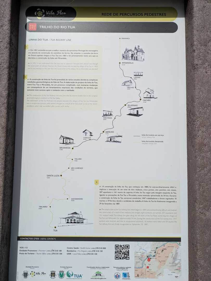 “Esta linha ferroviária estreita que ligava Foz Tua, na Linha do Douro, a Bragança, numa extensão de 134 km, acompanha o percurso sinuoso do Tua desde a sua foz até Mirandela, ao longo da margem esquerda. A partir daí, cruza o planalto transmontano até atingir Bragança. No total, a linha possui 10 túneis, 4 viadutos e 17 pontes. Foi construída em duas fases. As obras do primeiro troço, Foz Tua – Mirandela, começaram em outubro de 1884 e foi inaugurada em 1887, com a presença do rei D. Luís I na cerimónia oficial. O troço Mirandela – Bragança só foi concluído em 1906. A partir de 1990, começaram as supressões na utilização da via e, no final de 1991, foi encerrado o troço entre Mirandela e Bragança.”