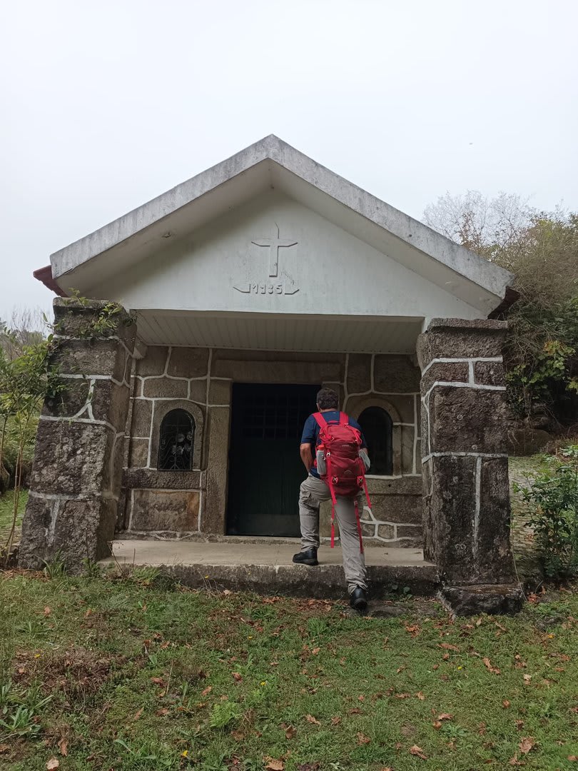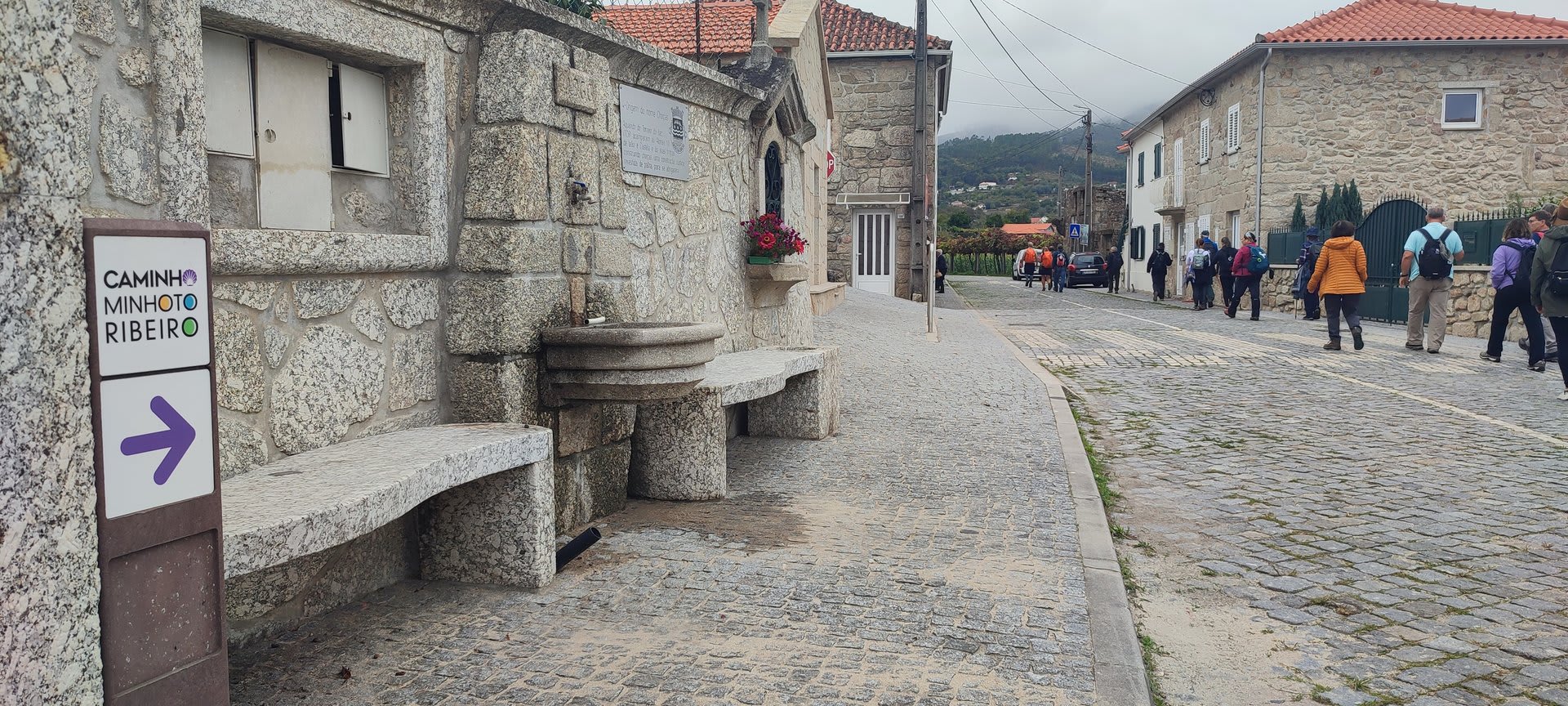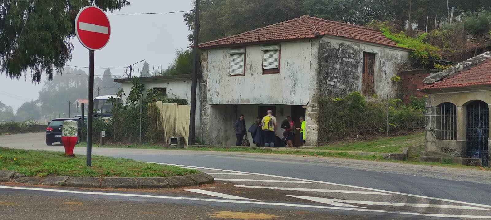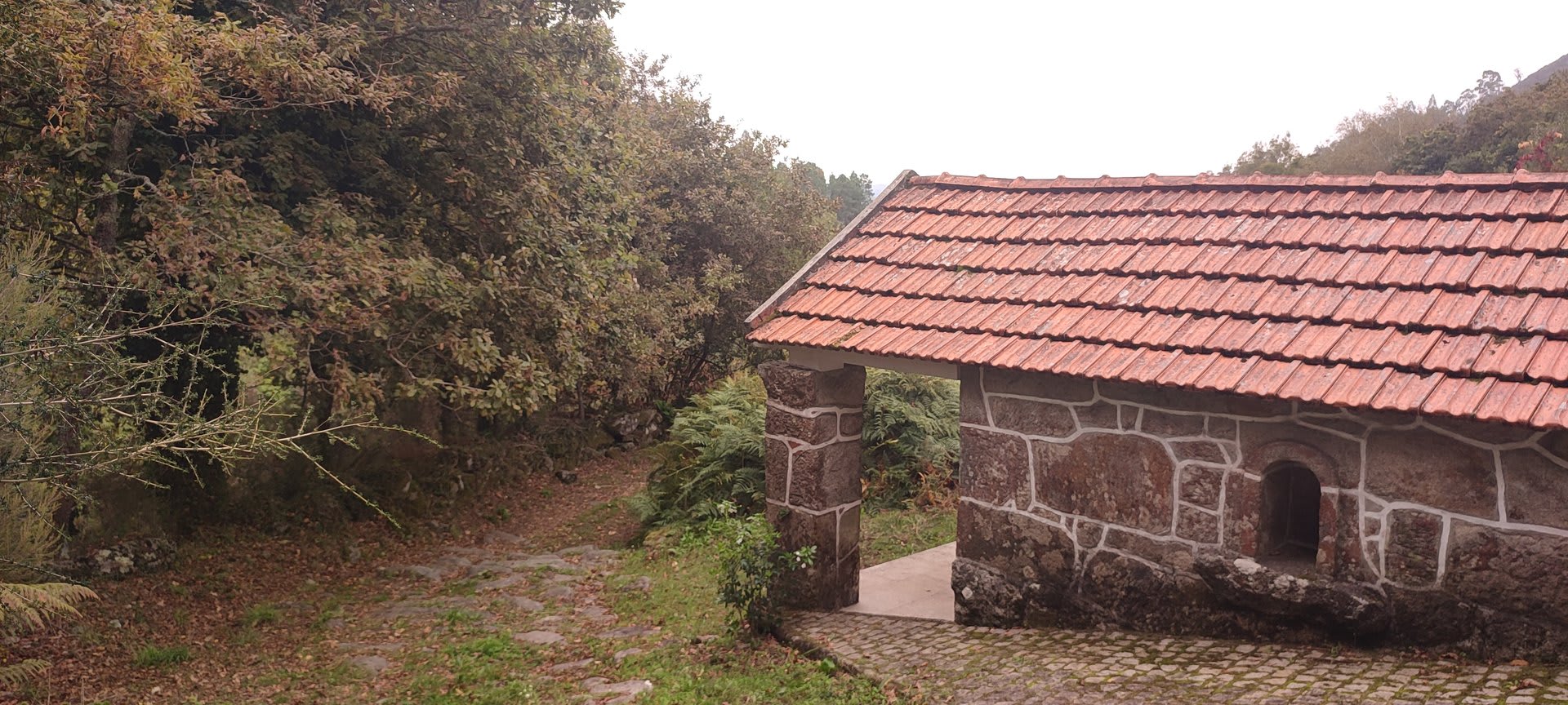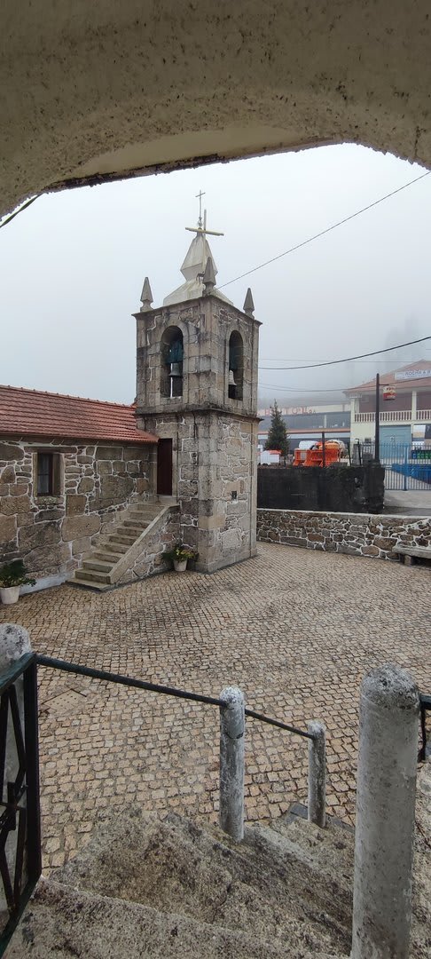 Sempre acompanhados da chuva miudinha, junto à igreja paroquial, abrigados debaixo do coreto e de um pequeno alpendre, fizemos o reabastecimento e merecido descanso.