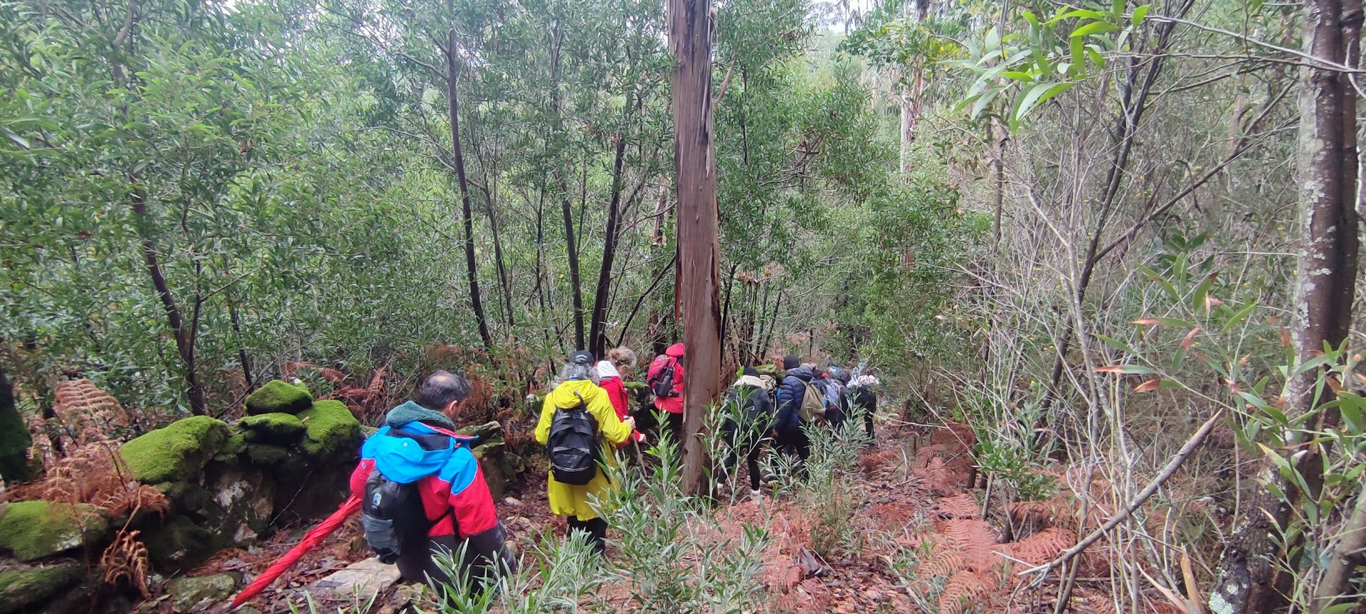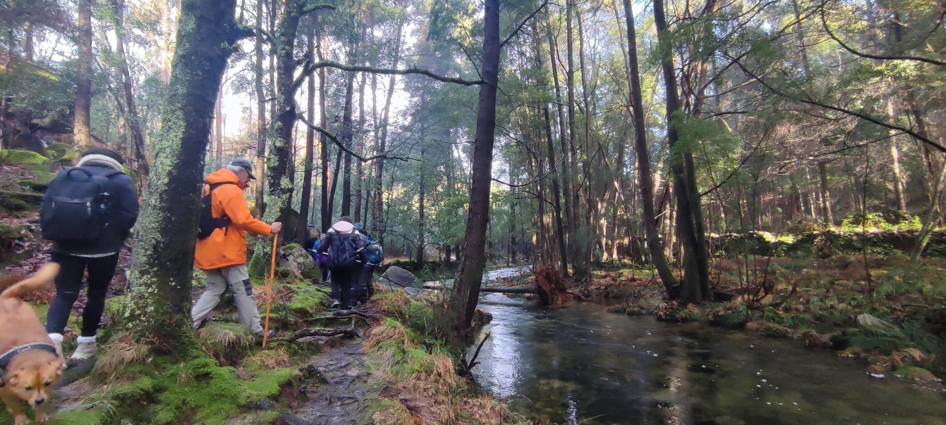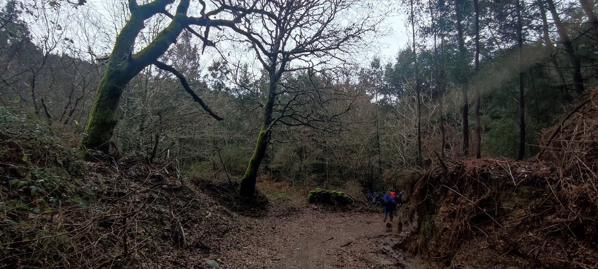 Sempre subindo pelo estreito e sinuoso carreiro, embrenhados na floresta, a breve trecho abandonámos o rio e fizemos uma íngreme subida até atingir o alto de uma portela. De seguida, descemos sobre lajes de granito até atingir um estradão florestal que, vindo da Montaria, leva até São João de Arga.
