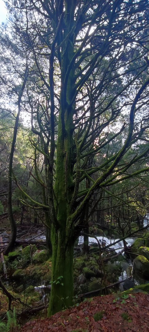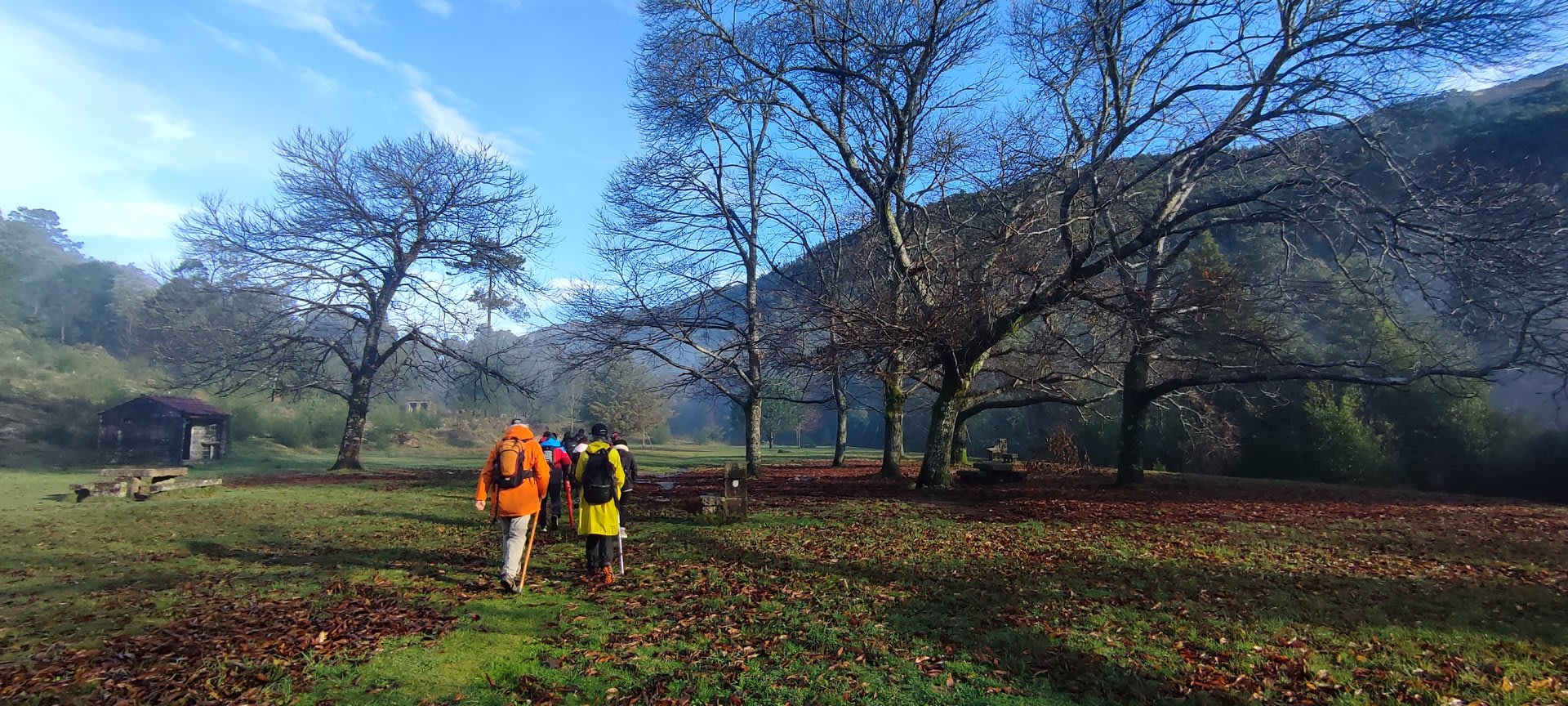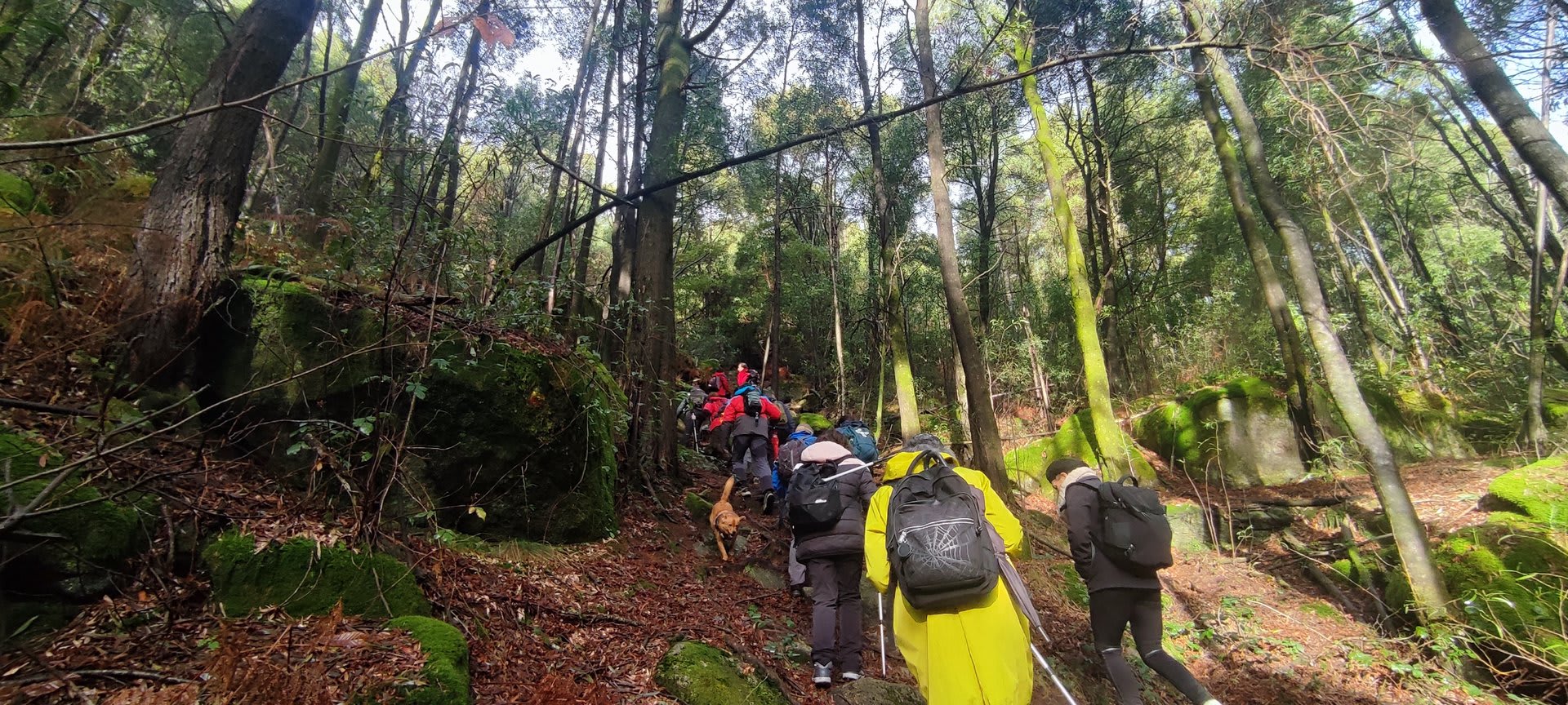 Sempre subindo pelo estreito e sinuoso carreiro, embrenhados na floresta, a breve trecho abandonámos o rio e fizemos uma íngreme subida até atingir o alto de uma portela. De seguida, descemos sobre lajes de granito até atingir um estradão florestal que, vindo da Montaria, leva até São João de Arga.