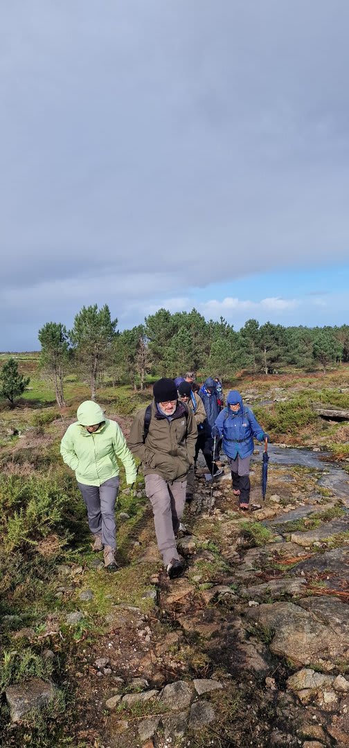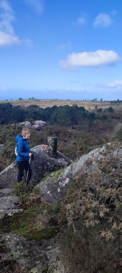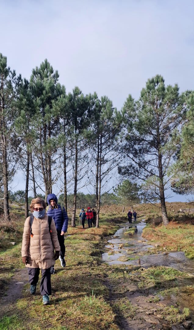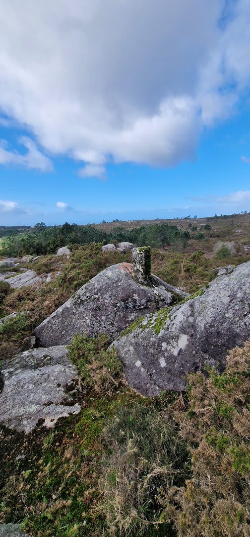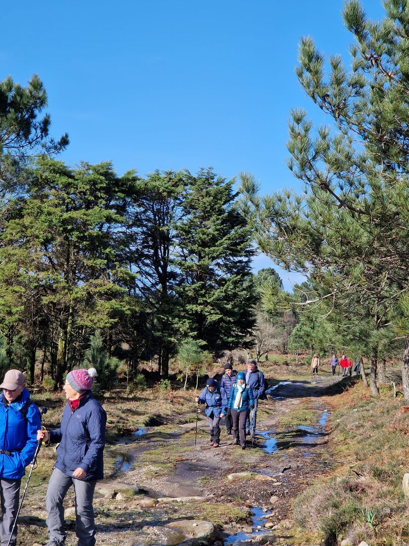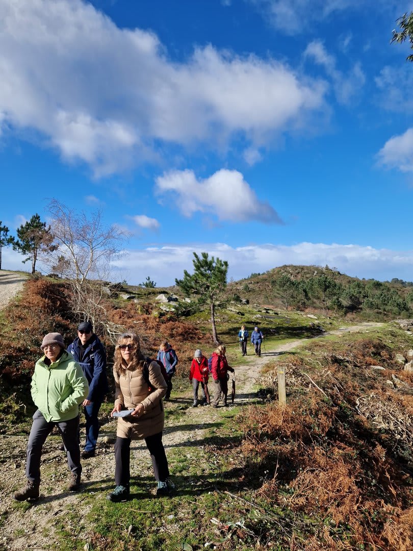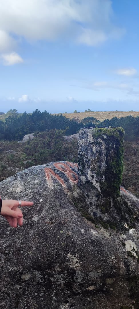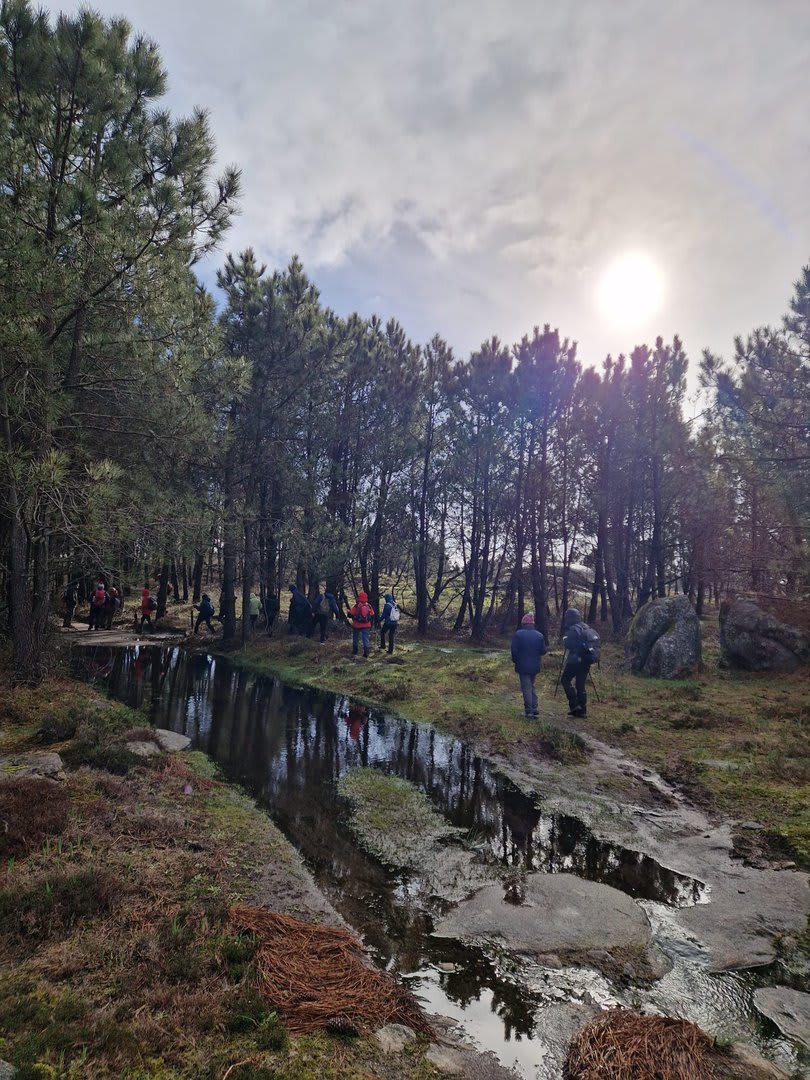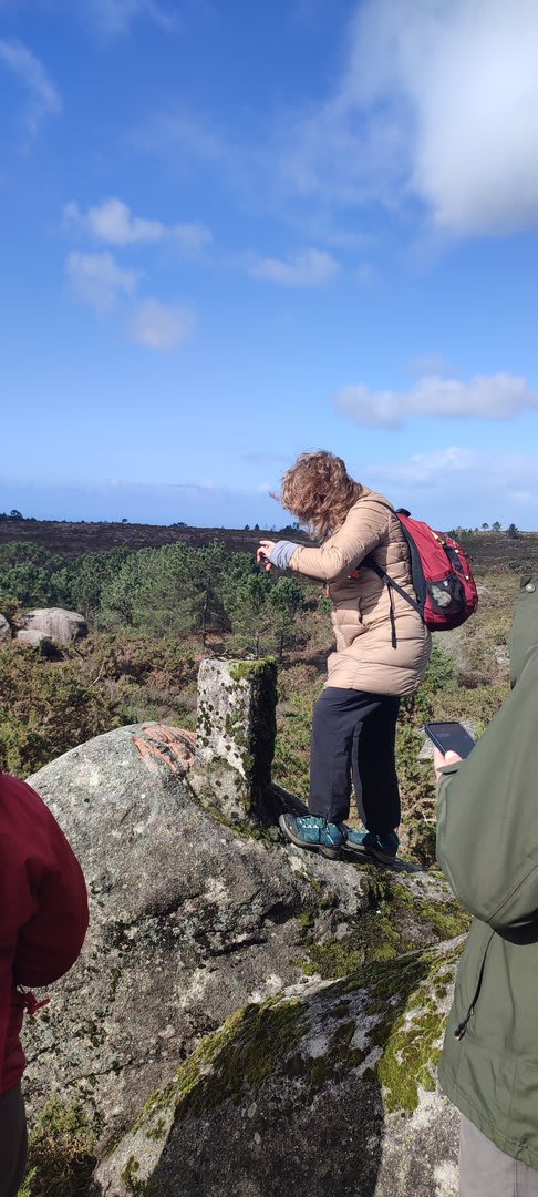 Após a foto de grupo e abandonando o talefe, com uma breve descida chegámos ao estradão florestal, local em que se inicia o retorno do percurso. Eis que surgiu a ideia de ir à procura do "Penedo da Era", já por nós visitado há já alguns anos. Após consulta ao grupo lá fomos então à sua procura, um pouco à descoberta — pois que não é tarefa fácil. Embrenhados num denso bosque de pinheiros, matos e com terrenos muito alagados, com algum custo lá conseguimos encontrar o dito penedo, onde se encontra assinalado com marcação e datação, e de onde parte a indicação dos limites territoriais das freguesias de Outeiro, Carreço, Afife e Areosa — locais antigamente muito disputados, mas hoje memória viva de árduos trabalhos de lavoura.