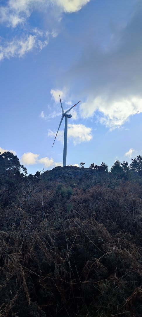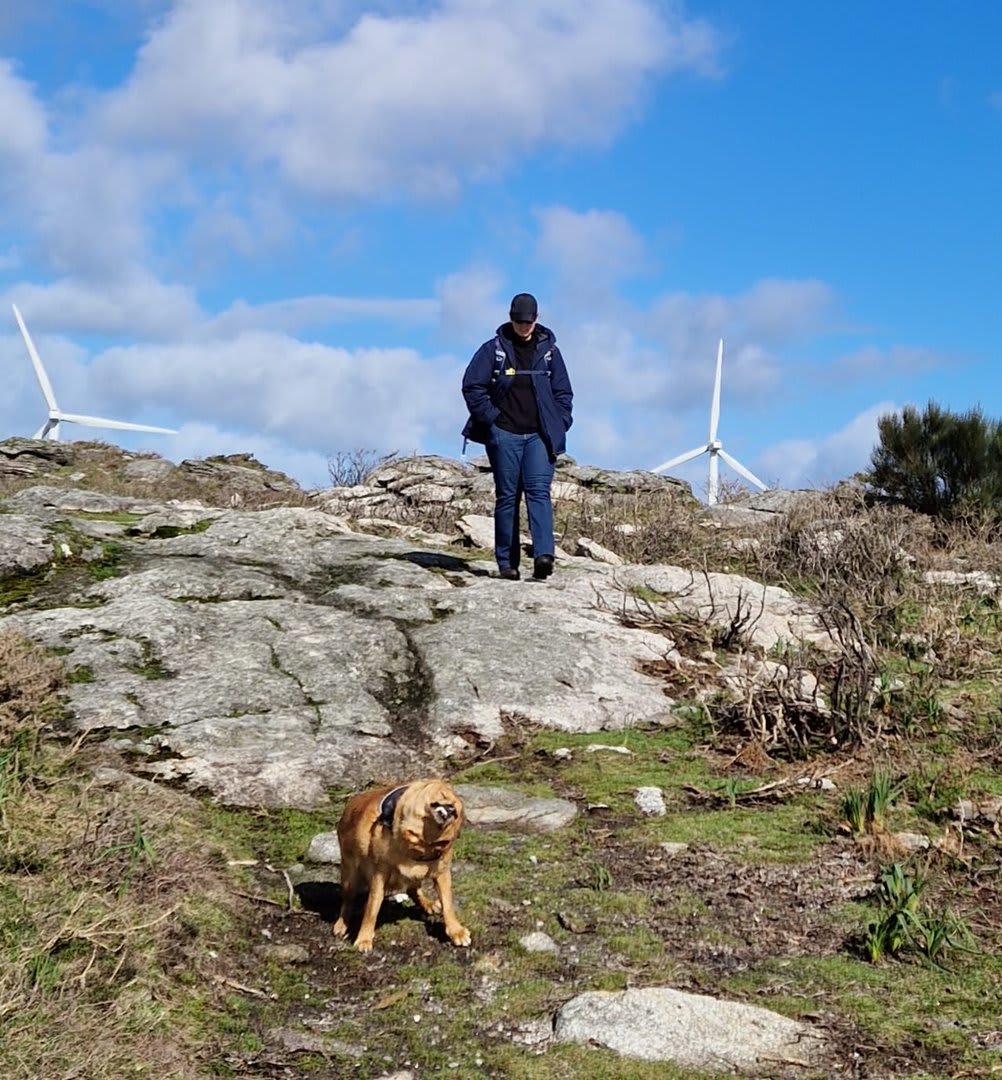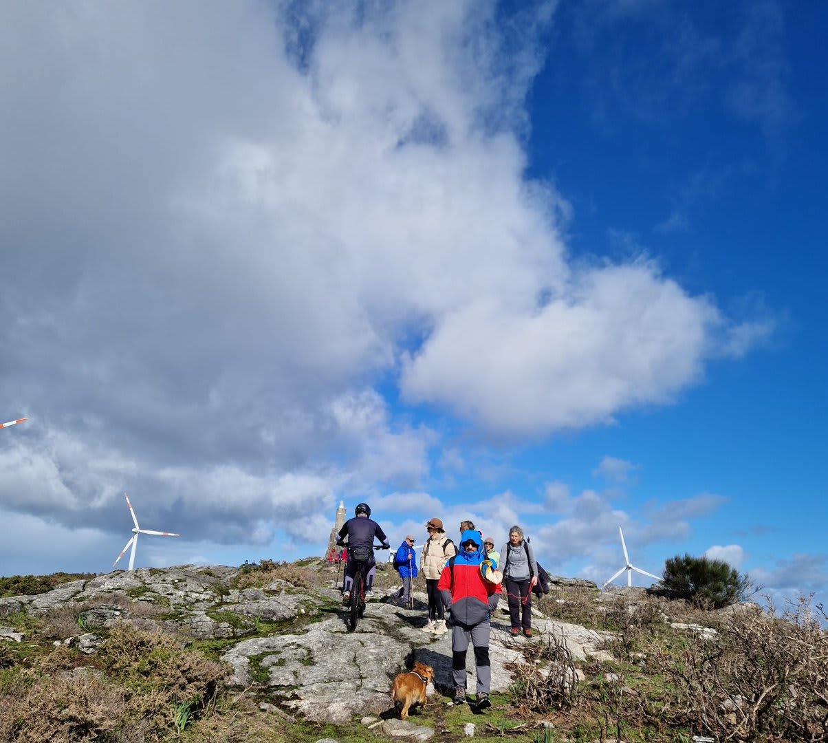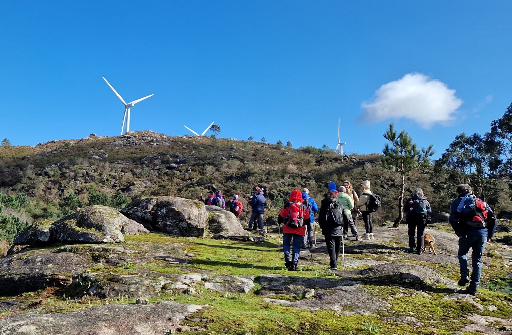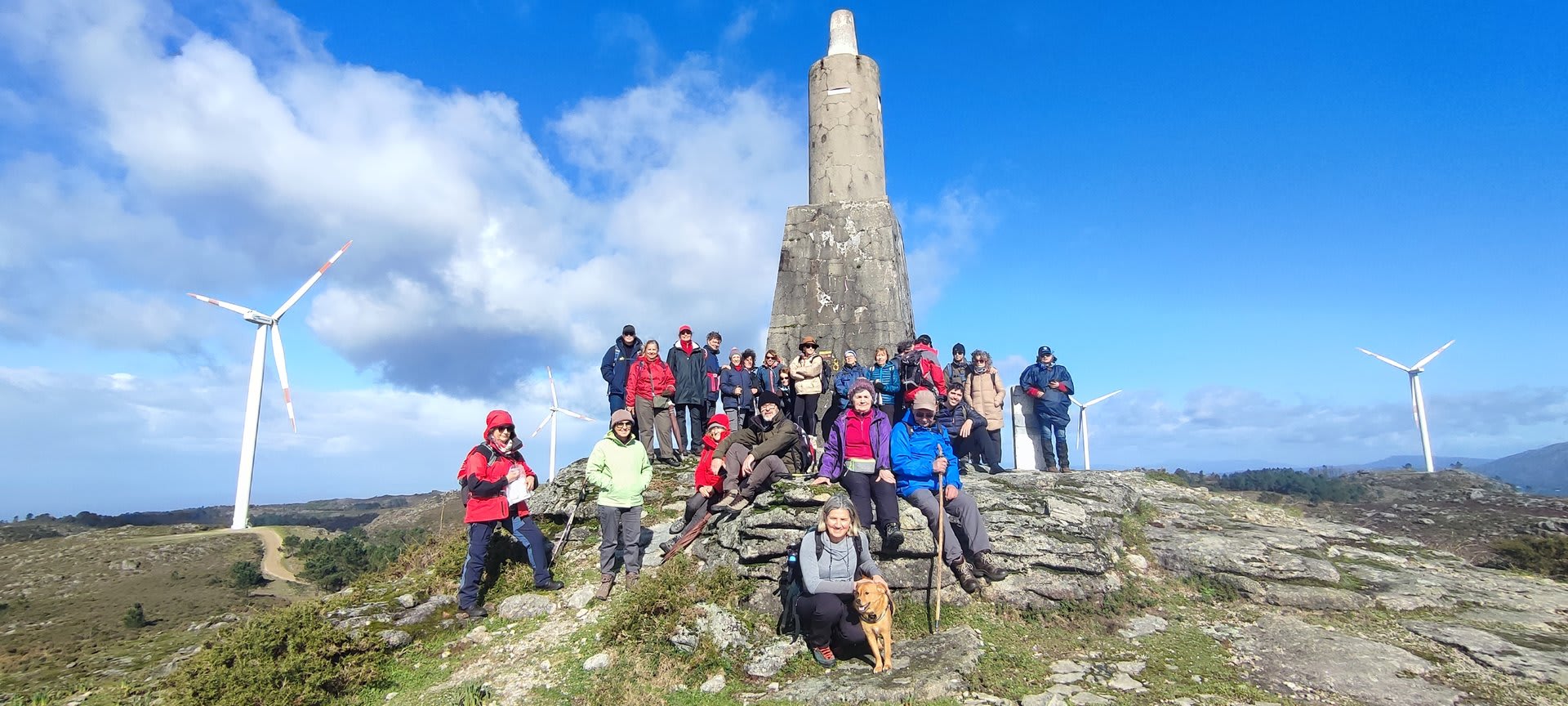 Lá chegados ao cruzamento da "Pereirada", foi aqui que estacionámos as viaturas junto de uma torre eólica das muitas existentes ao longo da Chão. Que frio! Já sem chuva e com o sol a aparecer por entre as nuvens, mas com um vento gélido, obrigando ao reforço dos agasalhos, cerca das 09h45 iniciámos a nossa caminhada. Na frente como a querer indicar-nos o caminho seguia o "colega" sempre atento à colocação da dona.