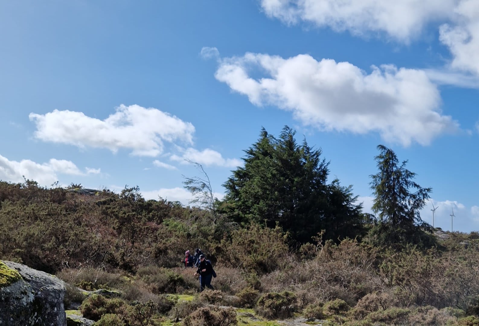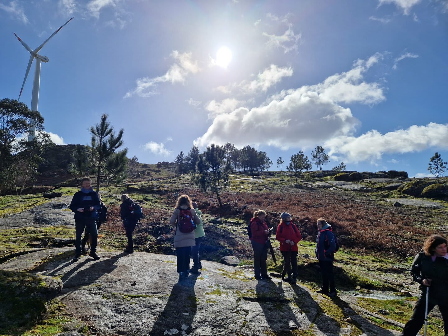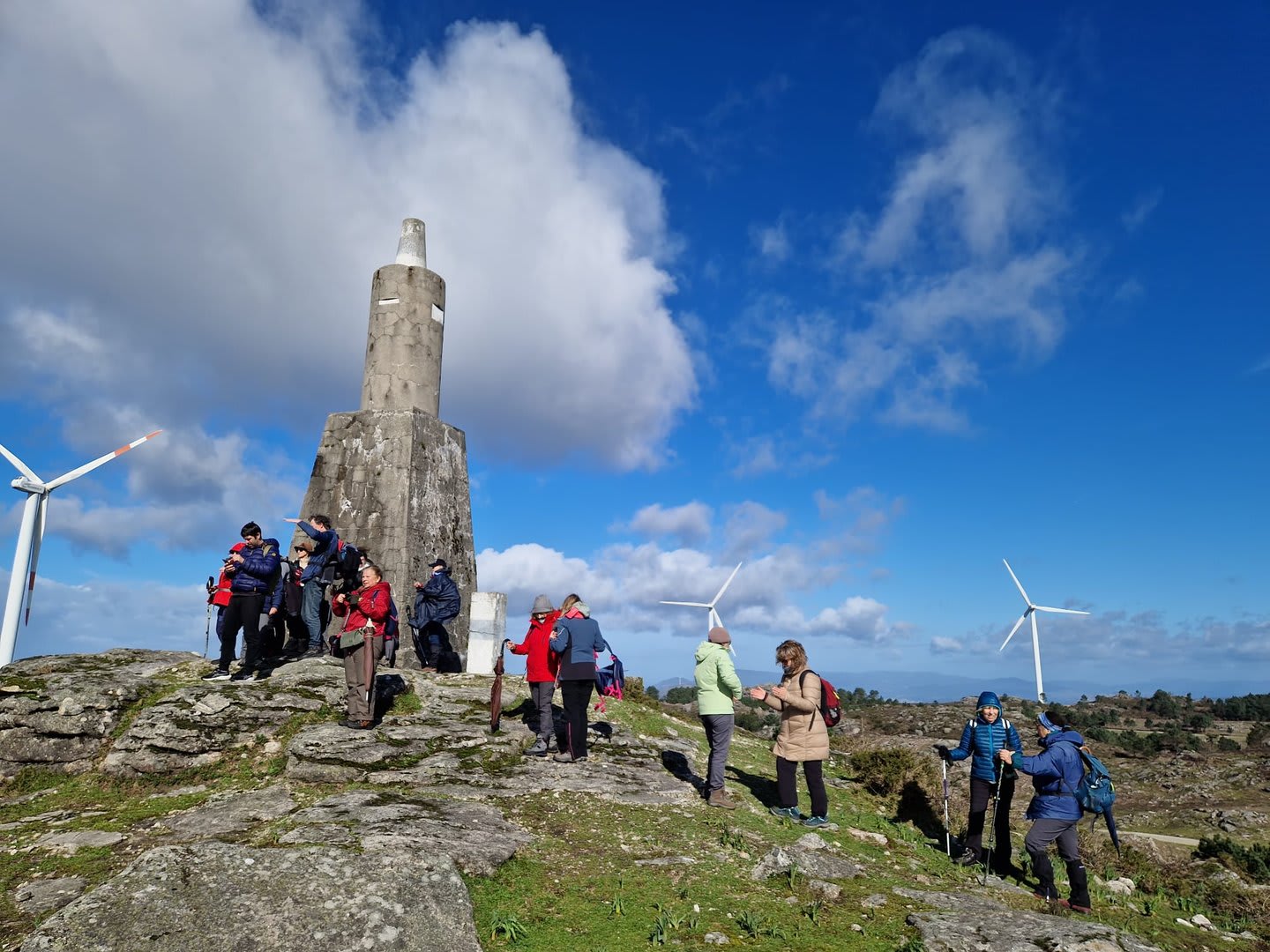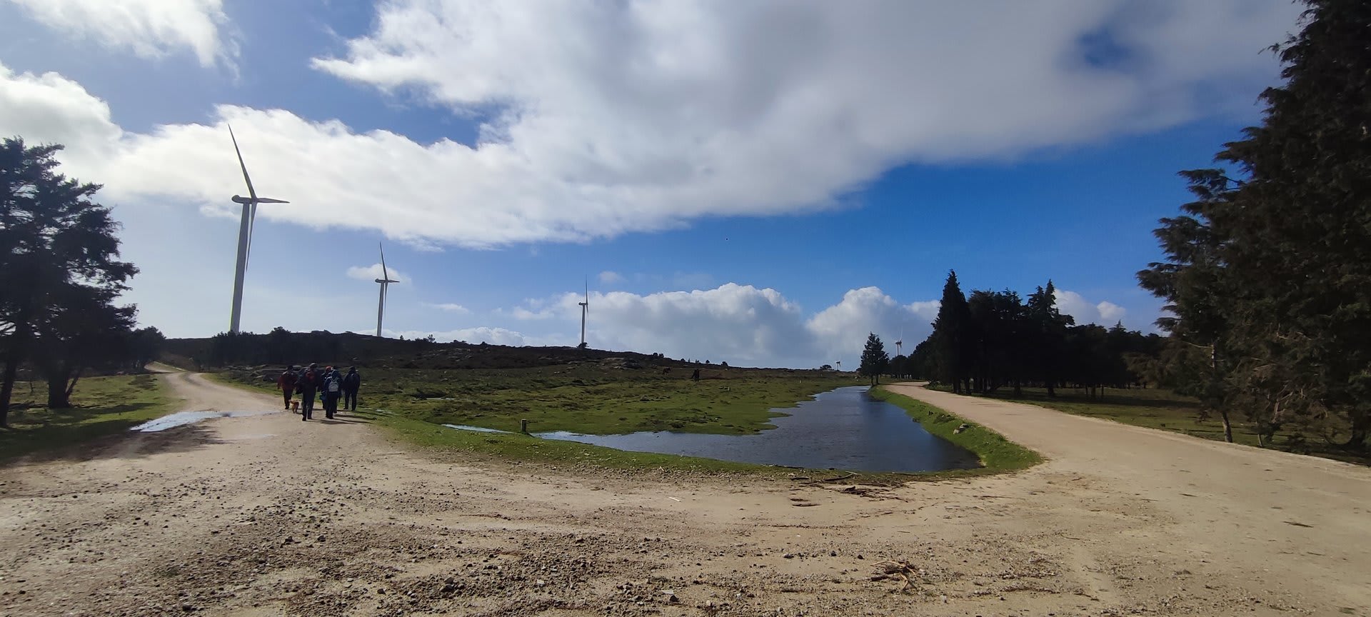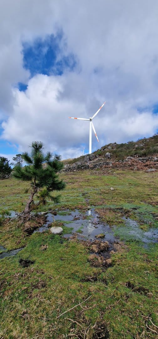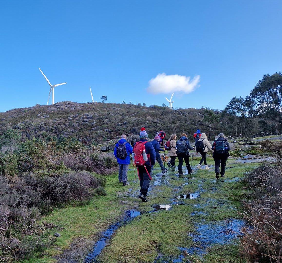 Lá chegados ao cruzamento da "Pereirada", foi aqui que estacionámos as viaturas junto de uma torre eólica das muitas existentes ao longo da Chão. Que frio! Já sem chuva e com o sol a aparecer por entre as nuvens, mas com um vento gélido, obrigando ao reforço dos agasalhos, cerca das 09h45 iniciámos a nossa caminhada. Na frente como a querer indicar-nos o caminho seguia o "colega" sempre atento à colocação da dona.