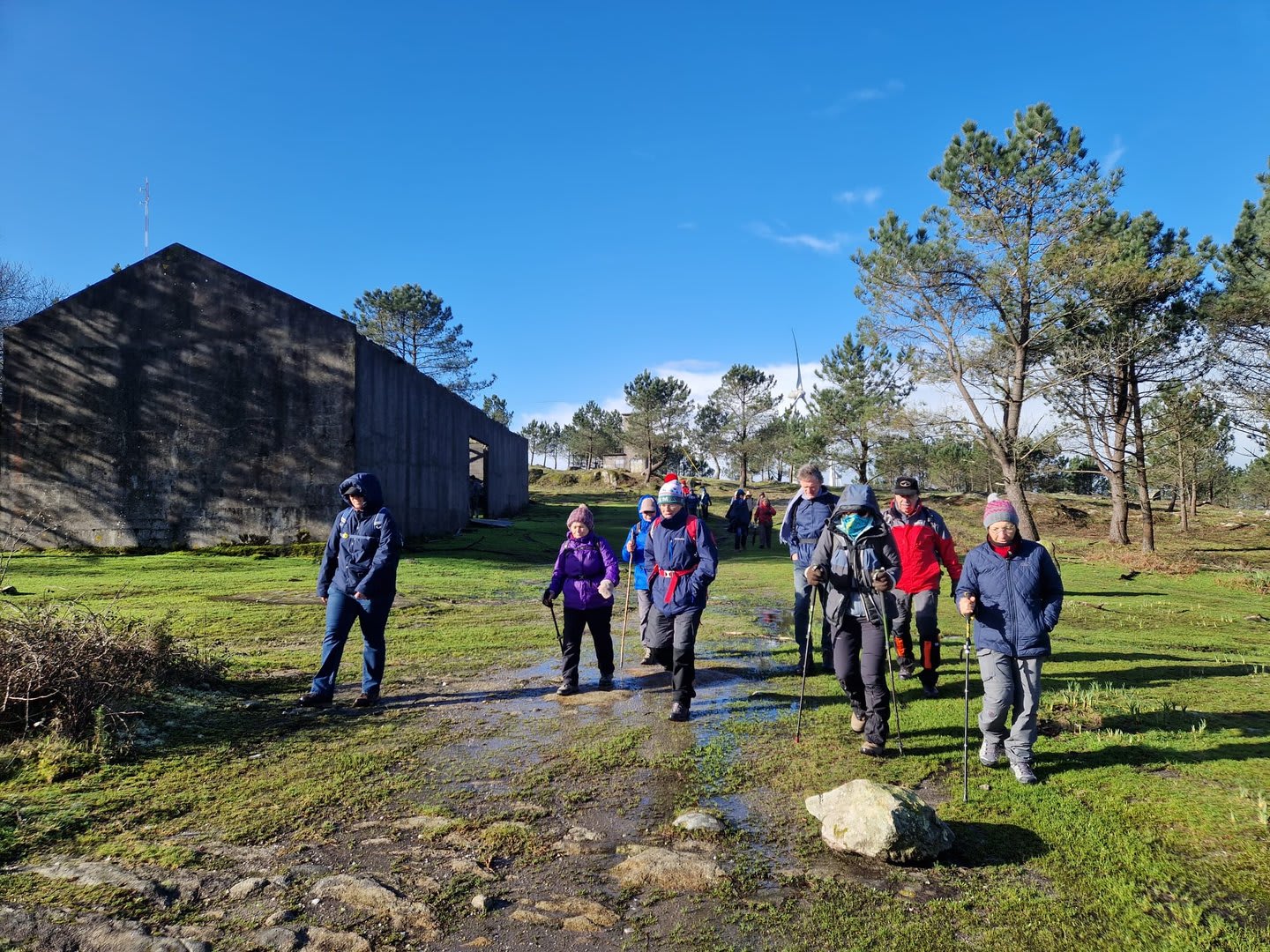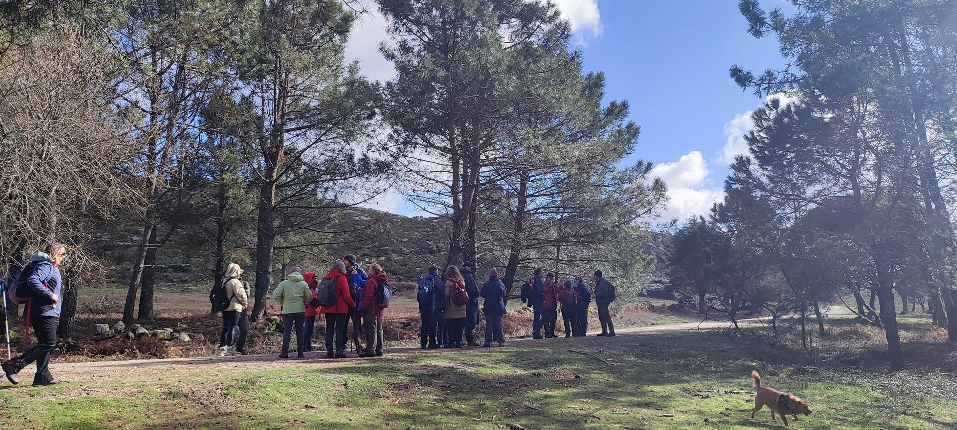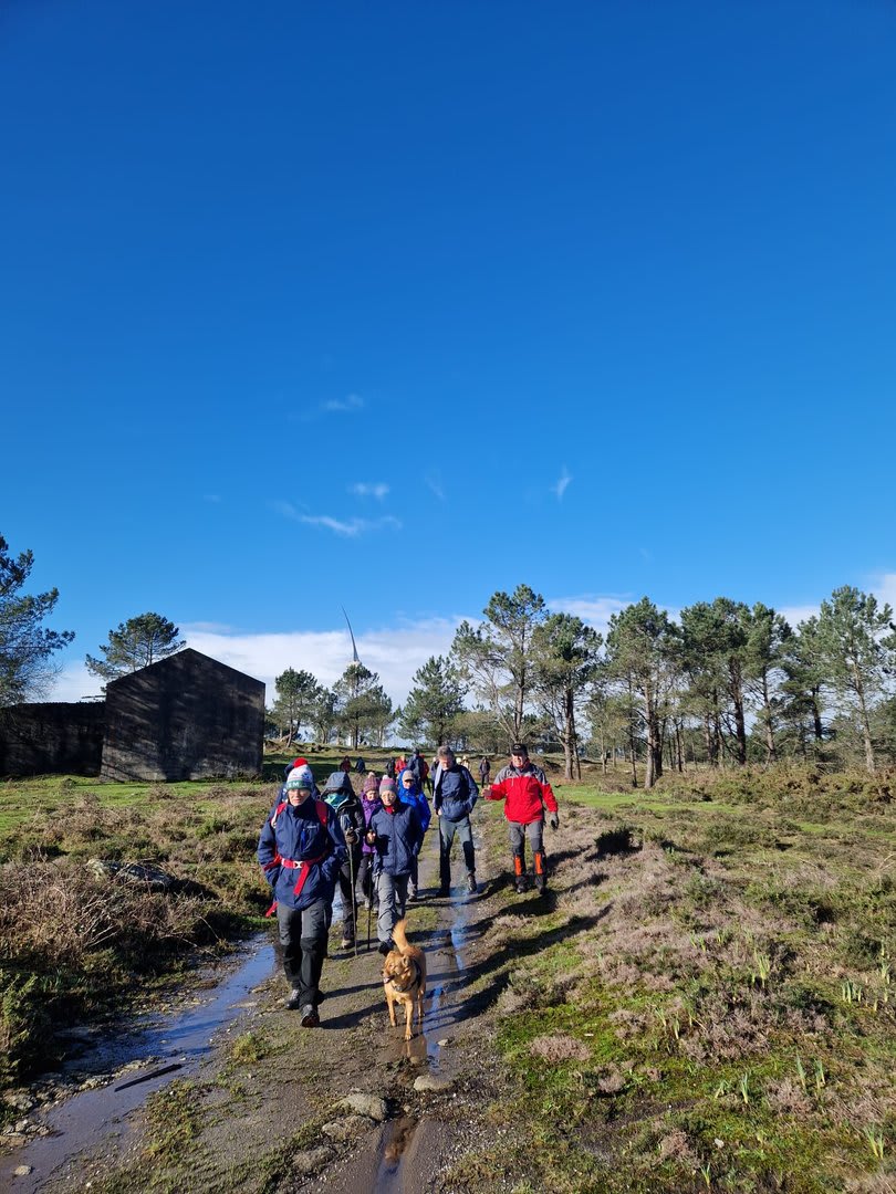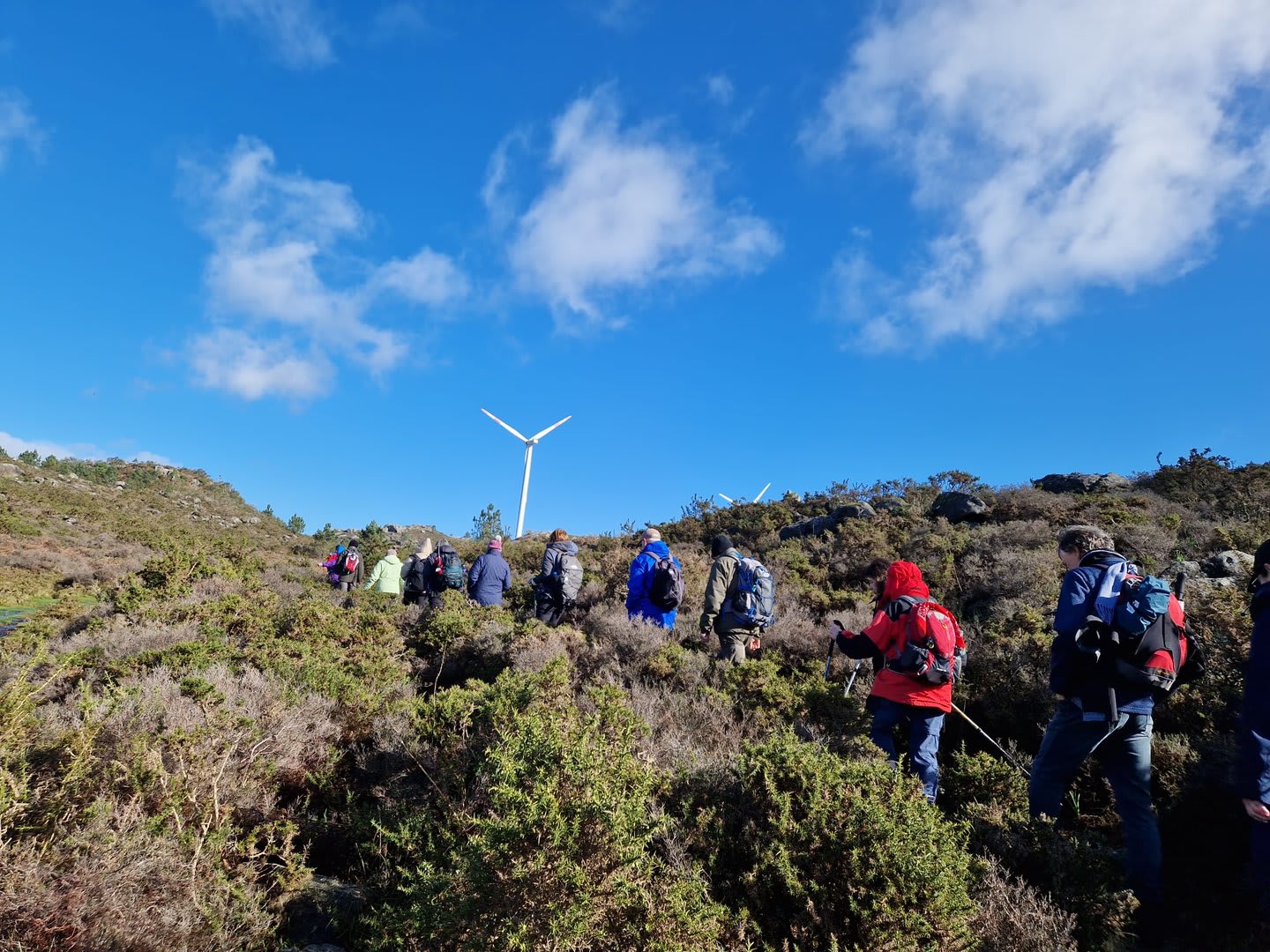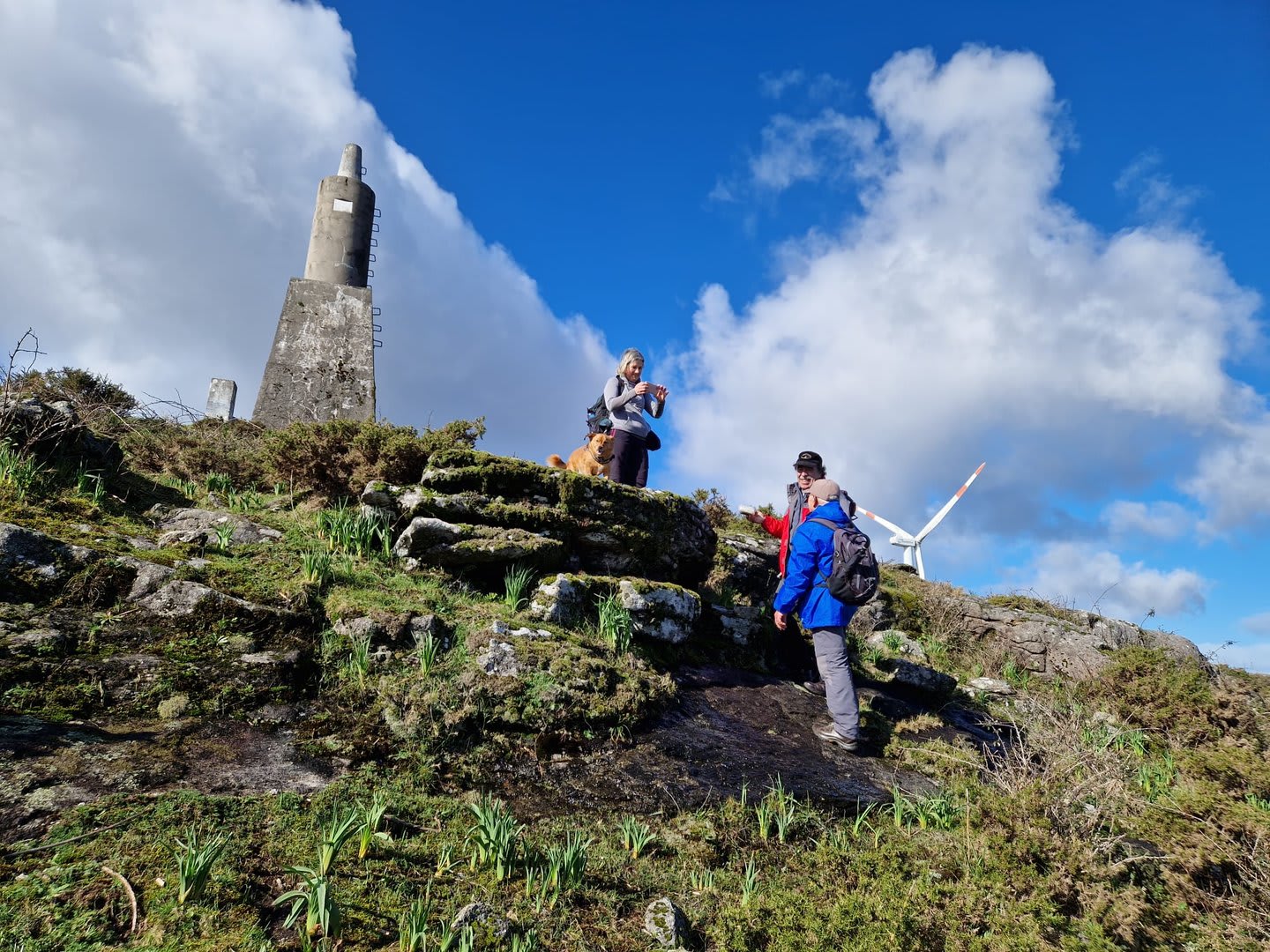 Lá chegados ao cruzamento da "Pereirada", foi aqui que estacionámos as viaturas junto de uma torre eólica das muitas existentes ao longo da Chão. Que frio! Já sem chuva e com o sol a aparecer por entre as nuvens, mas com um vento gélido, obrigando ao reforço dos agasalhos, cerca das 09h45 iniciámos a nossa caminhada. Na frente como a querer indicar-nos o caminho seguia o "colega" sempre atento à colocação da dona.