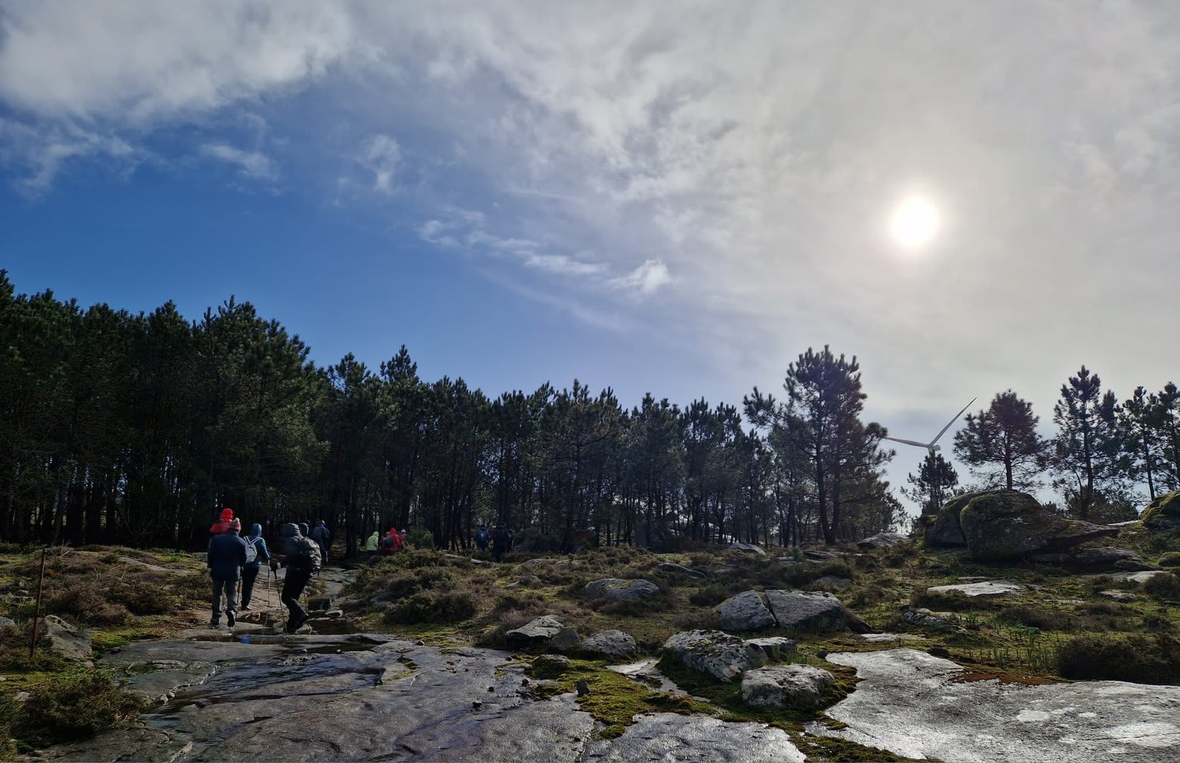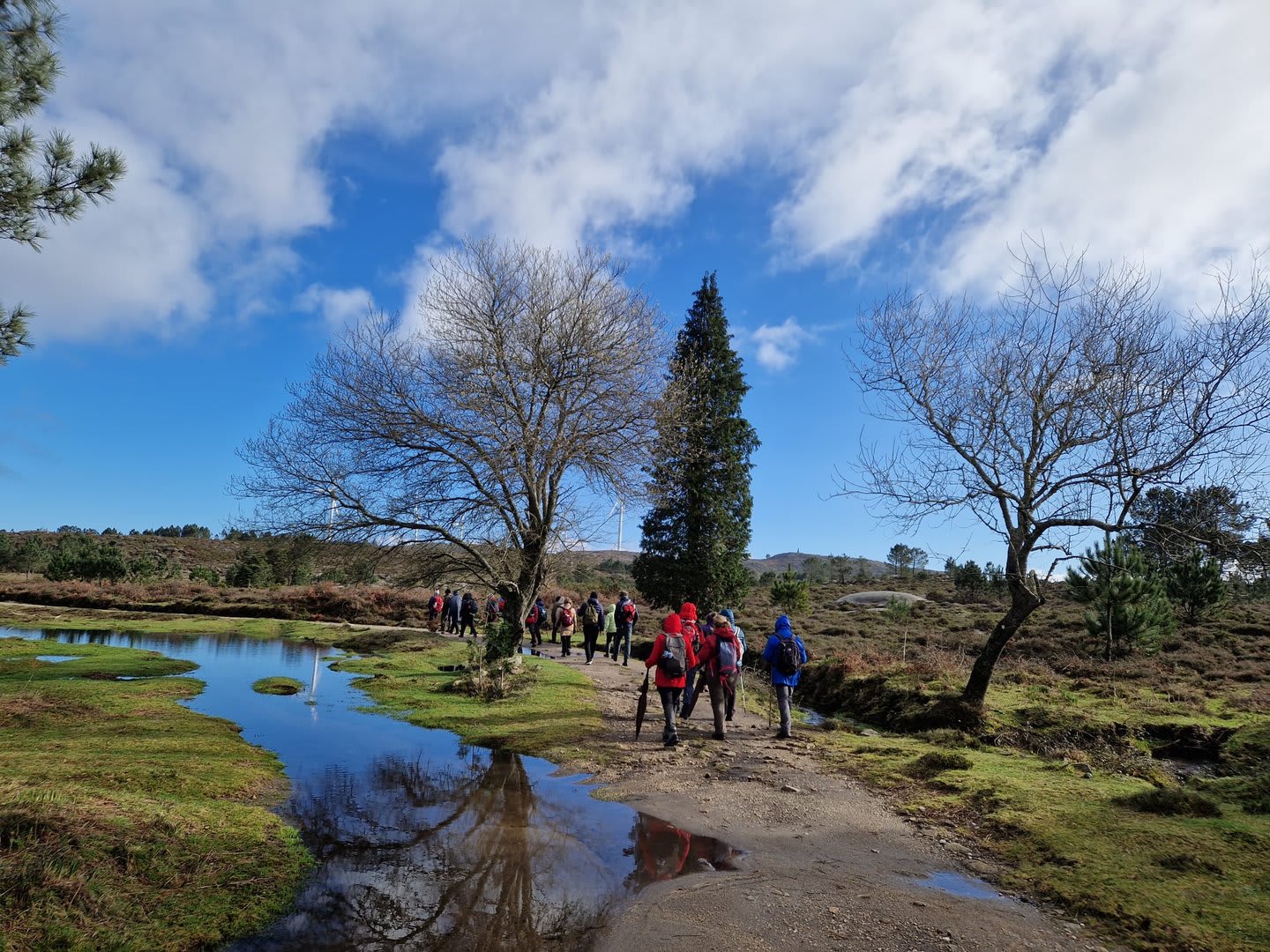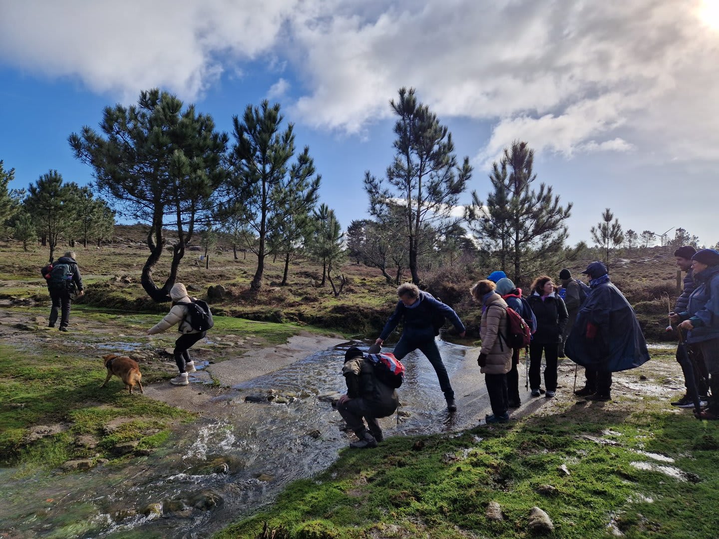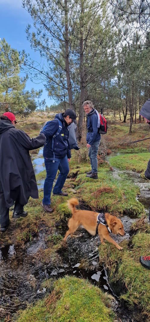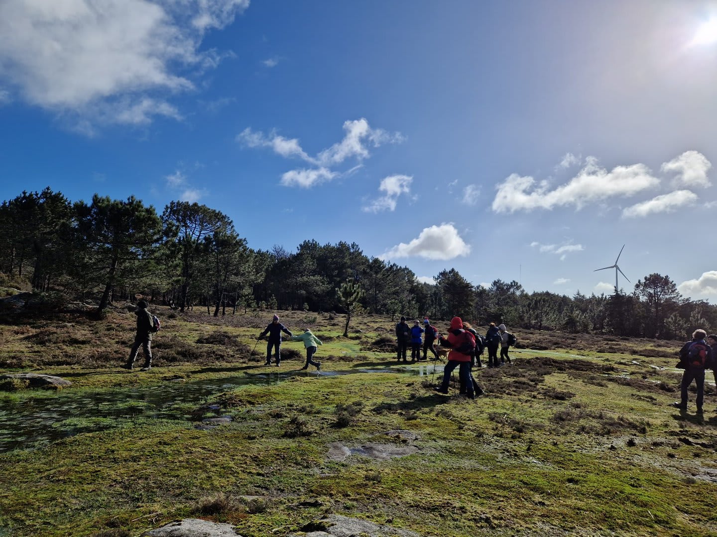 Lá chegados ao cruzamento da "Pereirada", foi aqui que estacionámos as viaturas junto de uma torre eólica das muitas existentes ao longo da Chão. Que frio! Já sem chuva e com o sol a aparecer por entre as nuvens, mas com um vento gélido, obrigando ao reforço dos agasalhos, cerca das 09h45 iniciámos a nossa caminhada. Na frente como a querer indicar-nos o caminho seguia o "colega" sempre atento à colocação da dona.