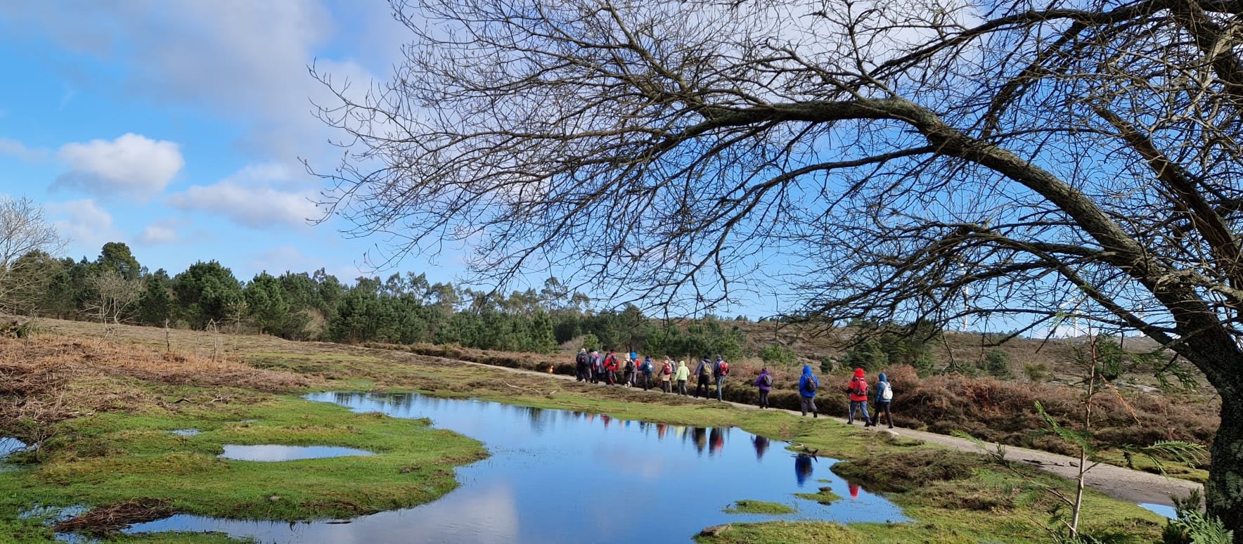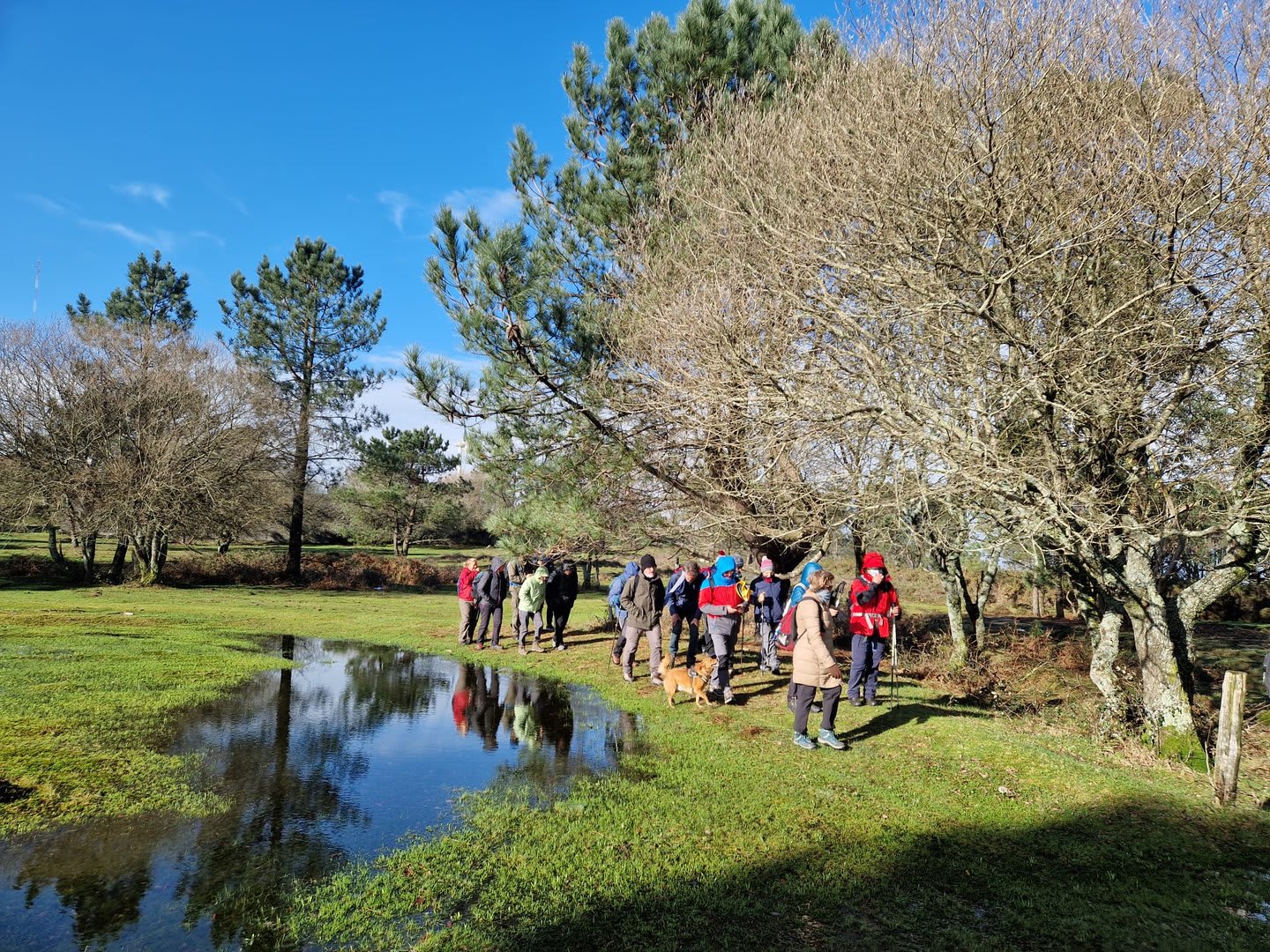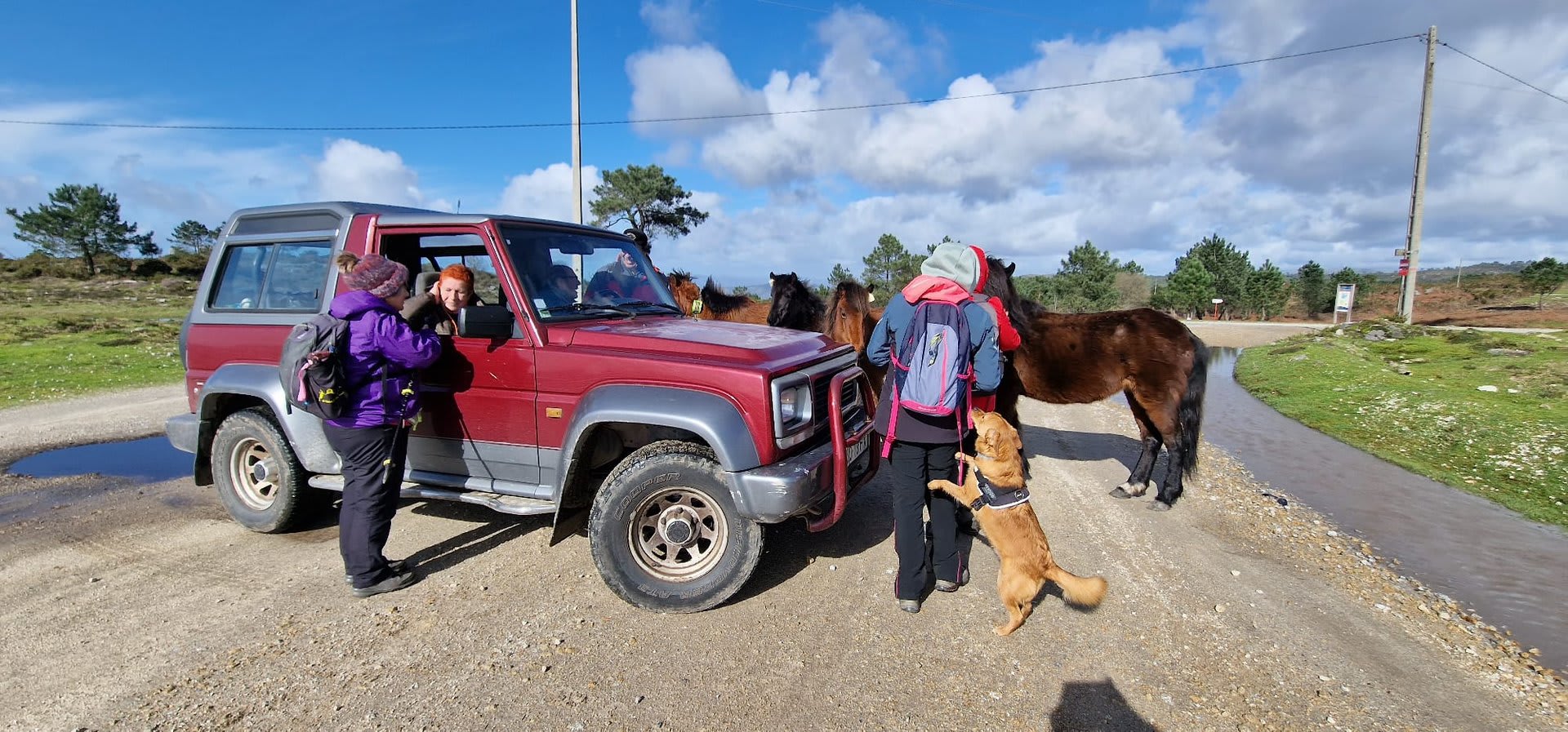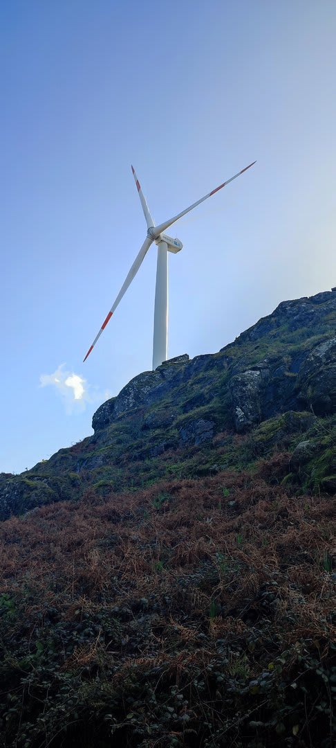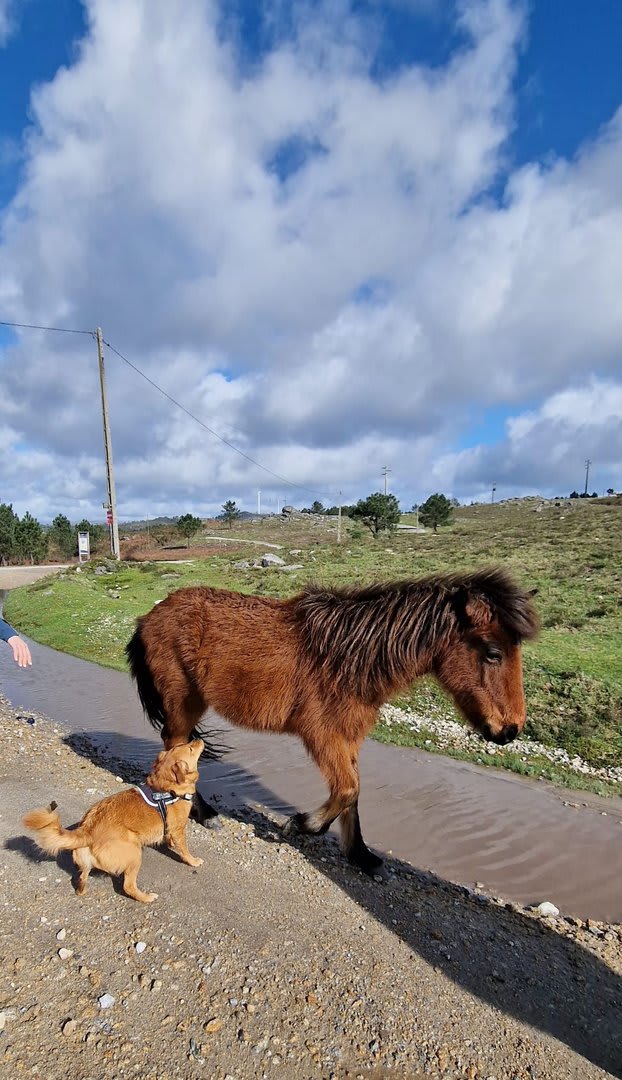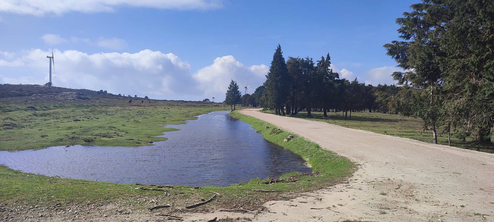 Lá chegados ao cruzamento da "Pereirada", foi aqui que estacionámos as viaturas junto de uma torre eólica das muitas existentes ao longo da Chão. Que frio! Já sem chuva e com o sol a aparecer por entre as nuvens, mas com um vento gélido, obrigando ao reforço dos agasalhos, cerca das 09h45 iniciámos a nossa caminhada. Na frente como a querer indicar-nos o caminho seguia o "colega" sempre atento à colocação da dona.