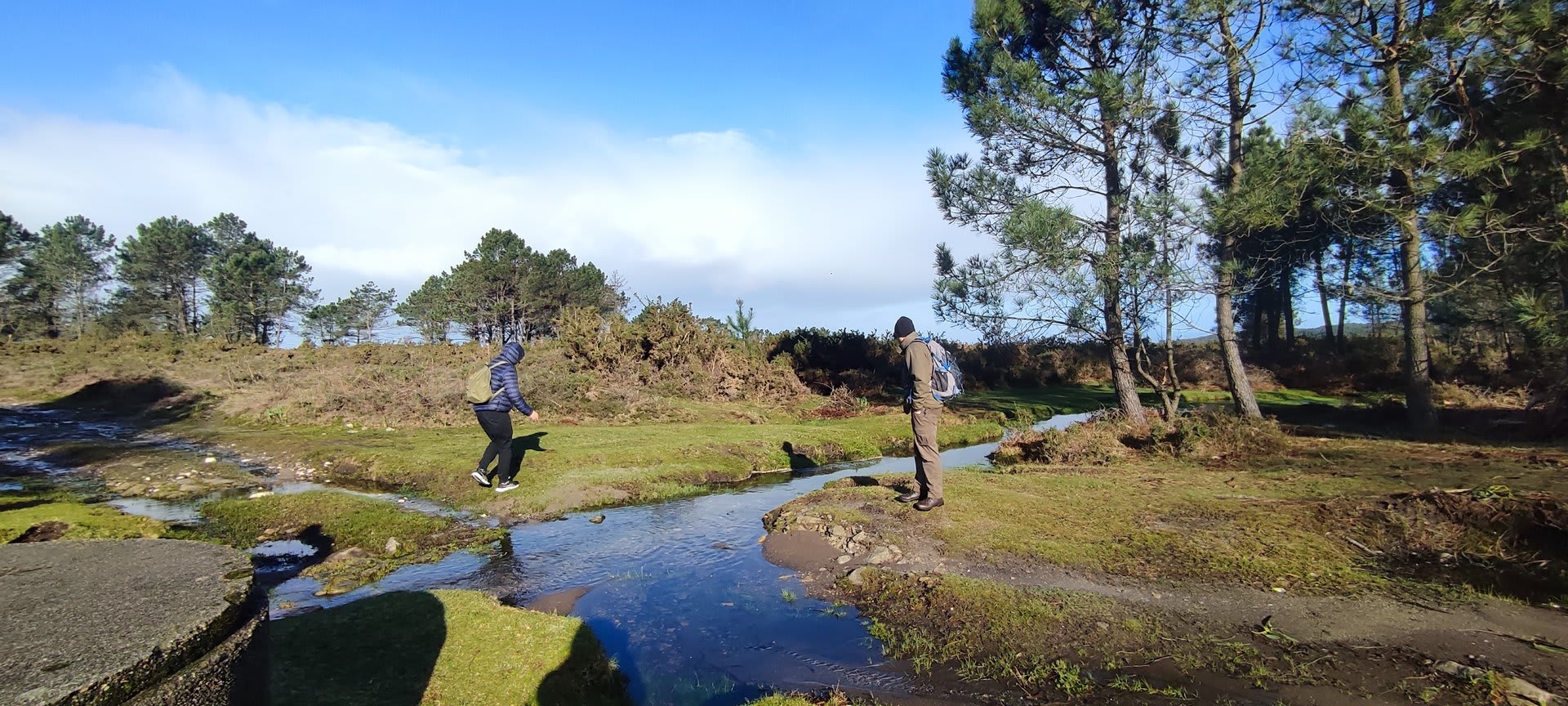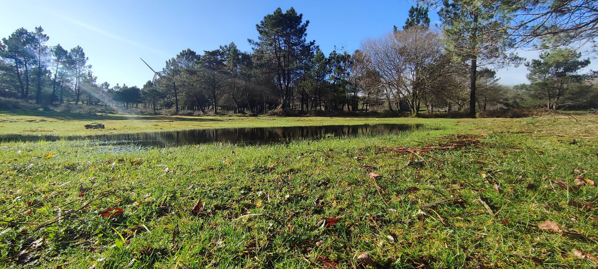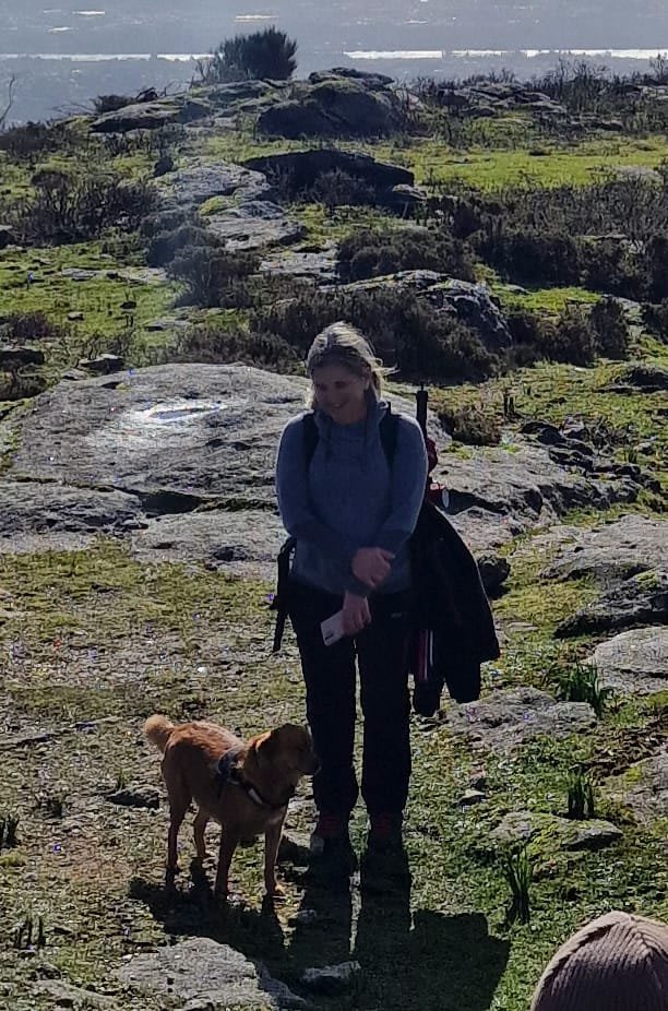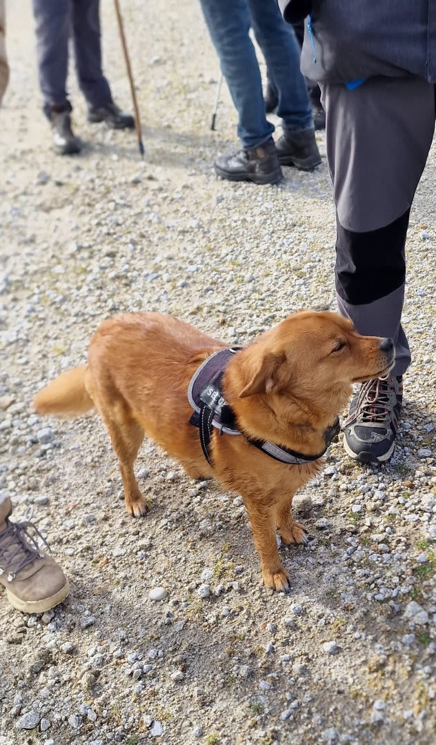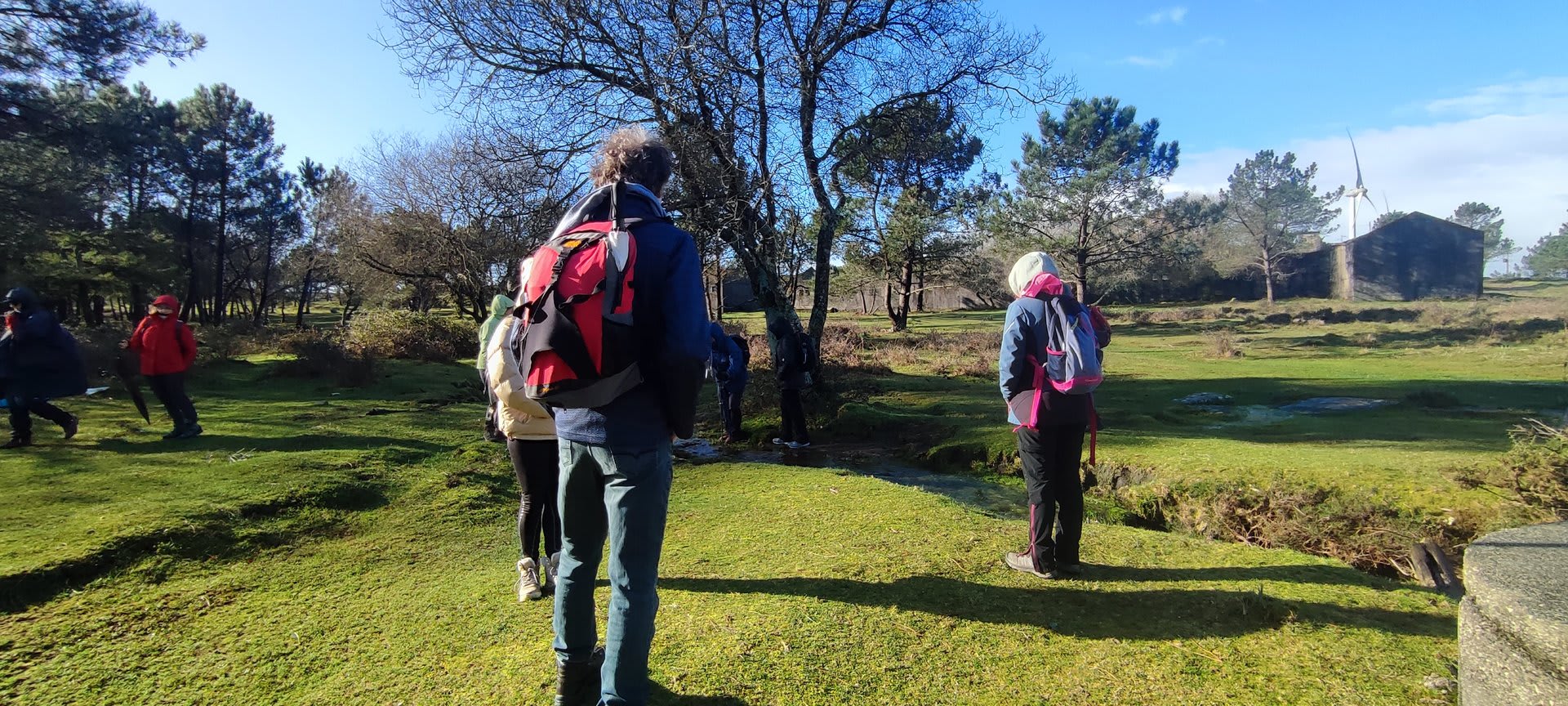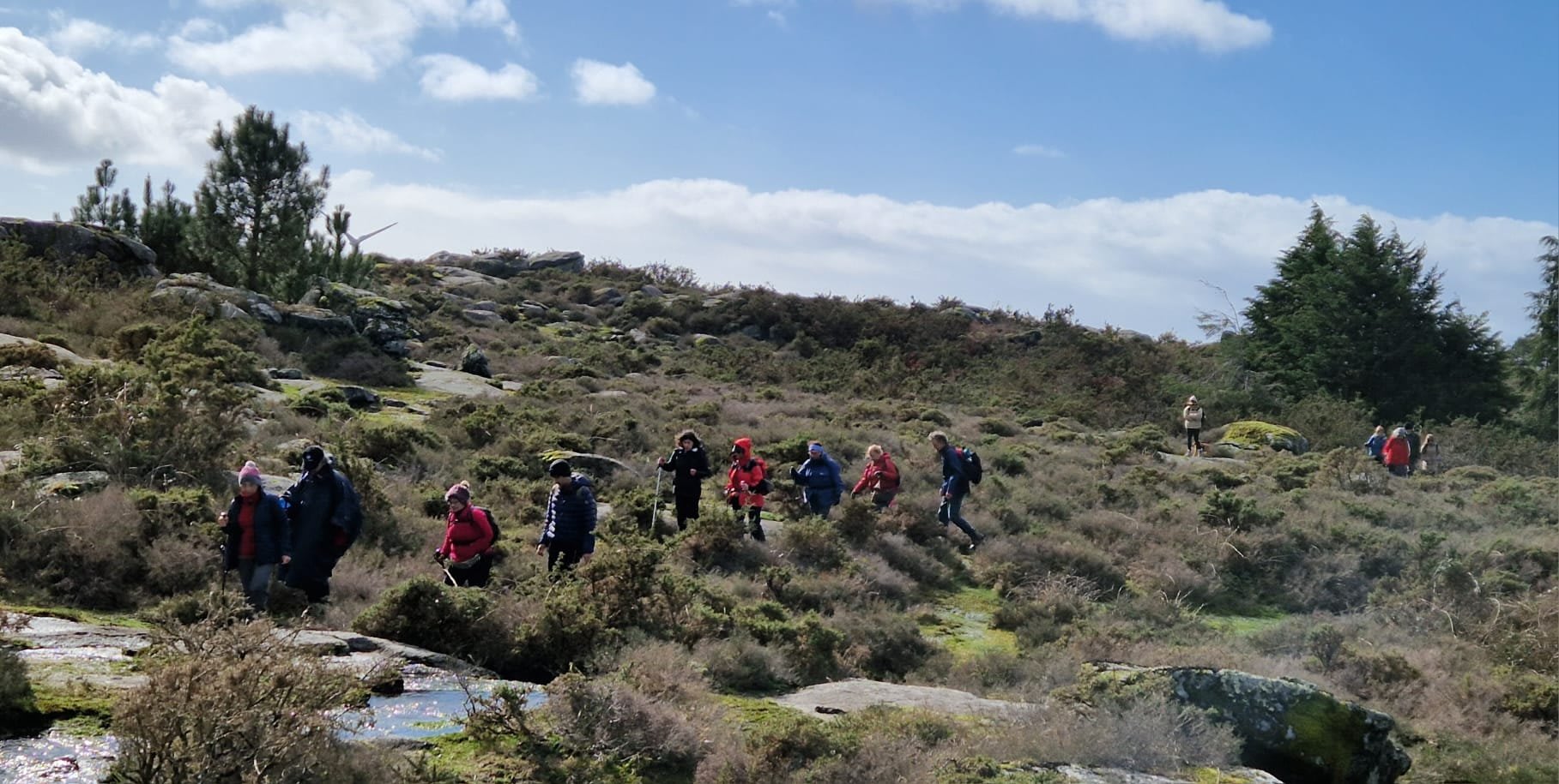 Lá chegados ao cruzamento da "Pereirada", foi aqui que estacionámos as viaturas junto de uma torre eólica das muitas existentes ao longo da Chão. Que frio! Já sem chuva e com o sol a aparecer por entre as nuvens, mas com um vento gélido, obrigando ao reforço dos agasalhos, cerca das 09h45 iniciámos a nossa caminhada. Na frente como a querer indicar-nos o caminho seguia o "colega" sempre atento à colocação da dona.