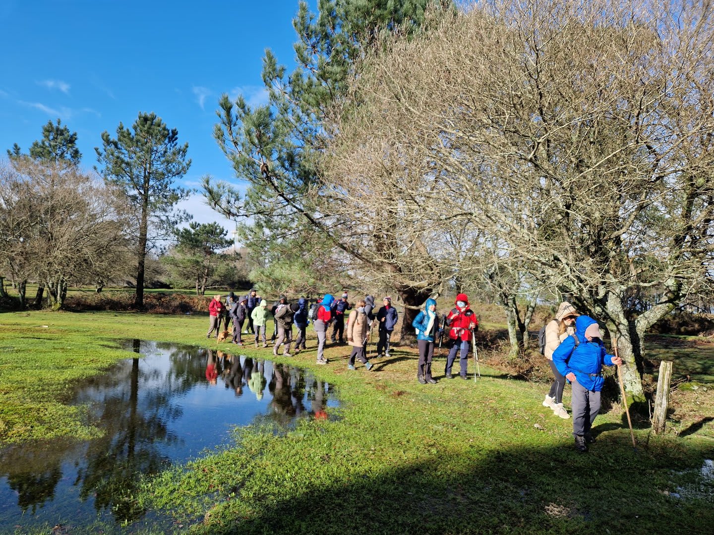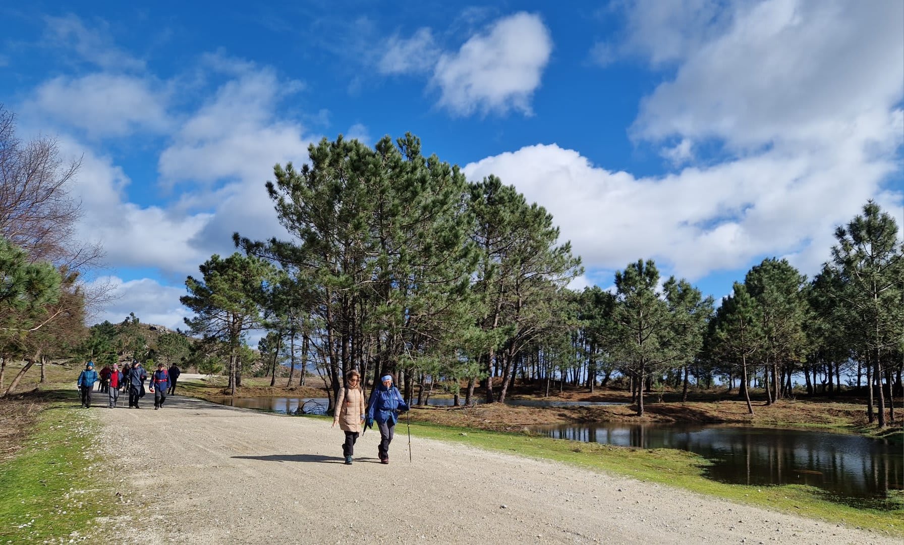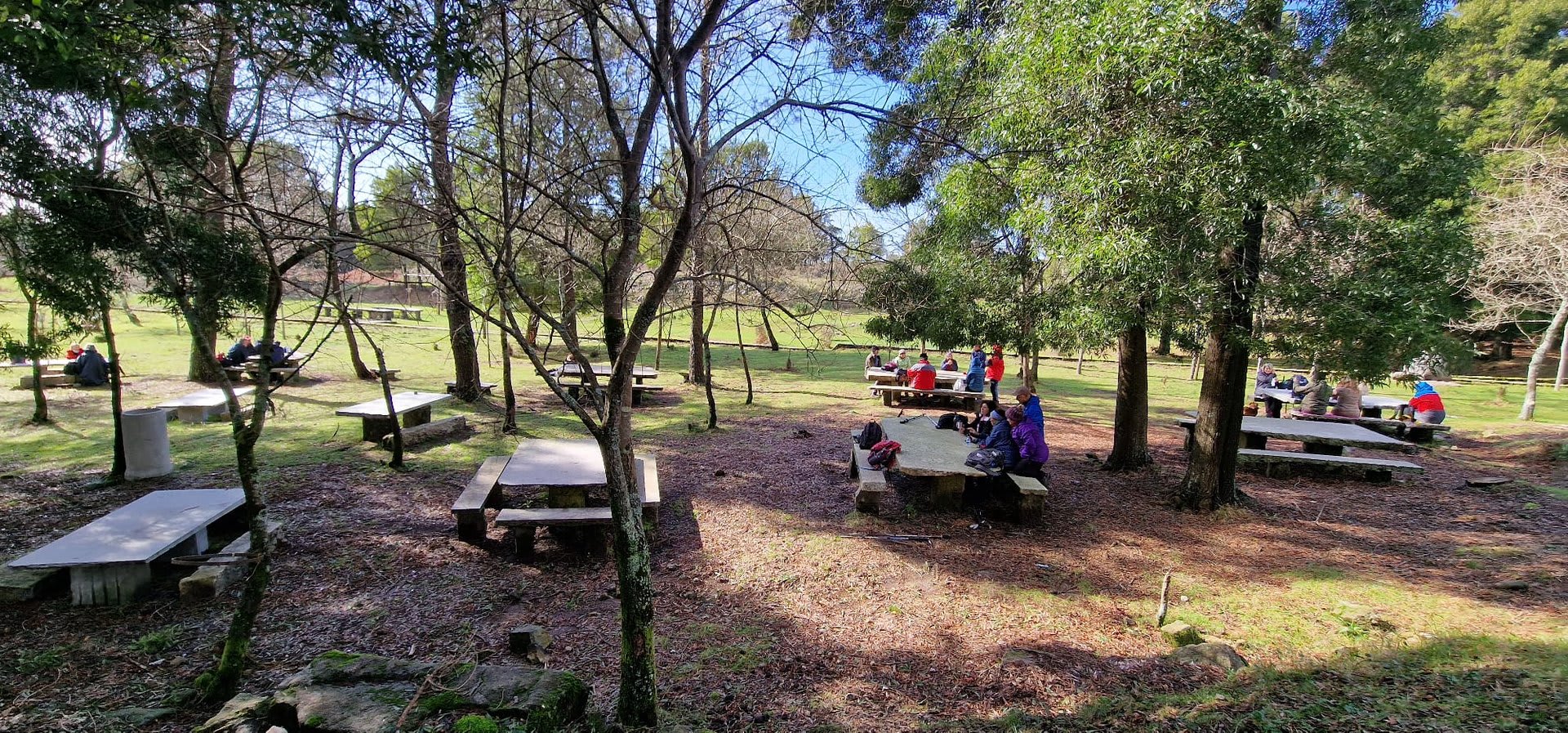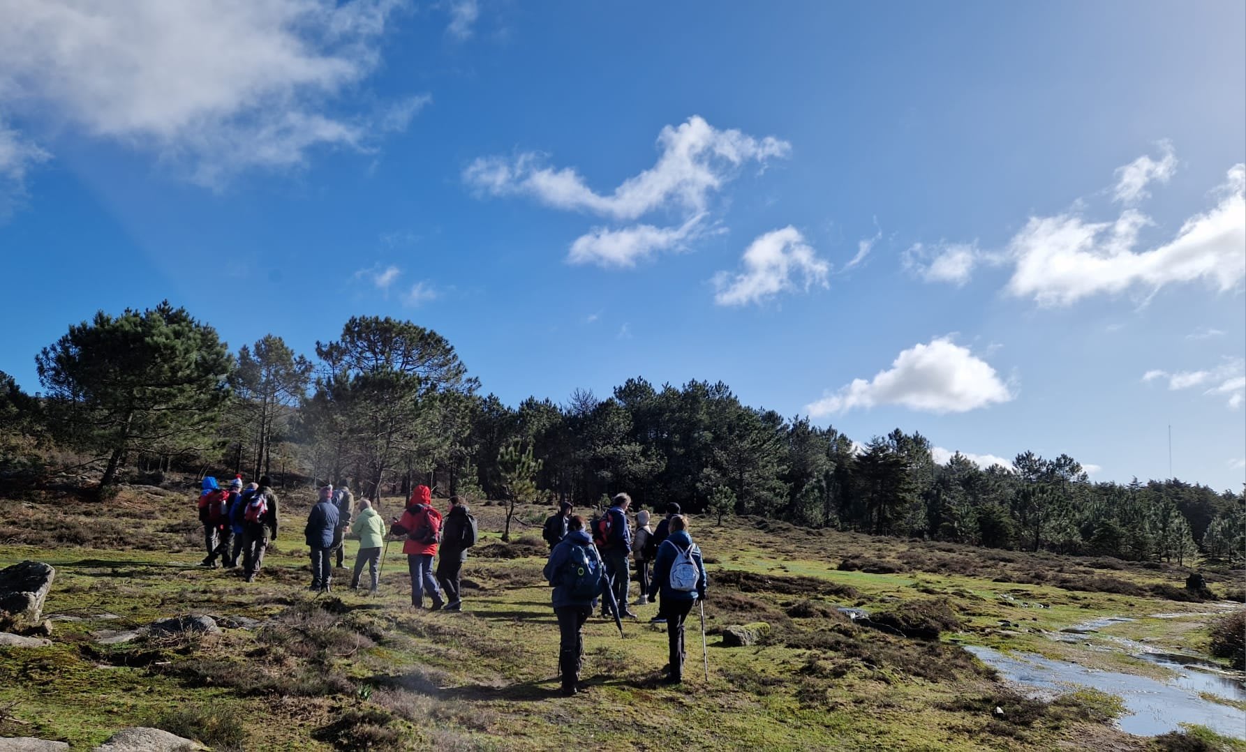 Aqui, após a foto de grupo e voltando ao estradão, iniciámos o regresso caminhando ao longo da Chão até atingirmos o local do antigo viveiro florestal da "Fonte Louçã", onde bem perto nasce o rio do Pêgo ou rio de Areosa. Este local está agora bem tratado, com um parque de merendas com várias mesas e um bom tanque de água que no verão faz as delícias de quem lá está. Aqui foi feito o almoço e um merecido repouso.